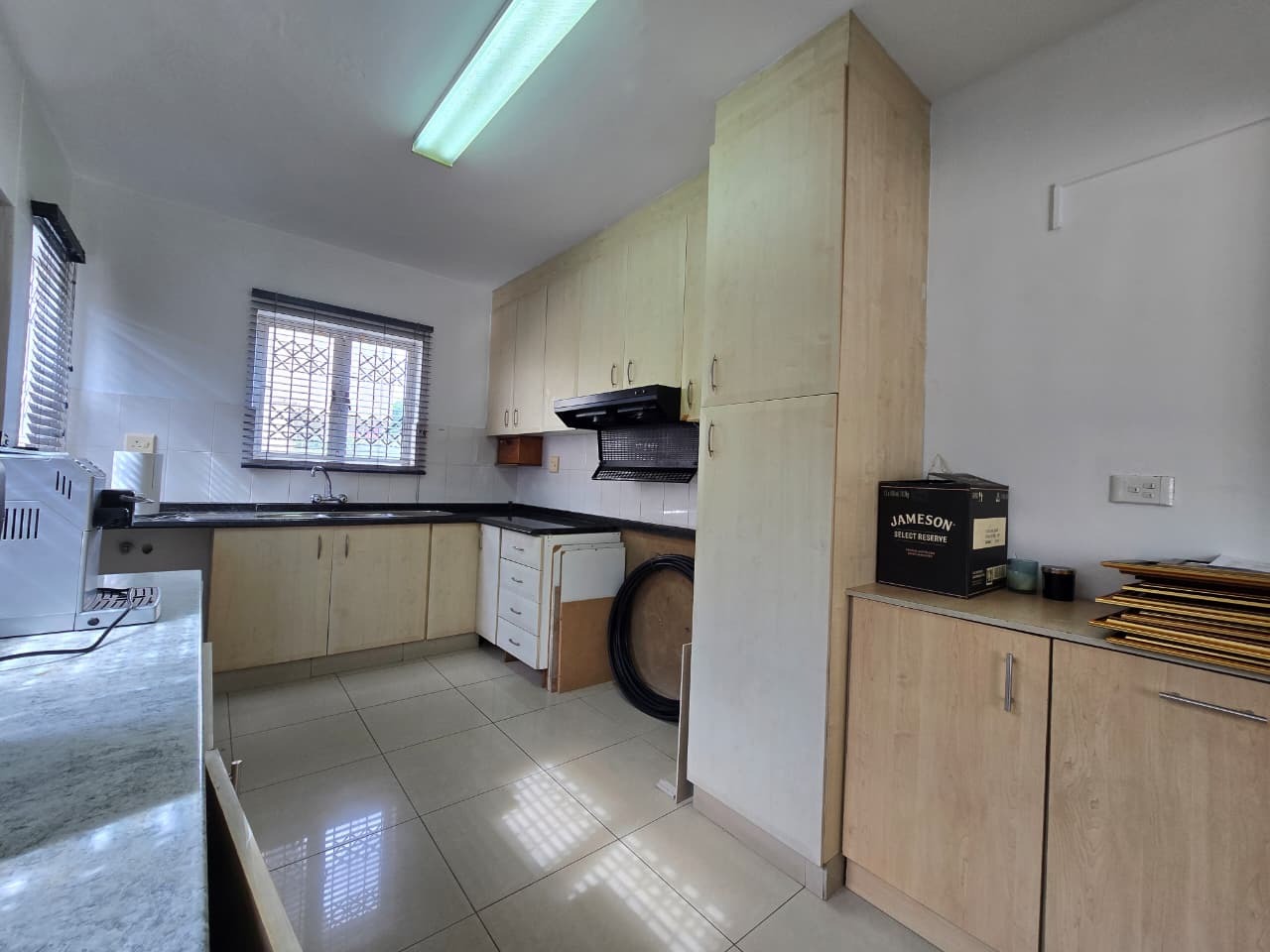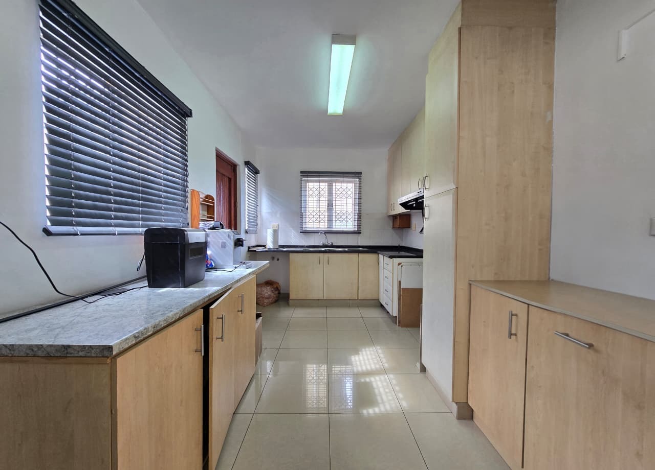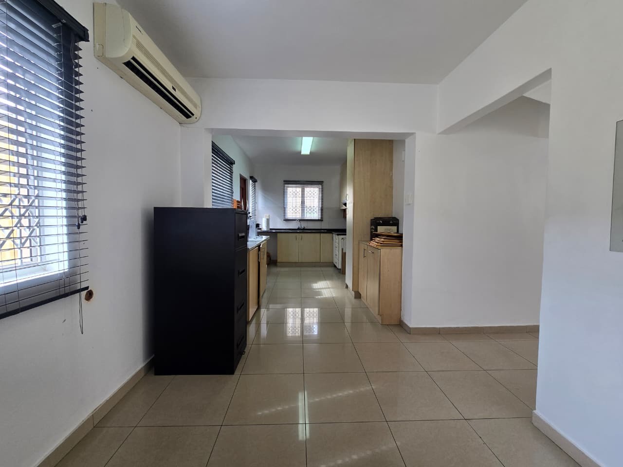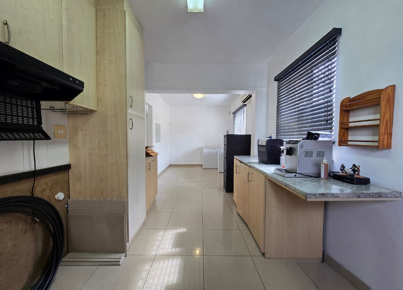 Step inside this 135 sqm home to discover a well-maintained interior featuring clean, light-colored tiled flooring and neutral white walls throughout. The open-plan design seamlessly connects the lounge and dining areas, creating a versatile living space. The functional kitchen boasts ample light wood cabinetry, dark countertops, and a tiled backsplash, providing generous storage and preparation space. Multiple air conditioning units ensure comfort, while a battery inverter offers energy resilience.