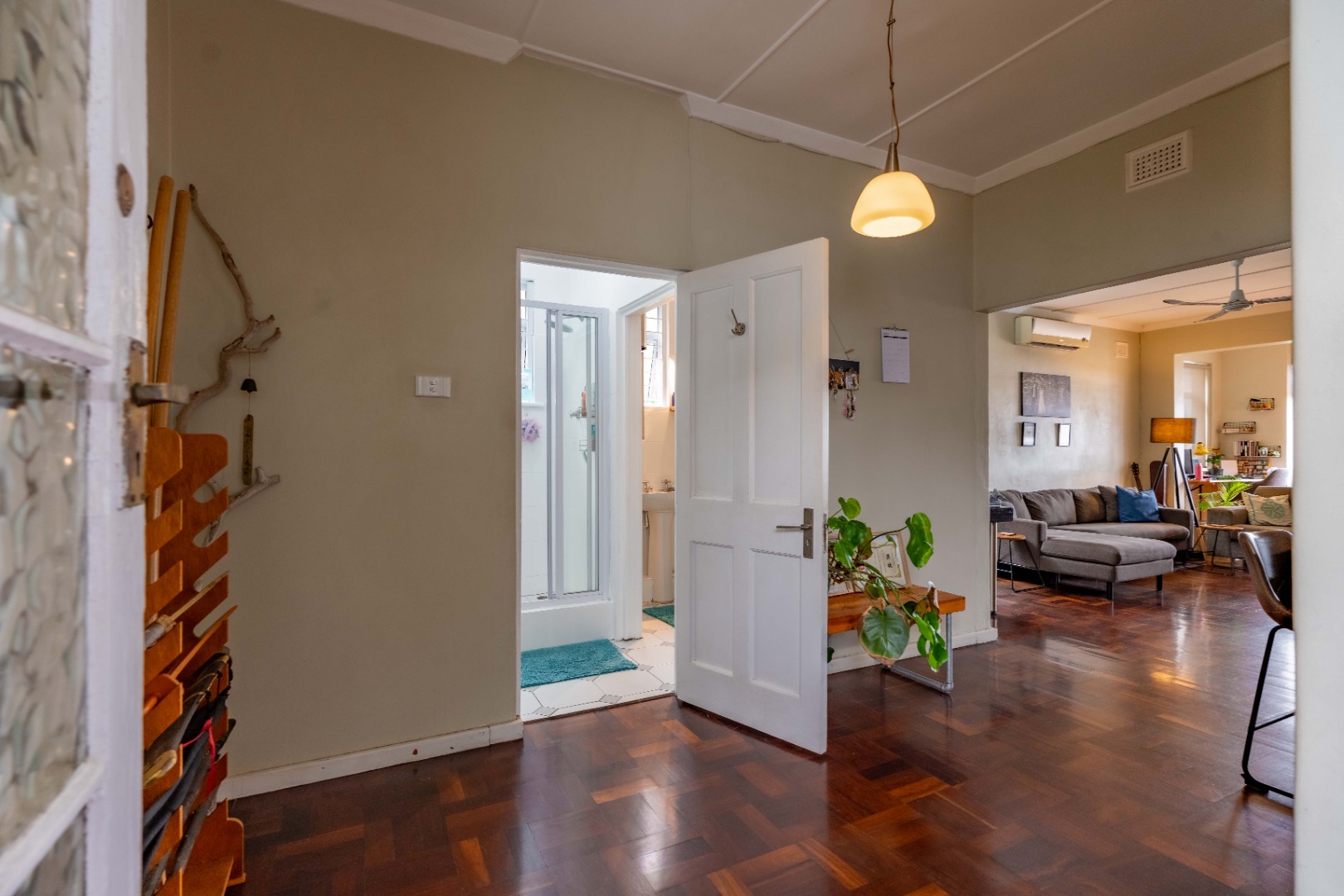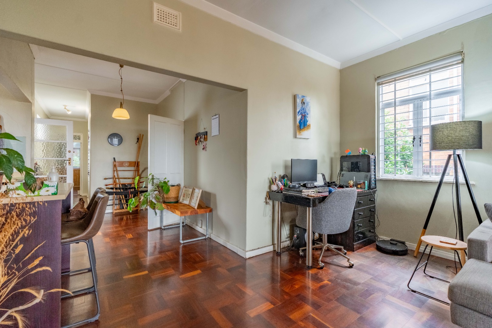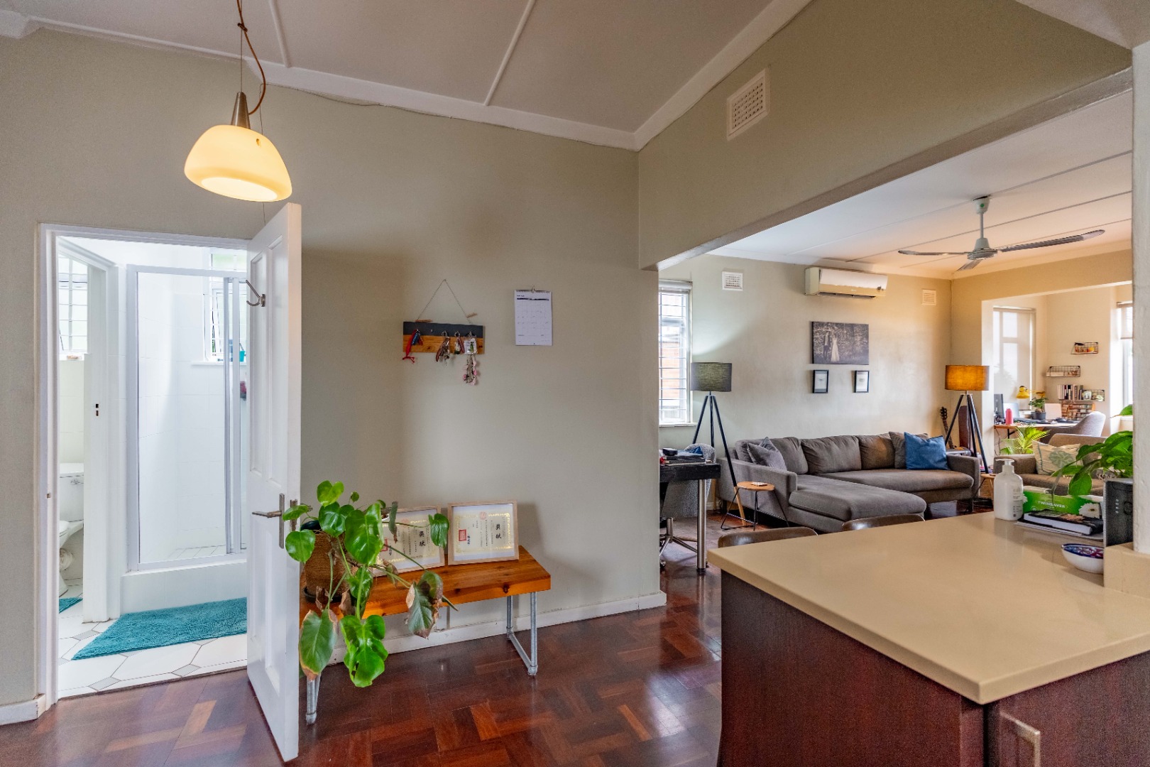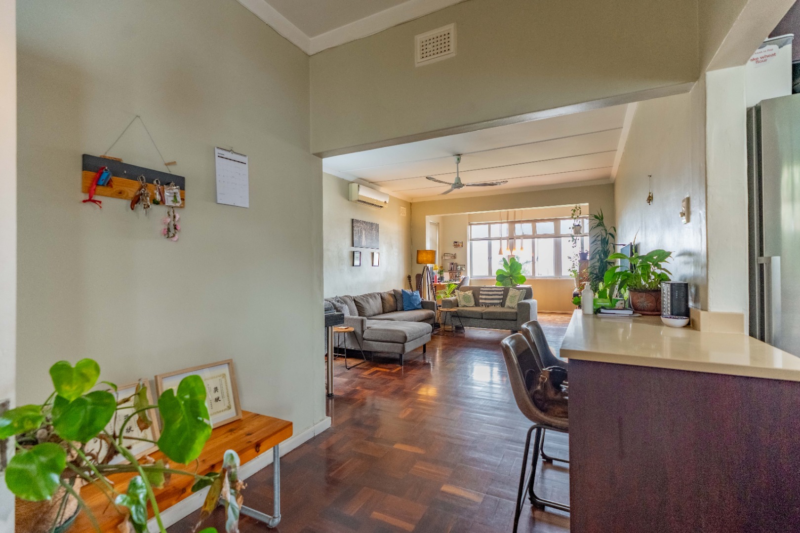 Inside, you’ll find warm parquet flooring and a light-filled open-plan lounge and dining area. A standout feature is the custom-fitted window seat, offering stunning views of the Berea and harbour—a tranquil spot to unwind that also doubles as a sleeper couch. Tucked alongside is a compact study nook, perfect for remote work or quiet reading, all secured with well-fitted burglar guards for added safety.