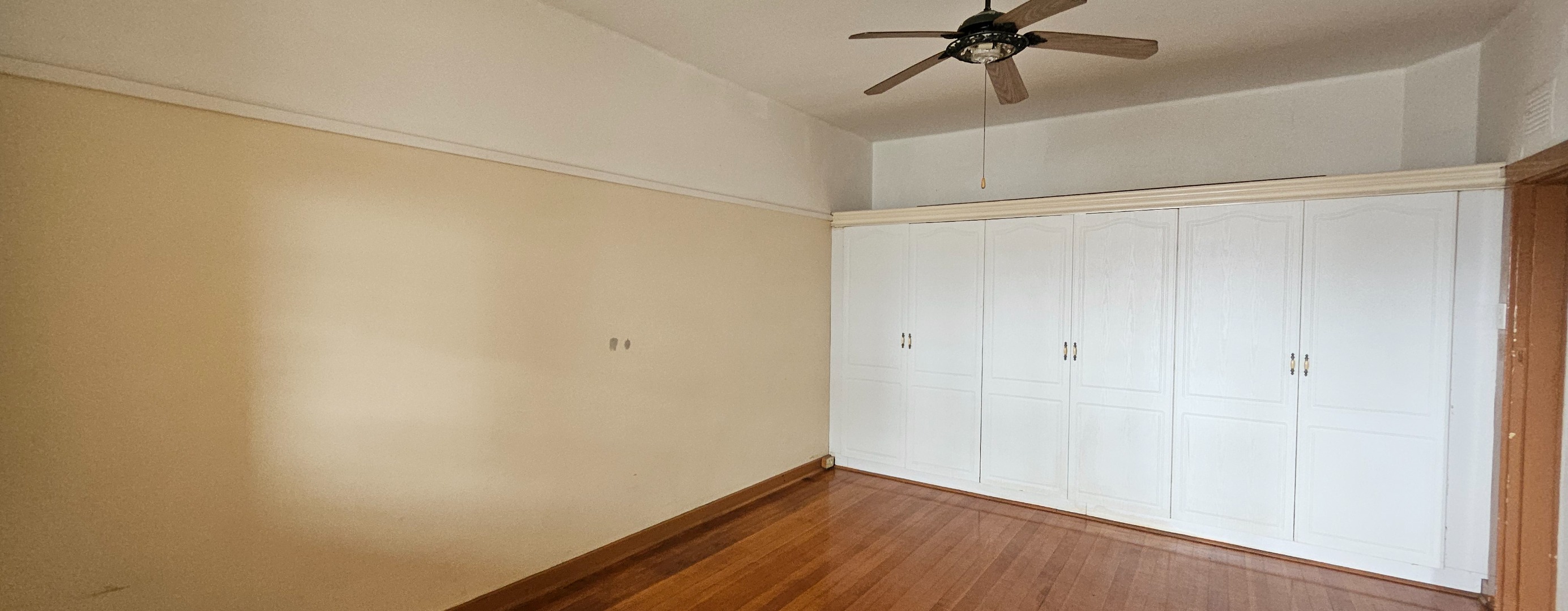 Accommodation includes one generously sized bedroom, designed for comfort and functionality. This space features large windows that invite abundant light, extensive built-in wardrobes offering practical storage solutions, and a ceiling fan for added comfort. The bedroom also provides direct access to a private balcony, where residents can enjoy expansive harbour and bay views. The apartment further benefits from two well-placed bathrooms, one of which includes a built-in, tiled bathtub.