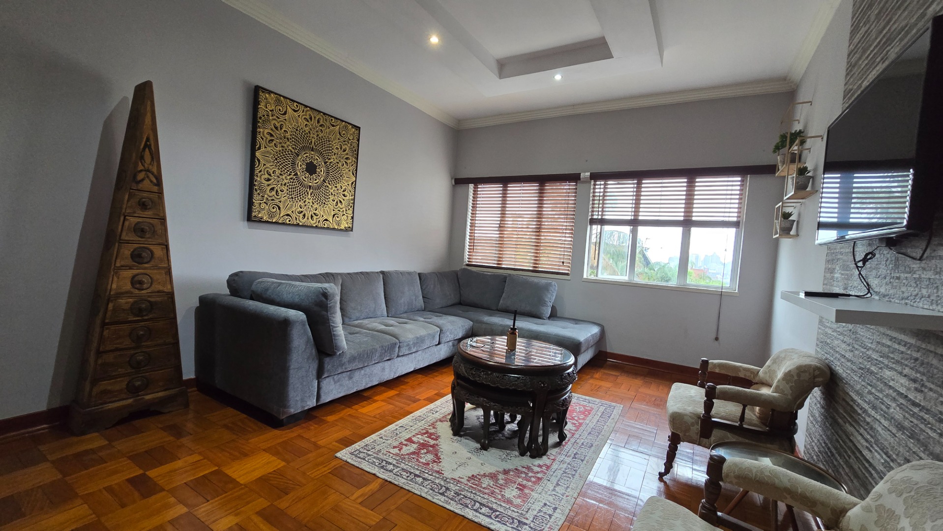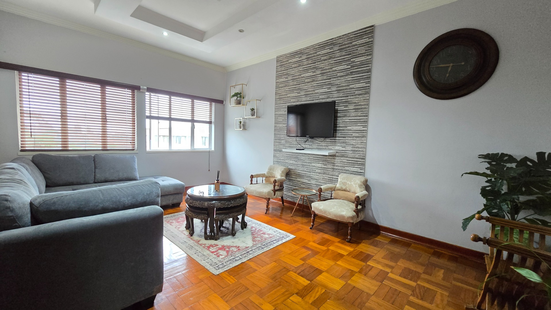Step inside to find polished parquet wood flooring that extends through the main living areas, including a spacious open plan lounge and dining room. Large windows flood the interiors with natural light, creating a warm and welcoming ambiance. The living room features a stylish accent wall, providing a contemporary focal point for relaxation and entertainment.