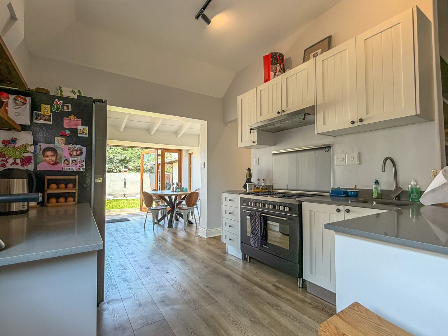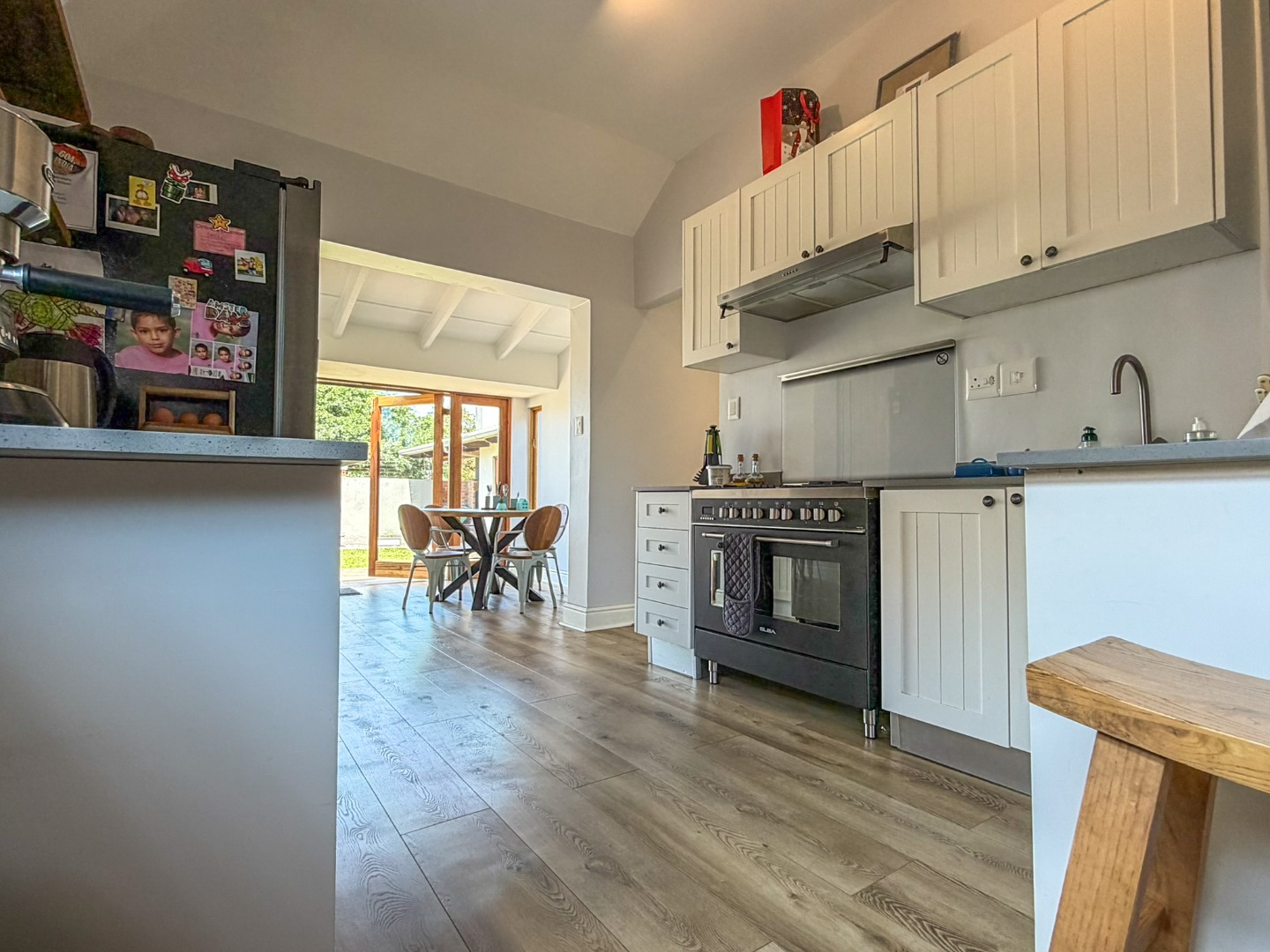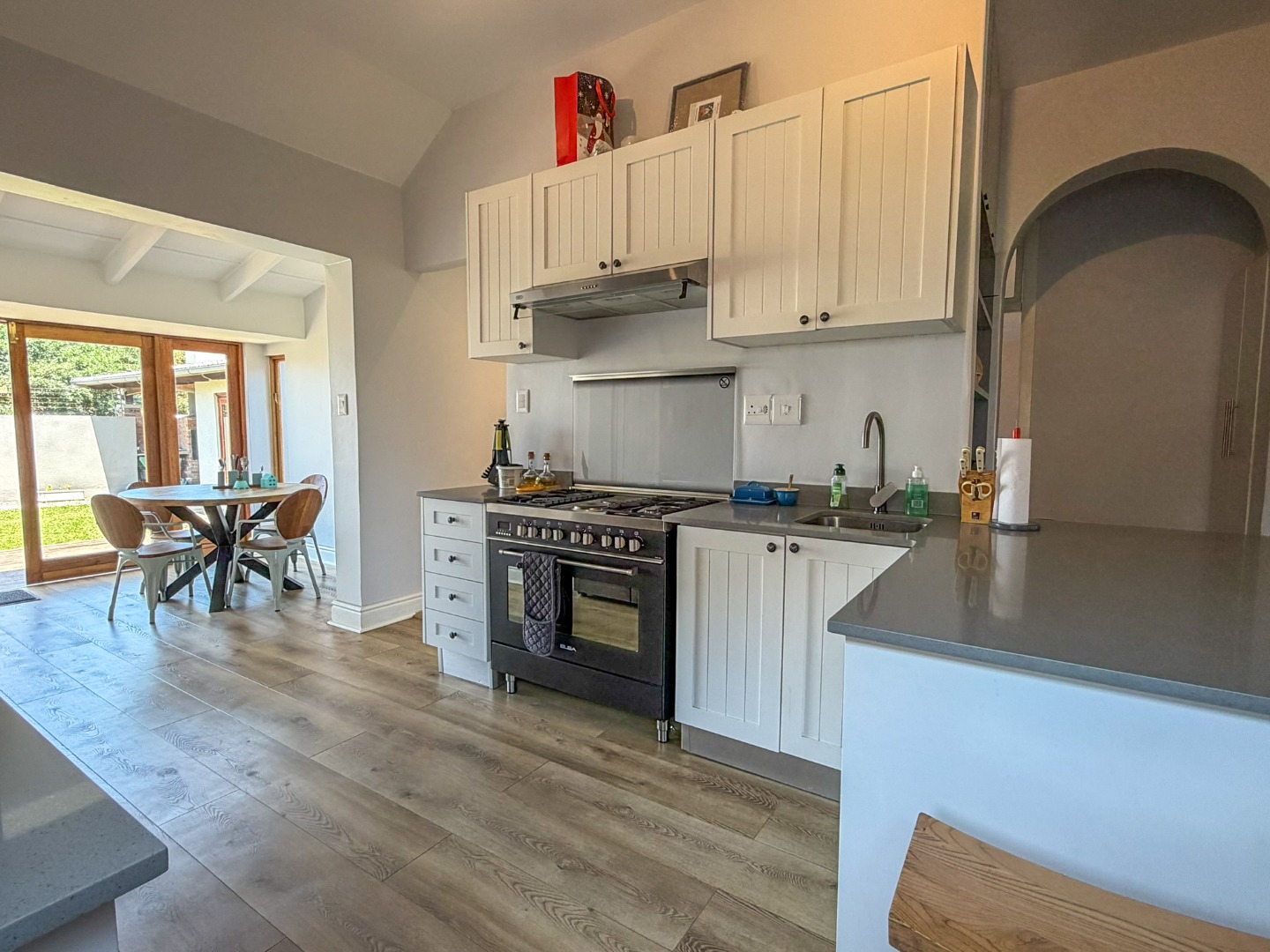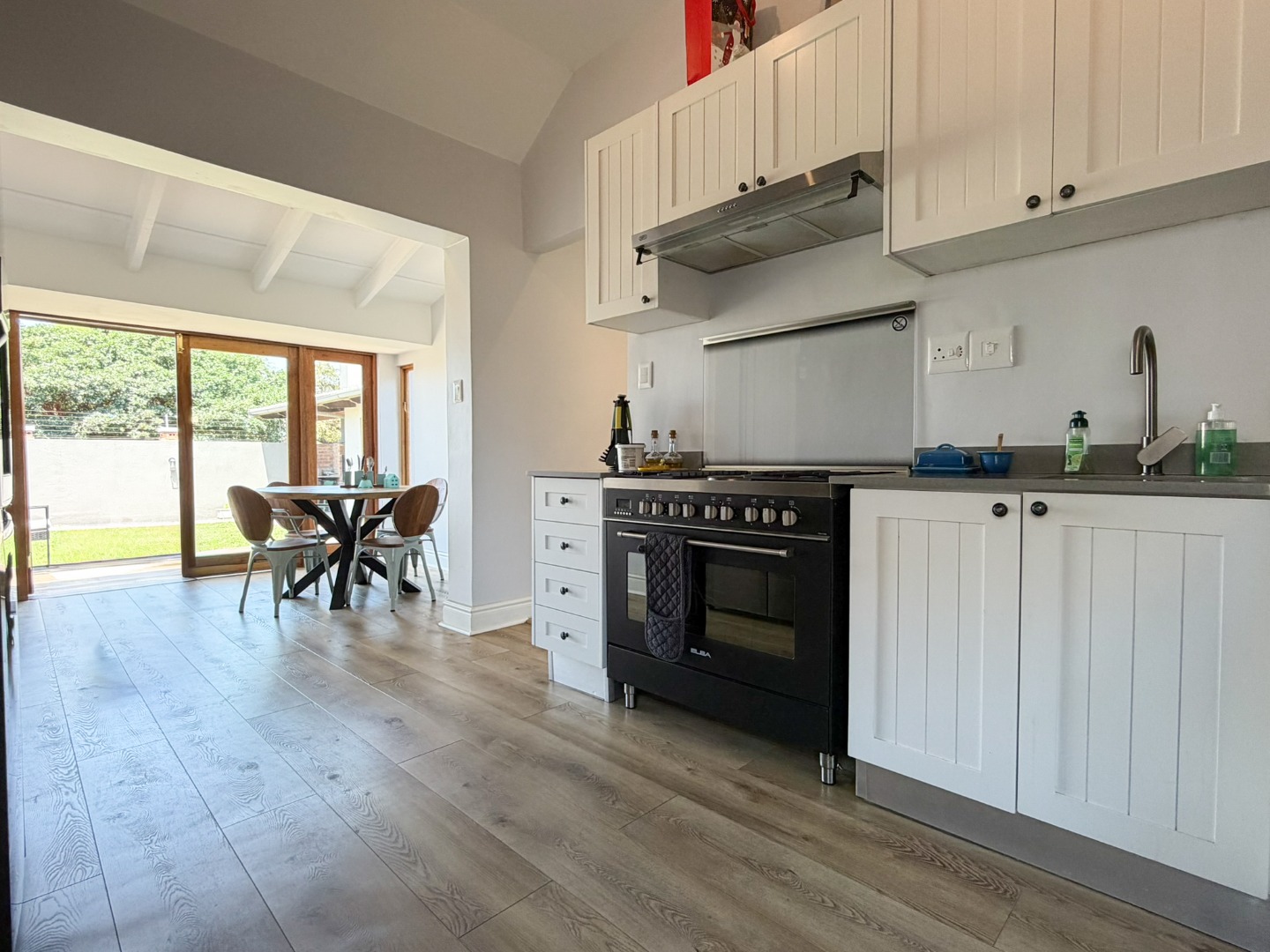 The kitchen flows effortlessly into the dining area, where double doors open onto a deck and garden space—perfect for entertaining and ideal for children to play. Behind the kitchen is a well-appointed scullery, plumbed for a dishwasher and offering additional cupboard space and a sink.