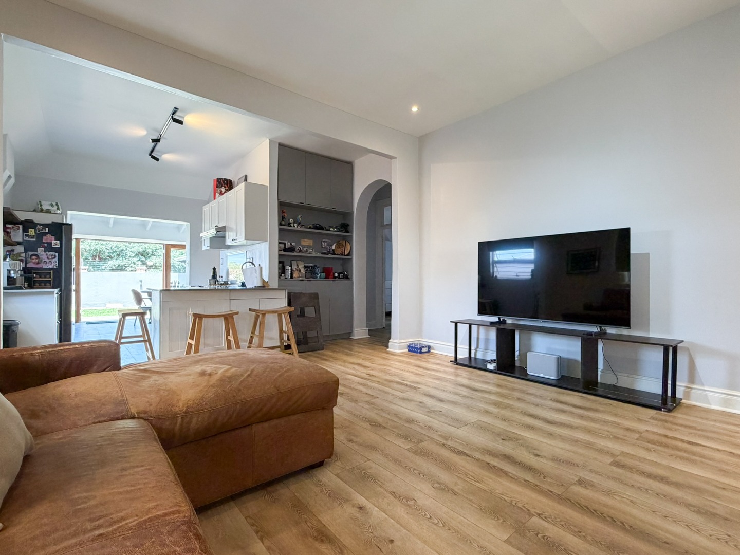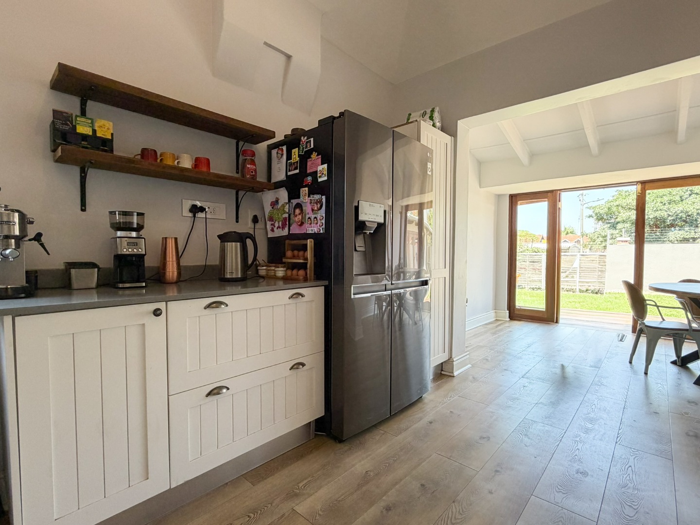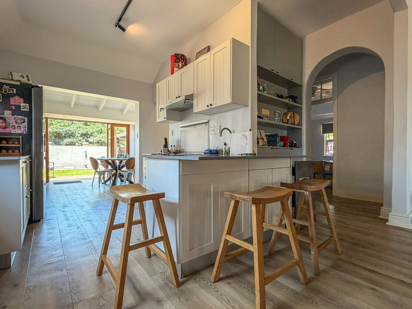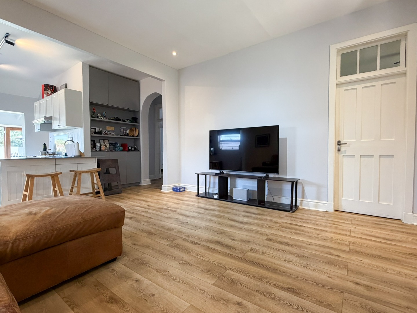 The kitchen flows effortlessly into the dining area, where double doors open onto a deck and garden space—perfect for entertaining and ideal for children to play. Behind the kitchen is a well-appointed scullery, plumbed for a dishwasher and offering additional cupboard space and a sink.