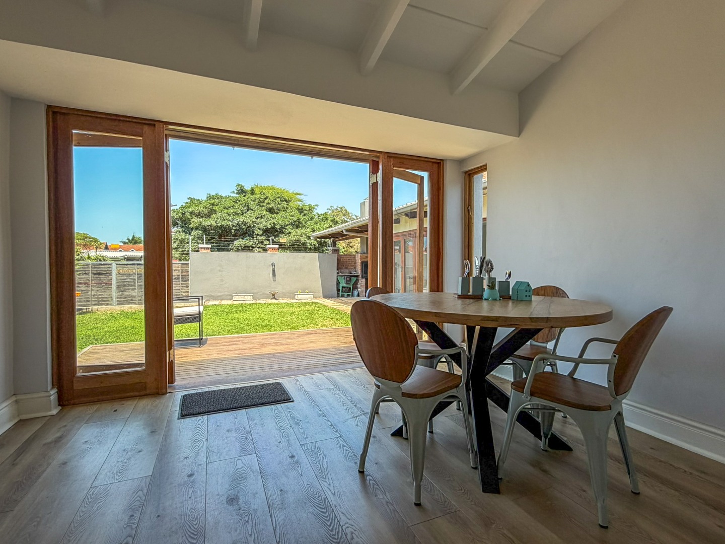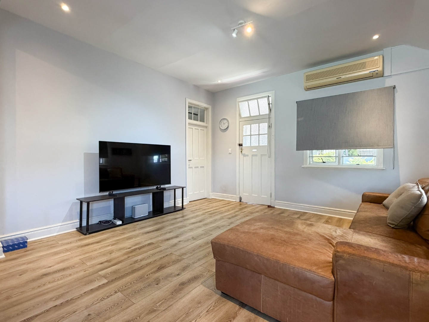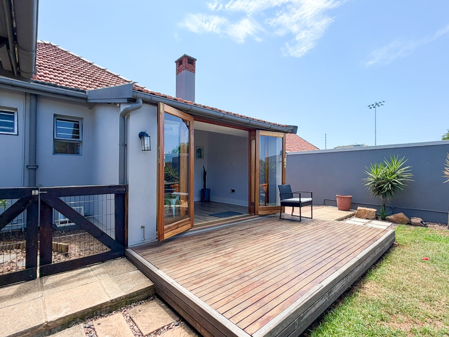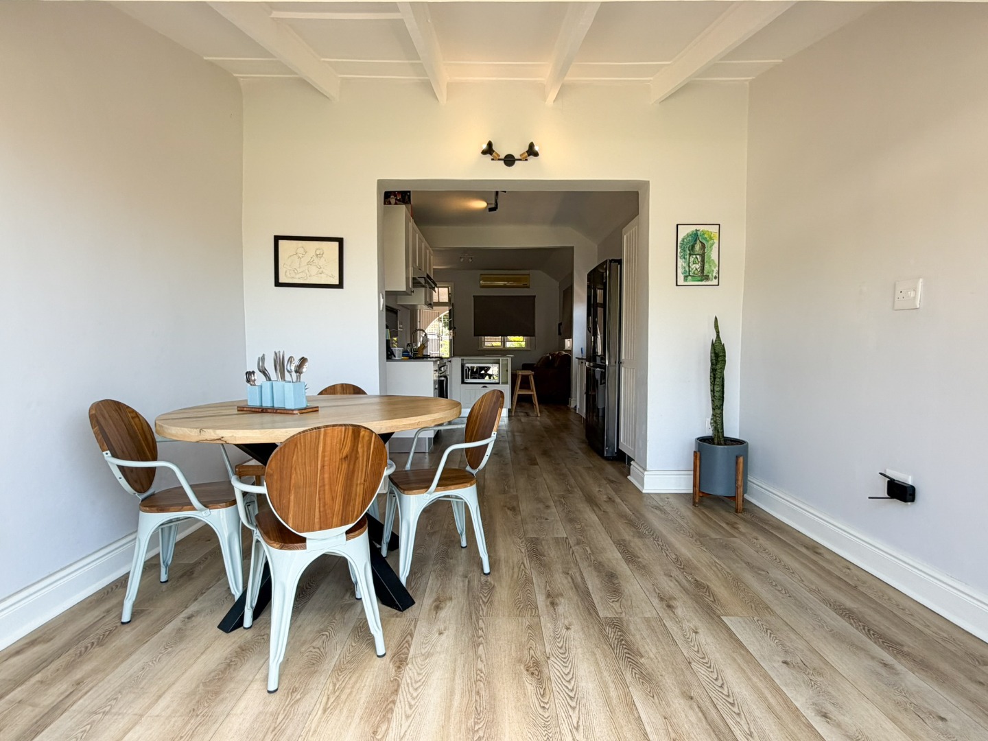 The kitchen flows effortlessly into the dining area, where double doors open onto a deck and garden space—perfect for entertaining and ideal for children to play. Behind the kitchen is a well-appointed scullery, plumbed for a dishwasher and offering additional cupboard space and a sink.