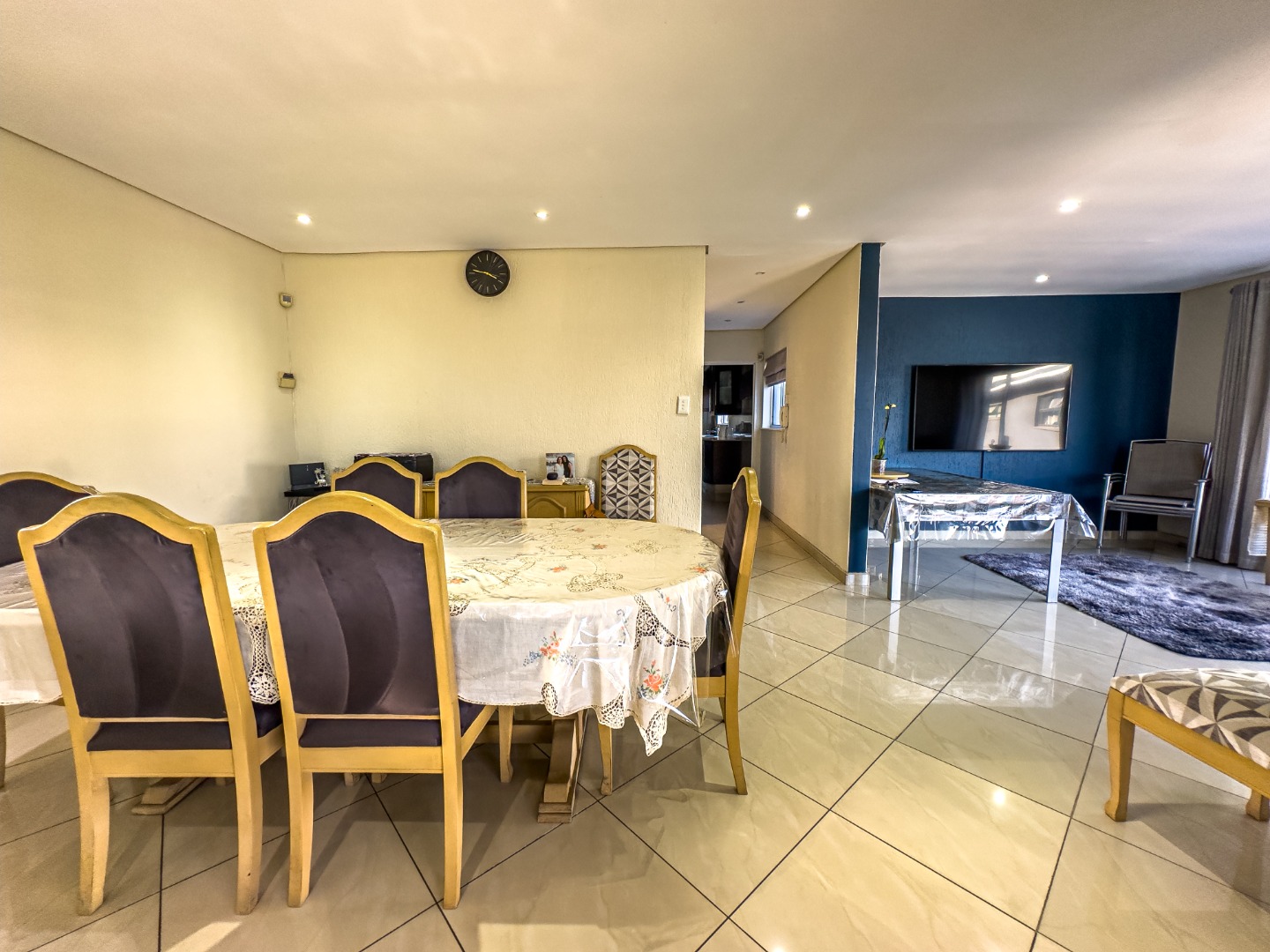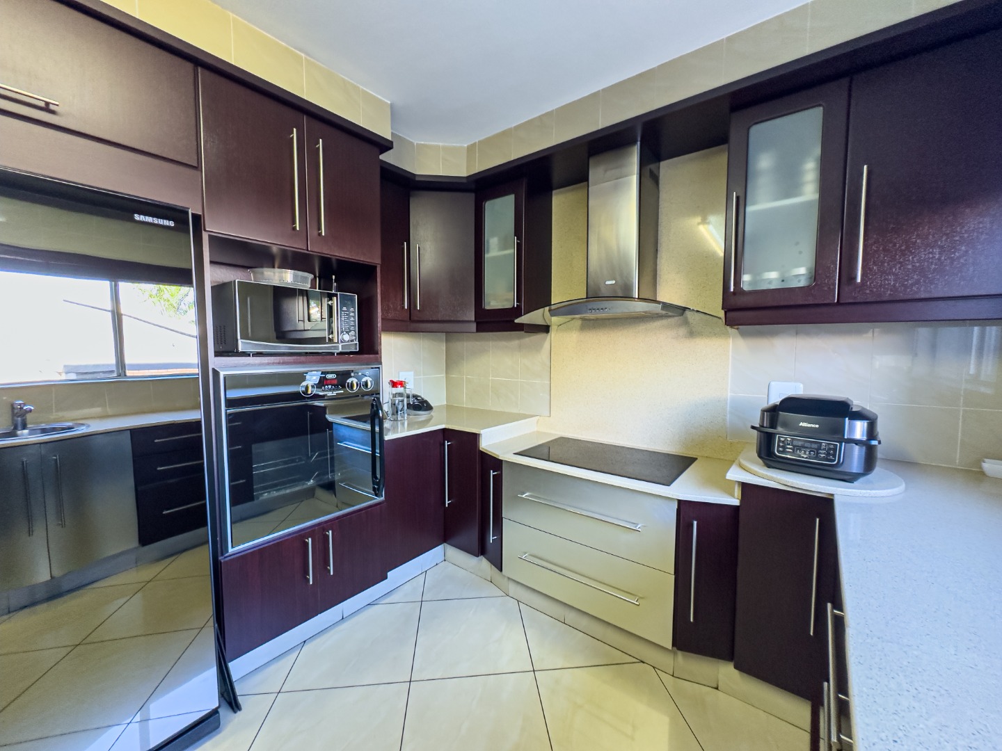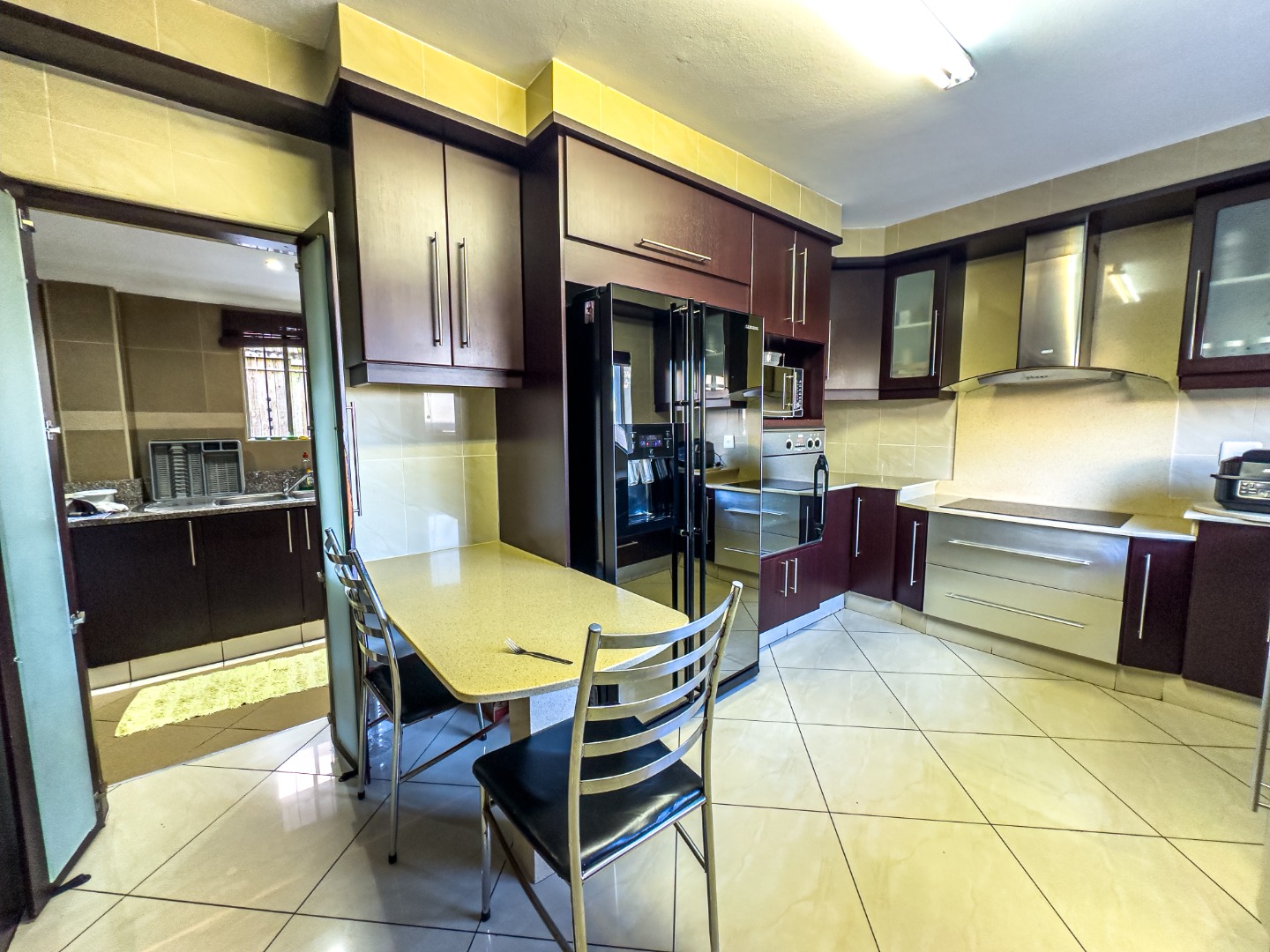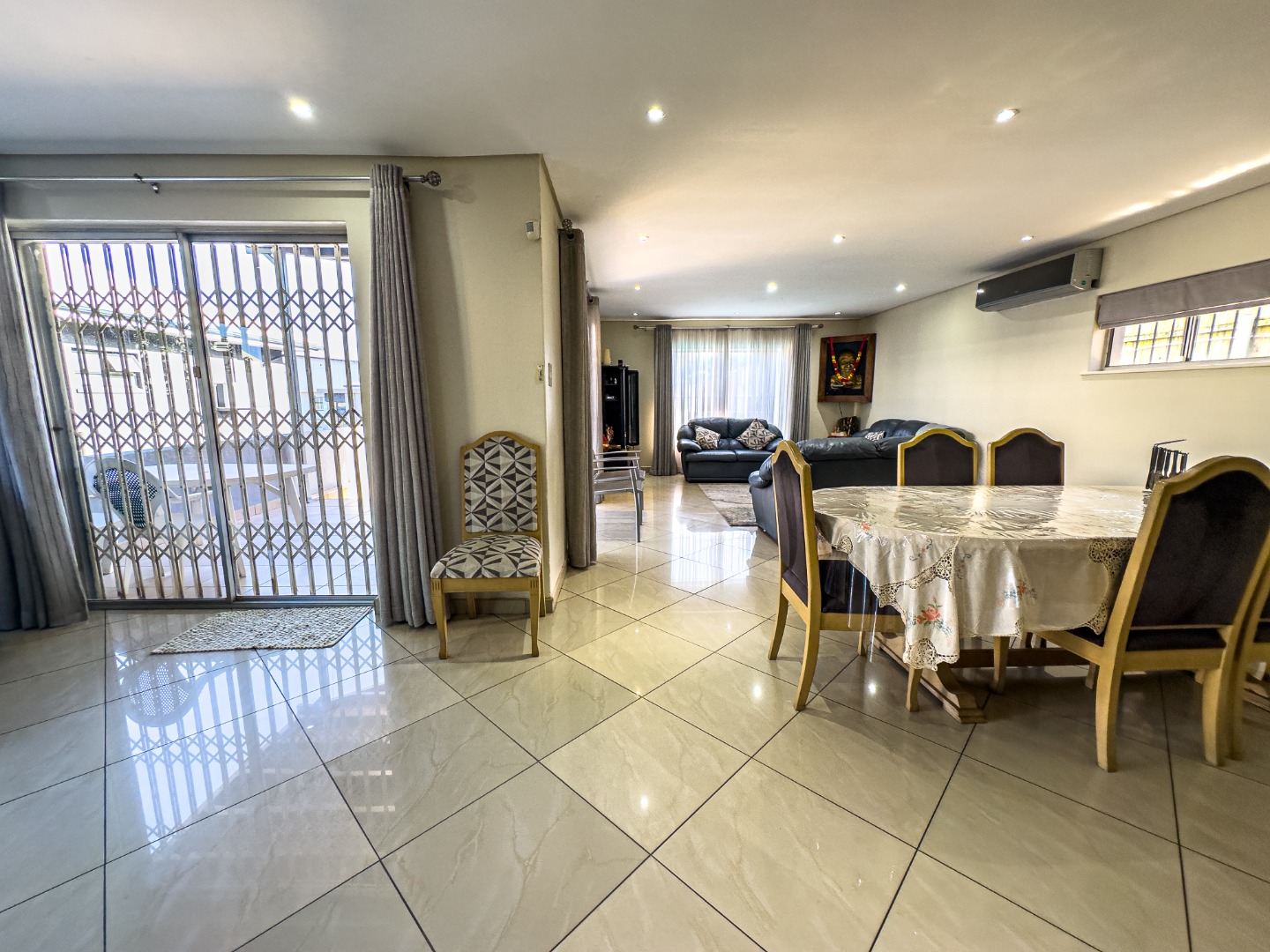 This distinguished residential property, situated in the desirable Essenwood suburb of Durban, presents an exceptional opportunity for discerning buyers. Spanning a generous 279 square metres, this home features an intelligently designed open-plan living and dining area, characterised by contemporary tiled flooring and sophisticated recessed lighting. The modern kitchen is a focal point, equipped with sleek dark wood cabinetry, light countertops, and integrated stainless steel appliances including an oven and hob with extractor fan. The seamless flow between these spaces is enhanced by the presence of air conditioning, ensuring comfort throughout.
