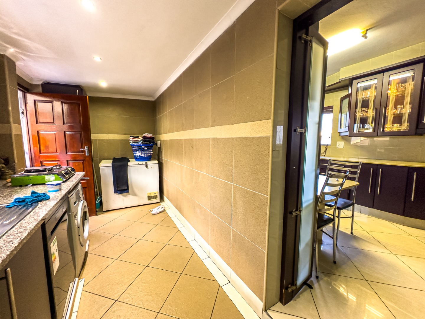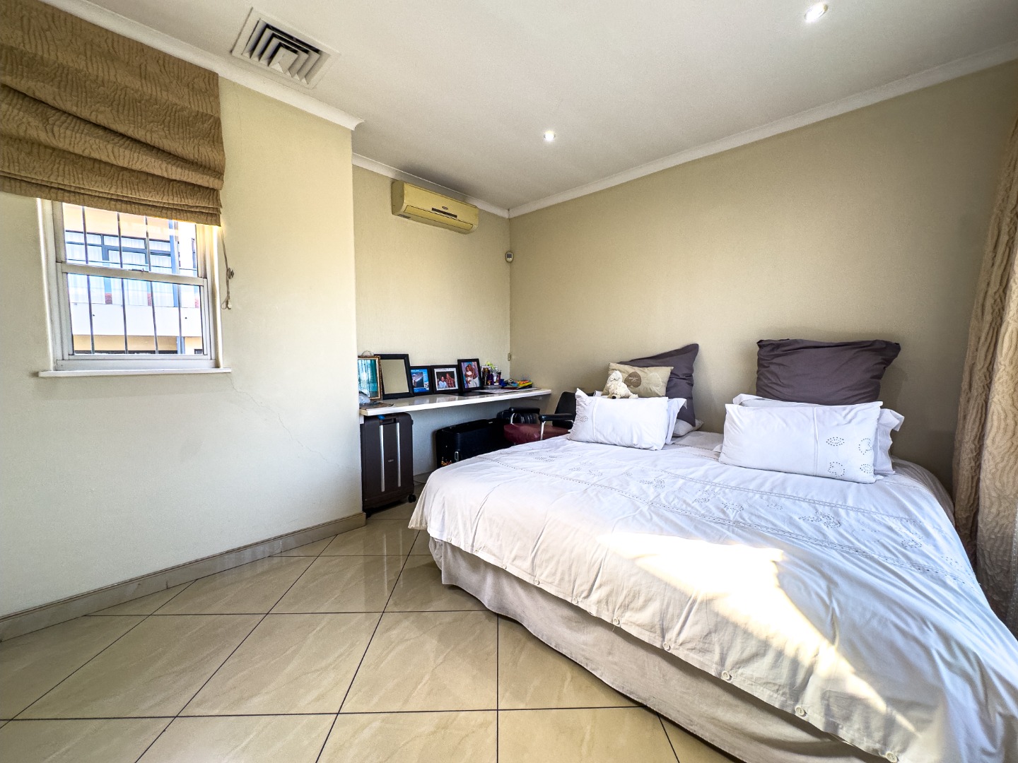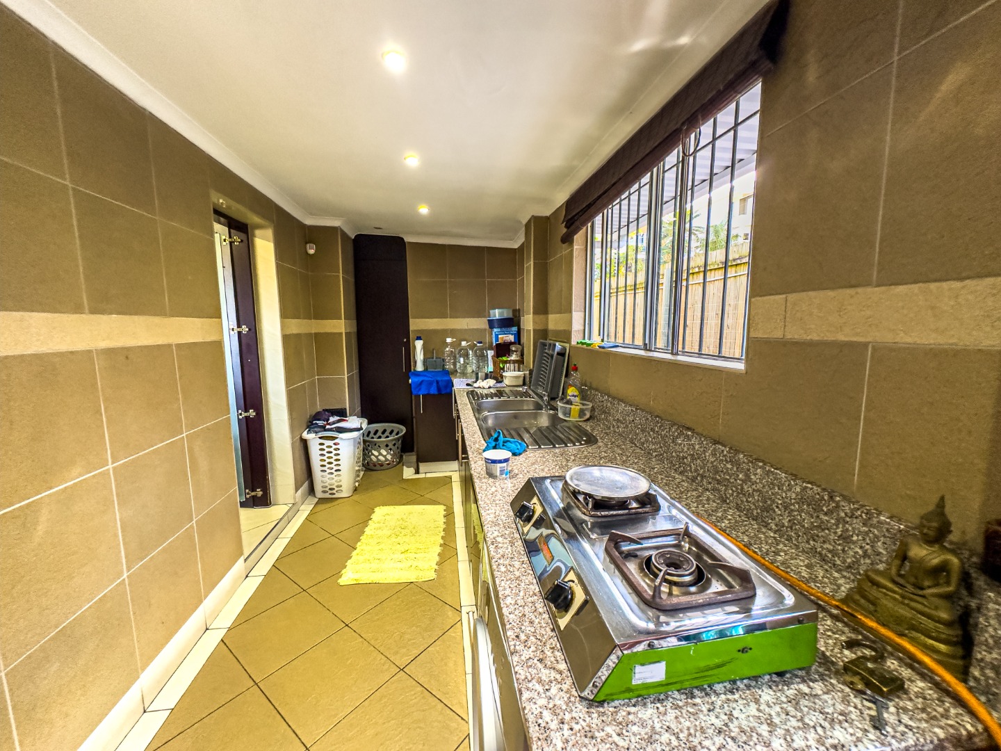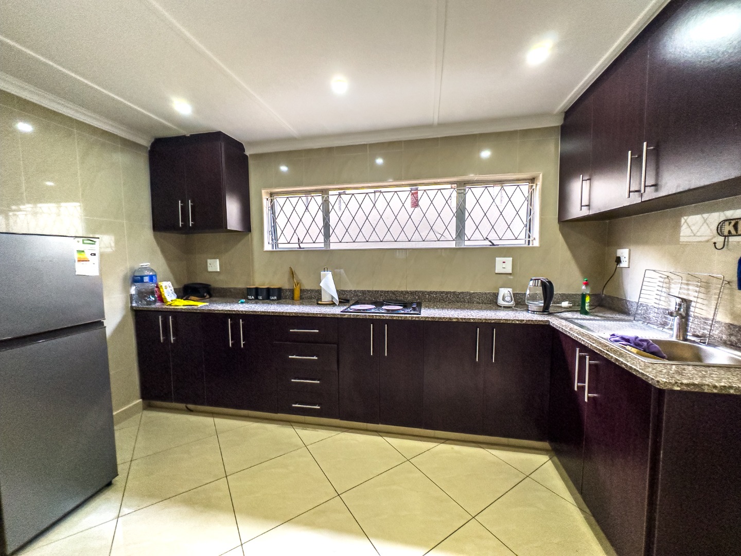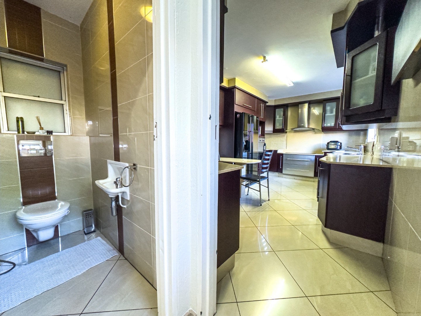 This distinguished residential property, situated in the desirable Essenwood suburb of Durban, presents an exceptional opportunity for discerning buyers. Spanning a generous 279 square metres, this home features an intelligently designed open-plan living and dining area, characterised by contemporary tiled flooring and sophisticated recessed lighting. The modern kitchen is a focal point, equipped with sleek dark wood cabinetry, light countertops, and integrated stainless steel appliances including an oven and hob with extractor fan. The seamless flow between these spaces is enhanced by the presence of air conditioning, ensuring comfort throughout.