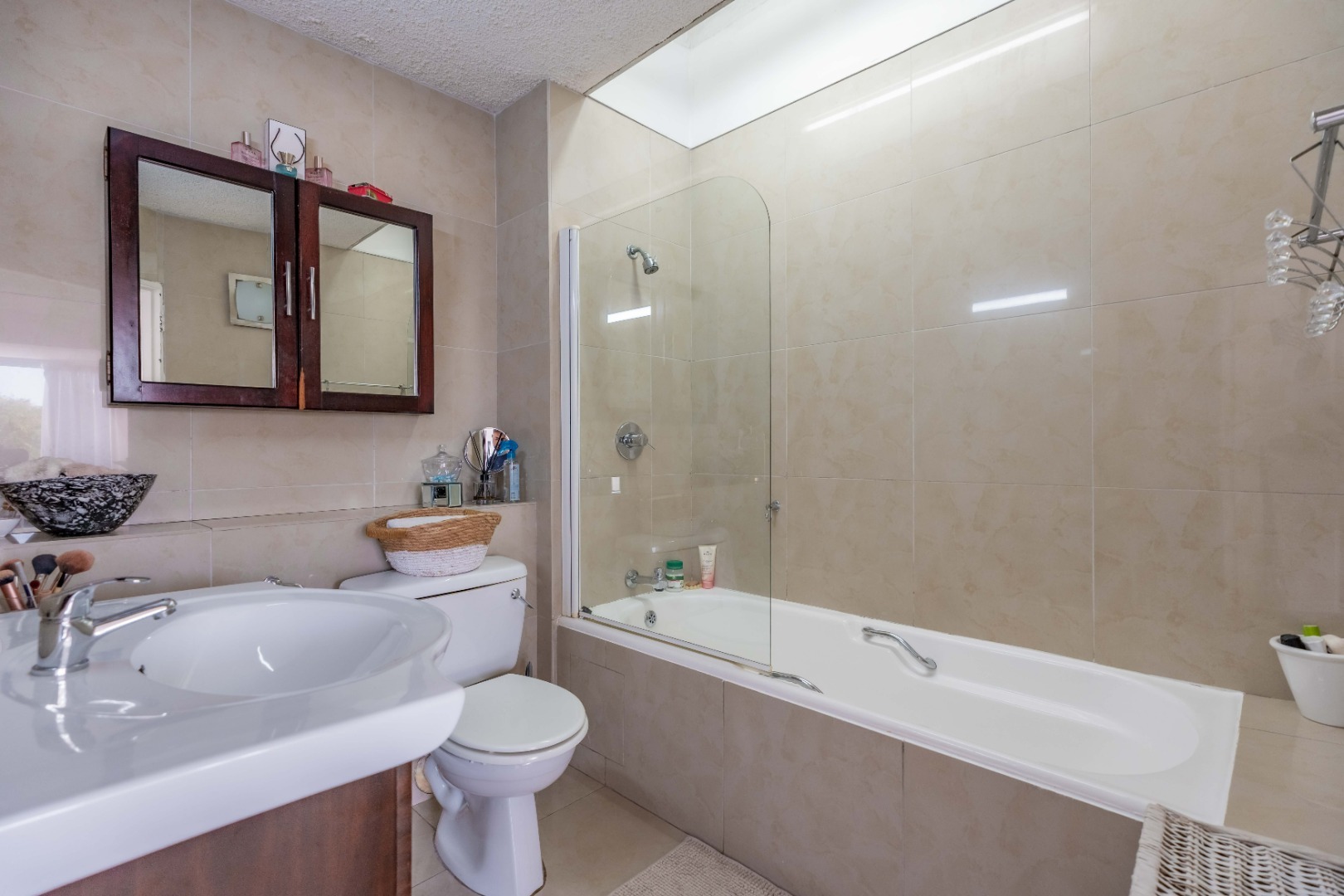 The generously sized main bedroom boasts views and is equipped with built-in cupboards, a ceiling fan, air conditioning, and an ensuite bathroom featuring a combined shower and bathtub, toilet, and basin. The family bathroom includes a basin, toilet, and a bathtub with a shower over it.
