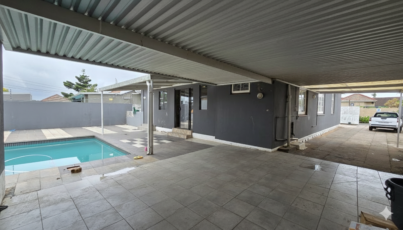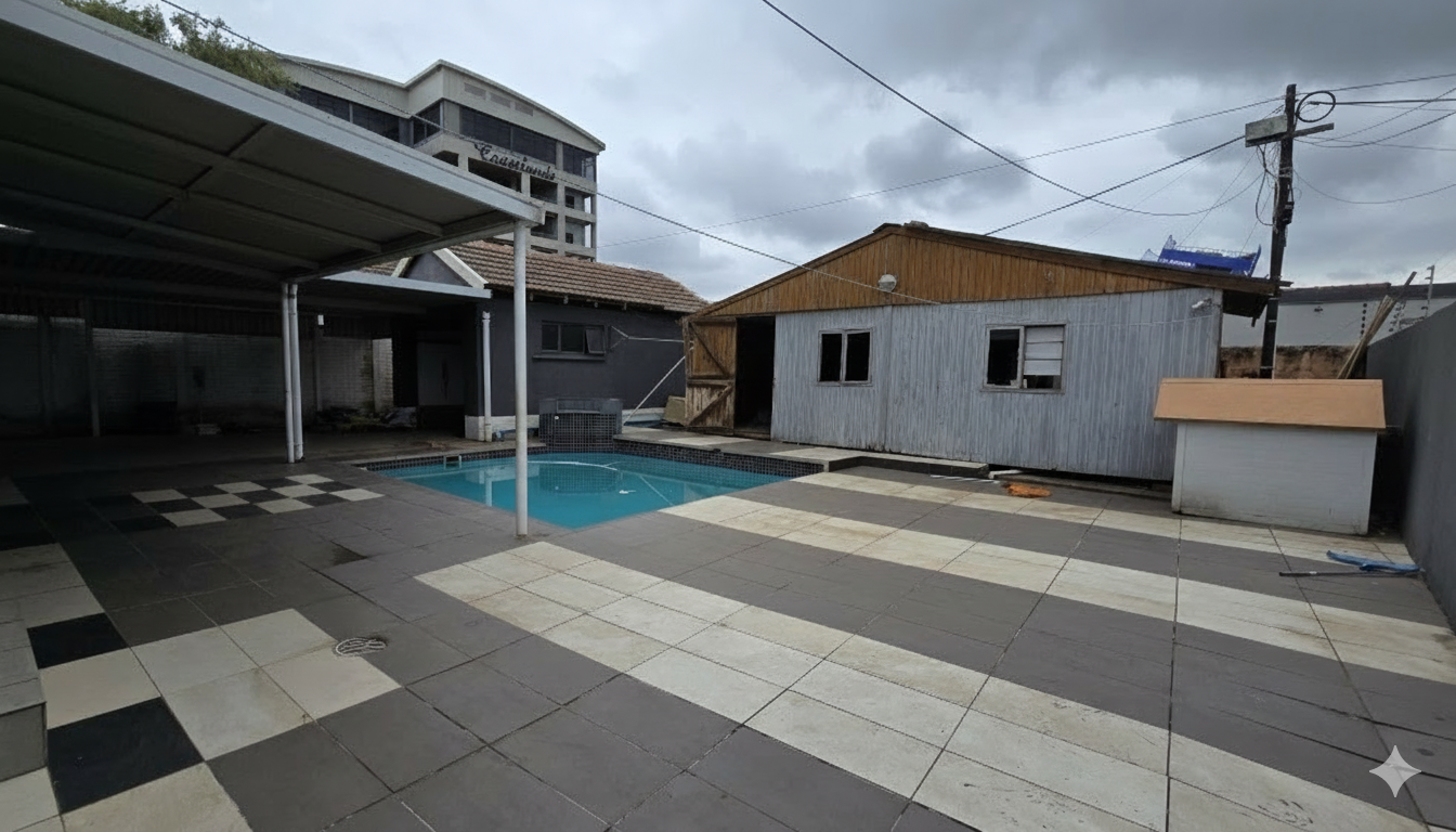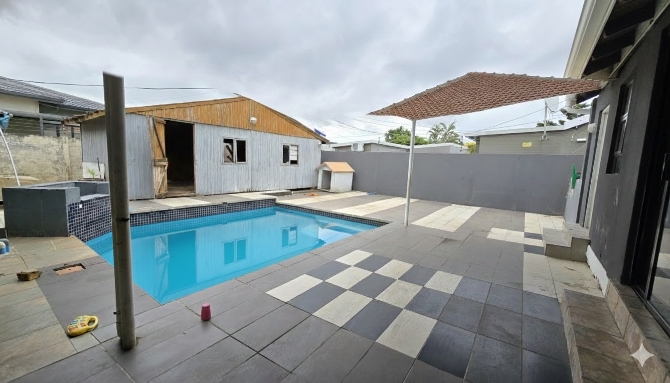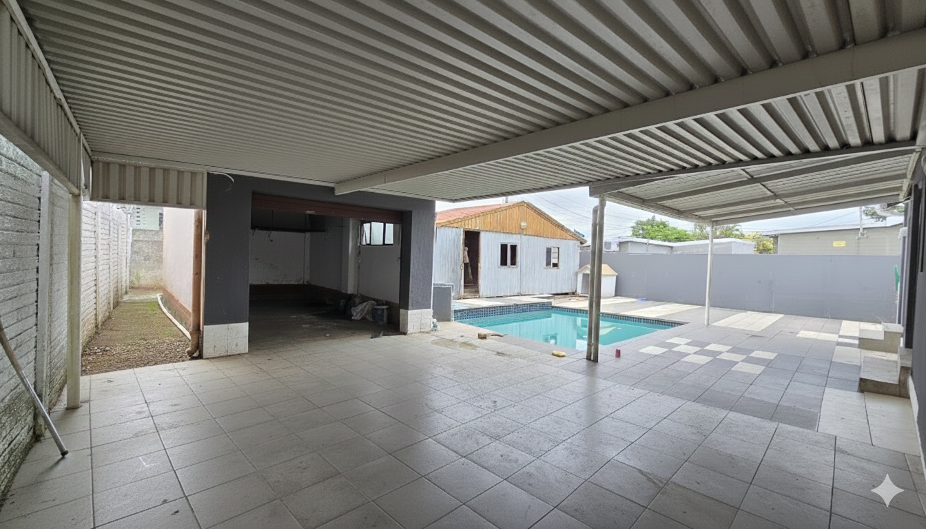 Outdoors, the property shines with a private swimming pool and an expansive, tiled patio, perfect for entertaining guests or enjoying quiet relaxation. A versatile covered outdoor area provides ample shade and shelter, also serving as a convenient carport. Parking is generous, with a single garage and additional paved space for up to five vehicles. The exterior features a modern dark grey aesthetic and high privacy walls, though some outbuildings and garden areas would benefit from maintenance and landscaping to enhance their appeal.