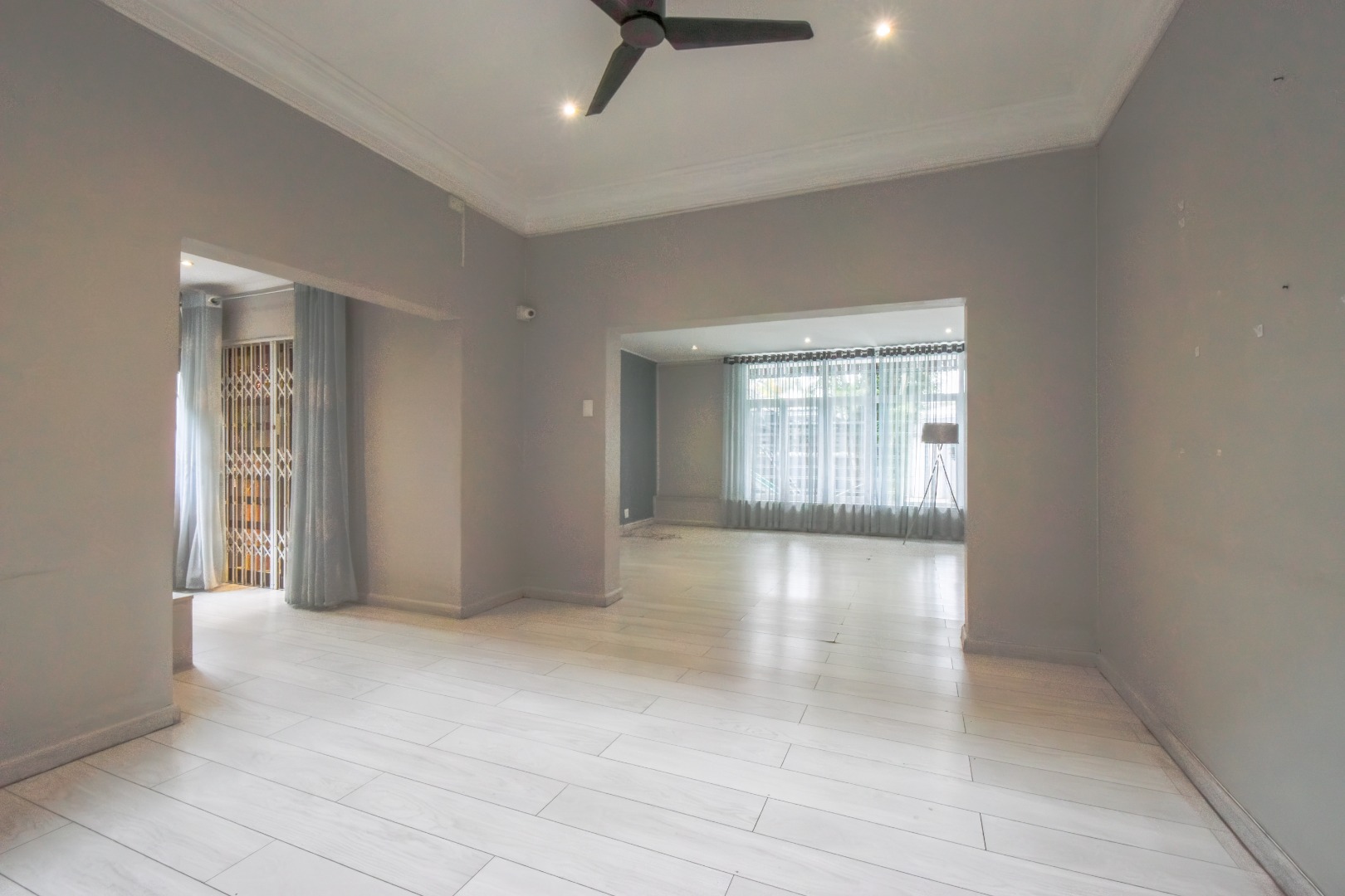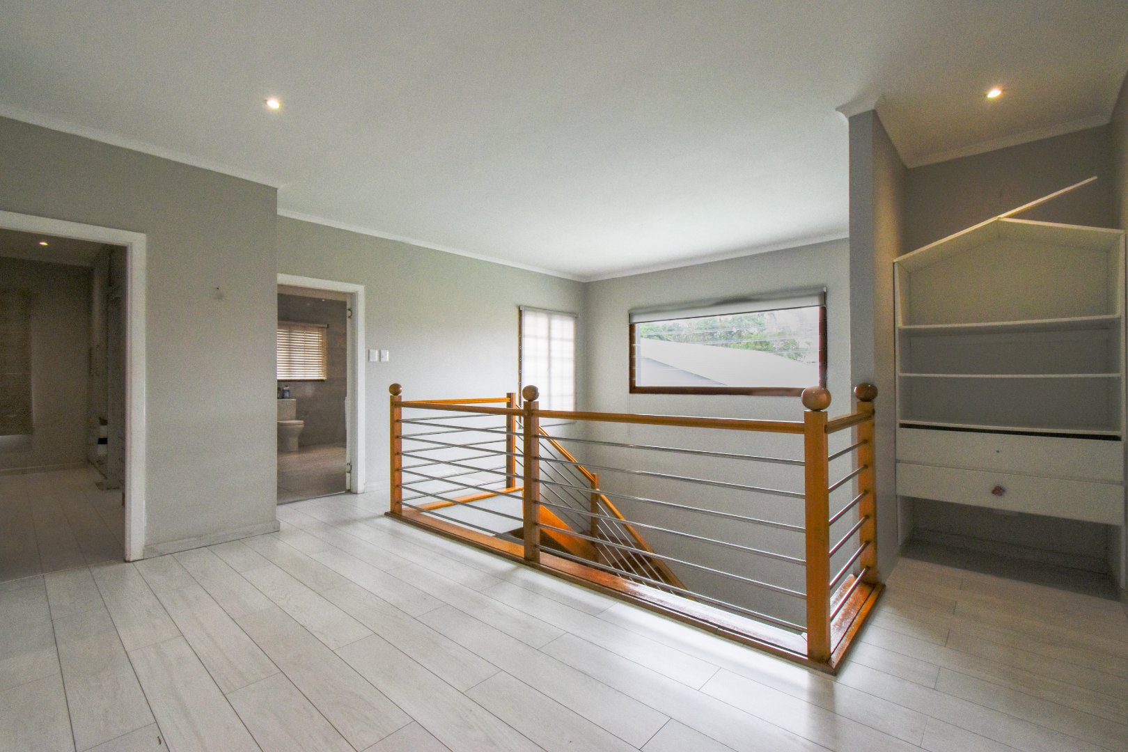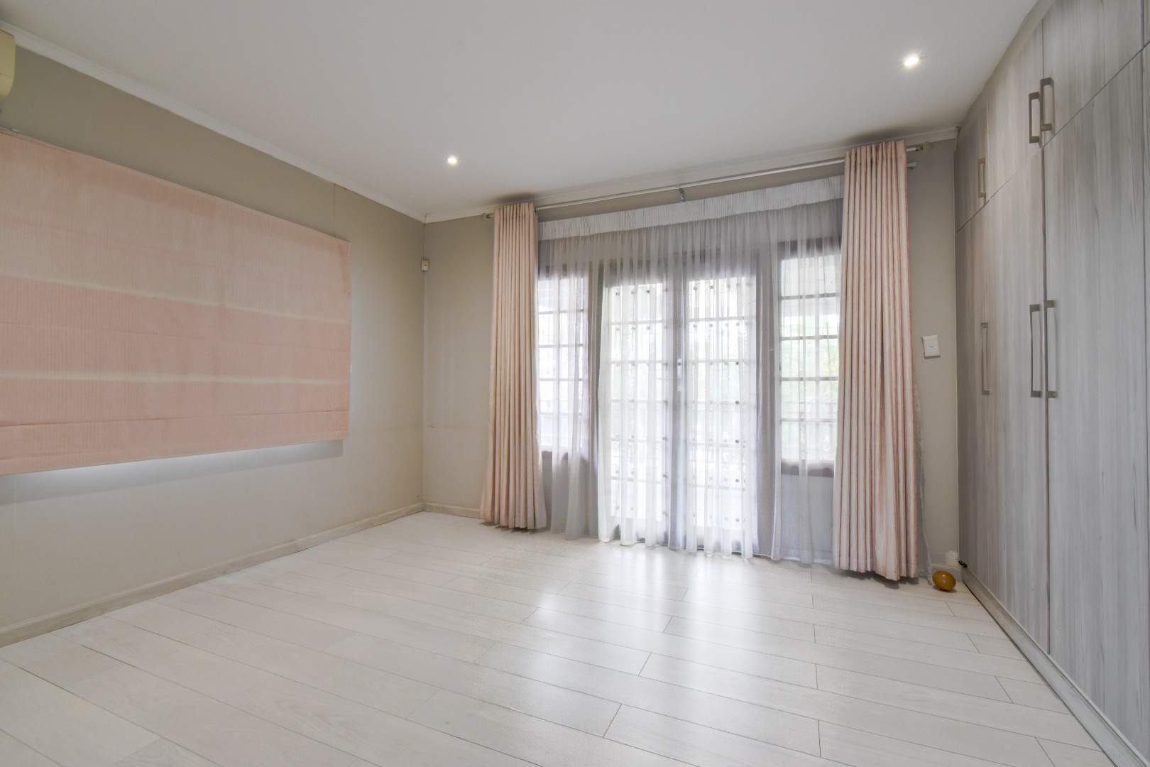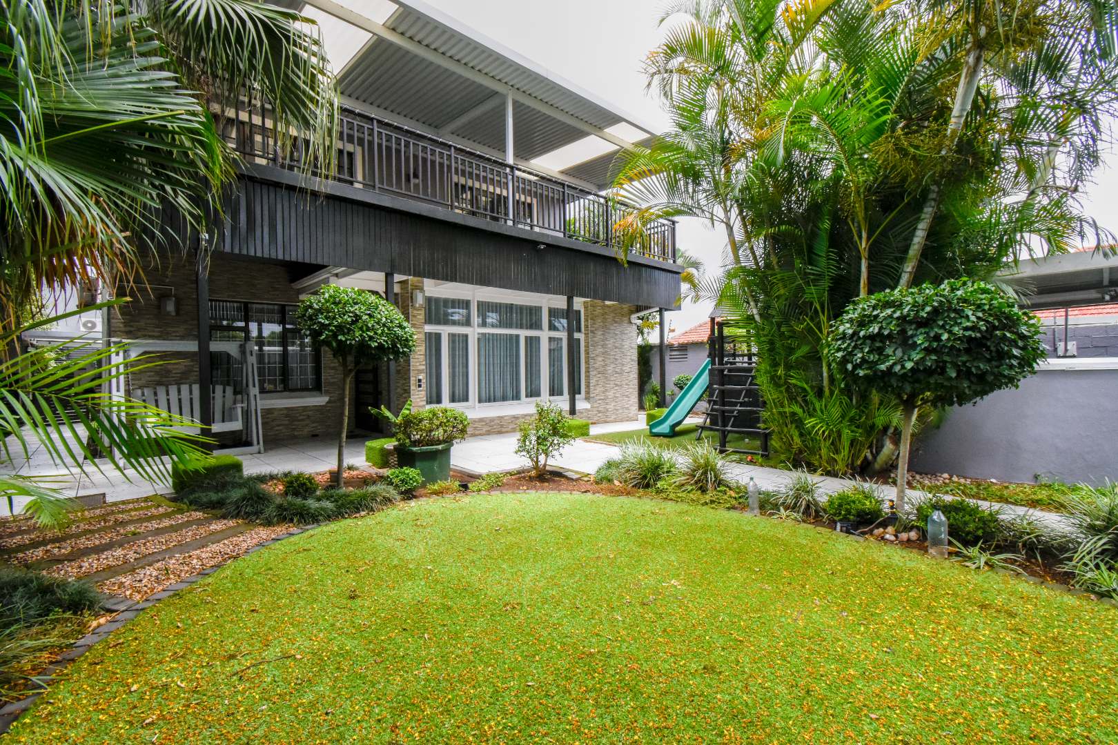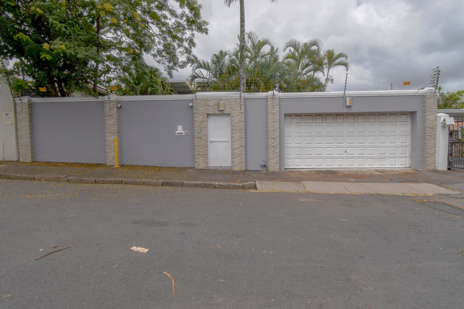Discover a sophisticated modern home set in a quiet cul-de-sac in the sought-after Essenwood suburb of Durban. This striking double-storey residence features contemporary architecture with stone cladding, dark accents, and a statement balcony, surrounded by a beautifully maintained tropical garden with paved walkways and a children’s play area. Inside, spacious open-plan living areas are enhanced by light-toned flooring, recessed lighting, crown molding, and textured feature walls. A sleek wooden staircase leads to four luxurious bedrooms, two en suite, plus a full family bathroom and guest toilet. The home also offers three lounges, a dining area, a covered patio for outdoor entertaining, air conditioning, and two garages. Comprehensive security includes electric fencing, CCTV, an alarm system, 24-hour security, and controlled access, ensuring stylish, secure, and comfortable living in a prime location.