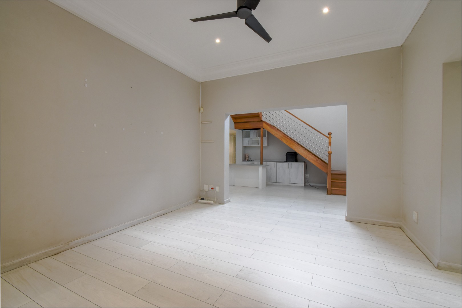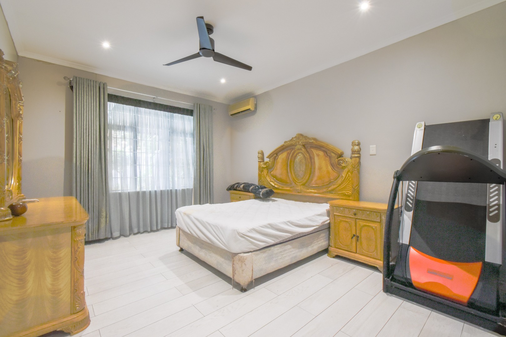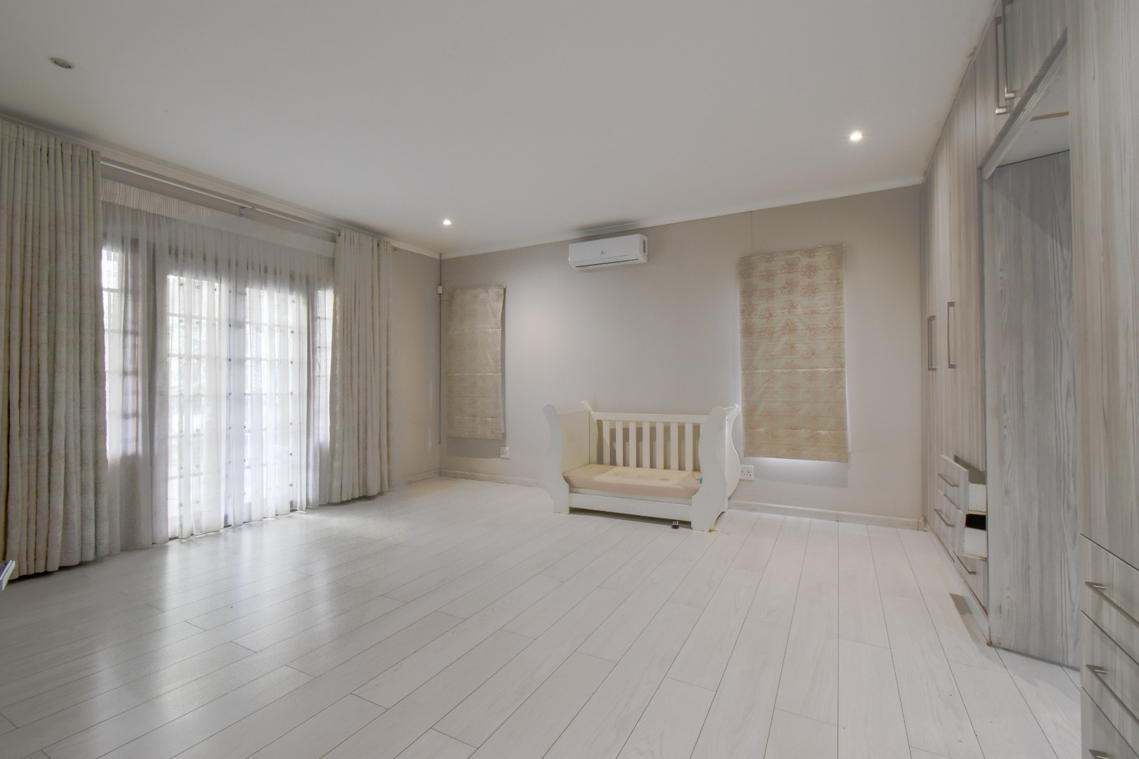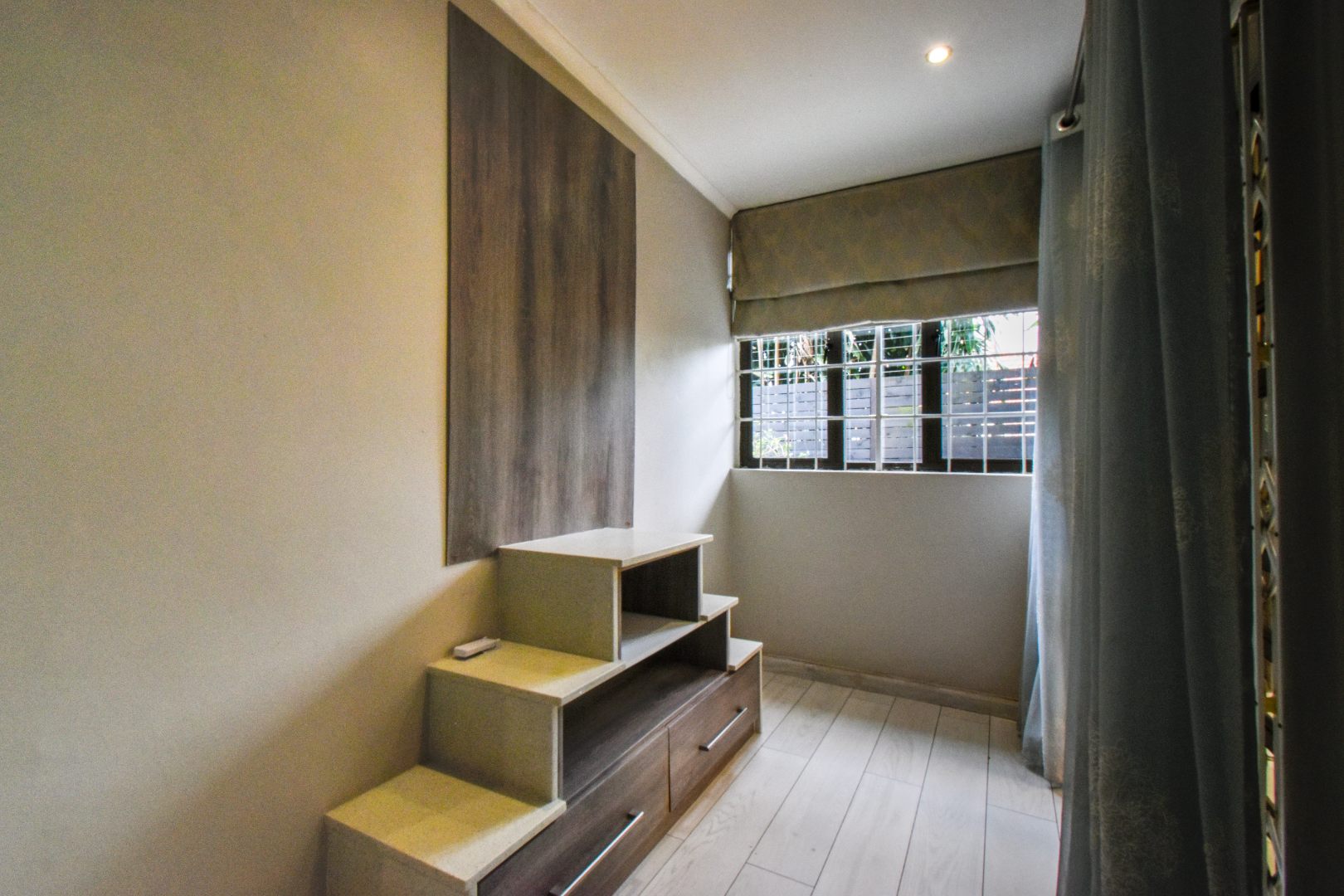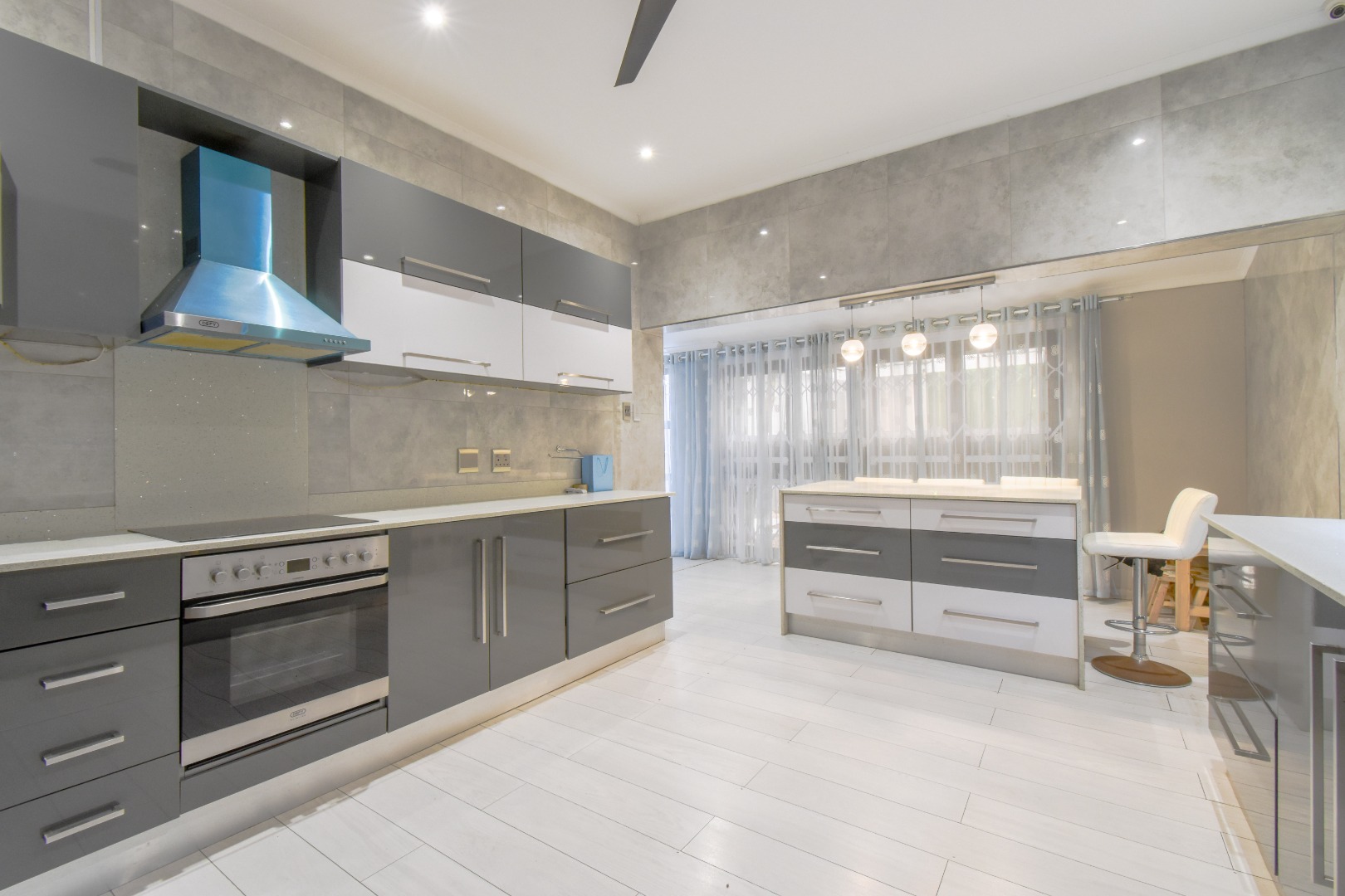 Discover a sophisticated modern home set in a quiet cul-de-sac in the sought-after Essenwood suburb of Durban. This striking double-storey residence features contemporary architecture with stone cladding, dark accents, and a statement balcony, surrounded by a beautifully maintained tropical garden with paved walkways and a children’s play area. Inside, spacious open-plan living areas are enhanced by light-toned flooring, recessed lighting, crown molding, and textured feature walls. A sleek wooden staircase leads to four luxurious bedrooms, two en suite, plus a full family bathroom and guest toilet. The home also offers three lounges, a dining area, a covered patio for outdoor entertaining, air conditioning, and two garages. Comprehensive security includes electric fencing, CCTV, an alarm system, 24-hour security, and controlled access, ensuring stylish, secure, and comfortable living in a prime location.