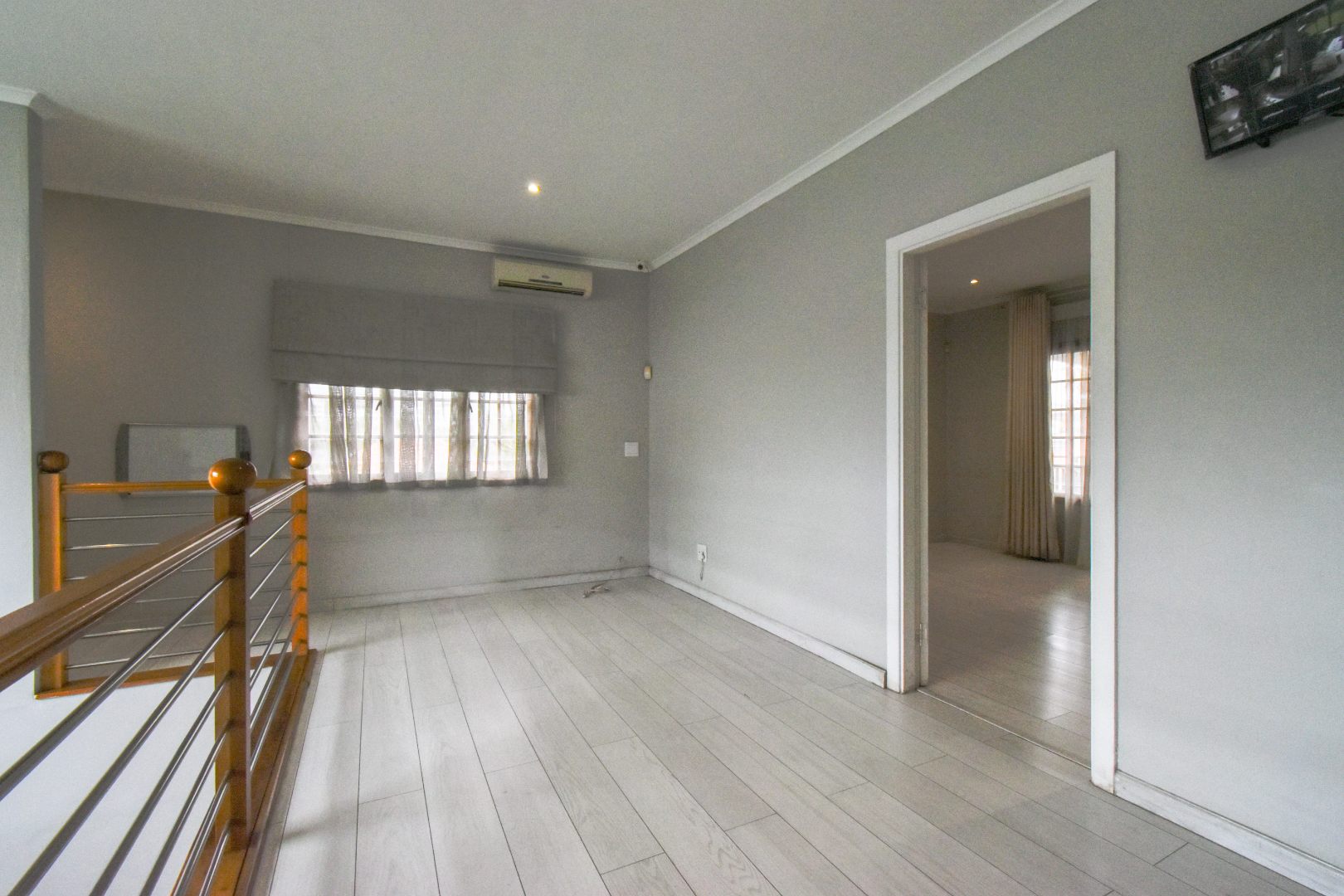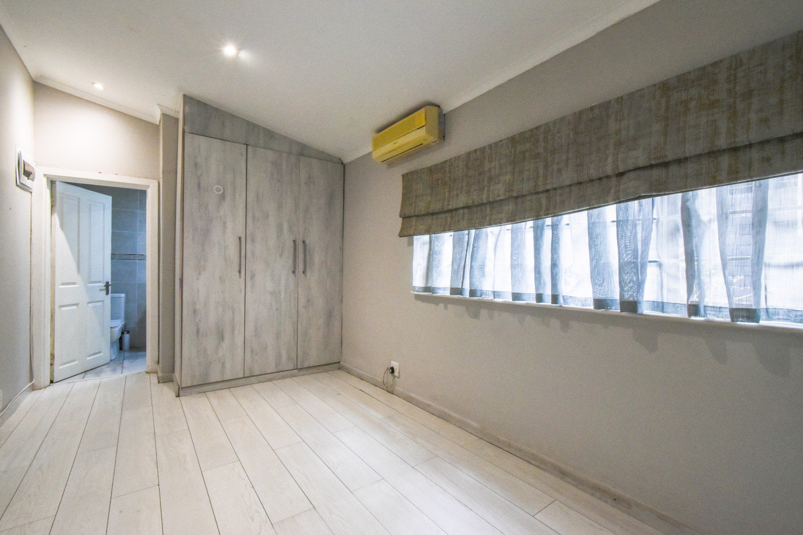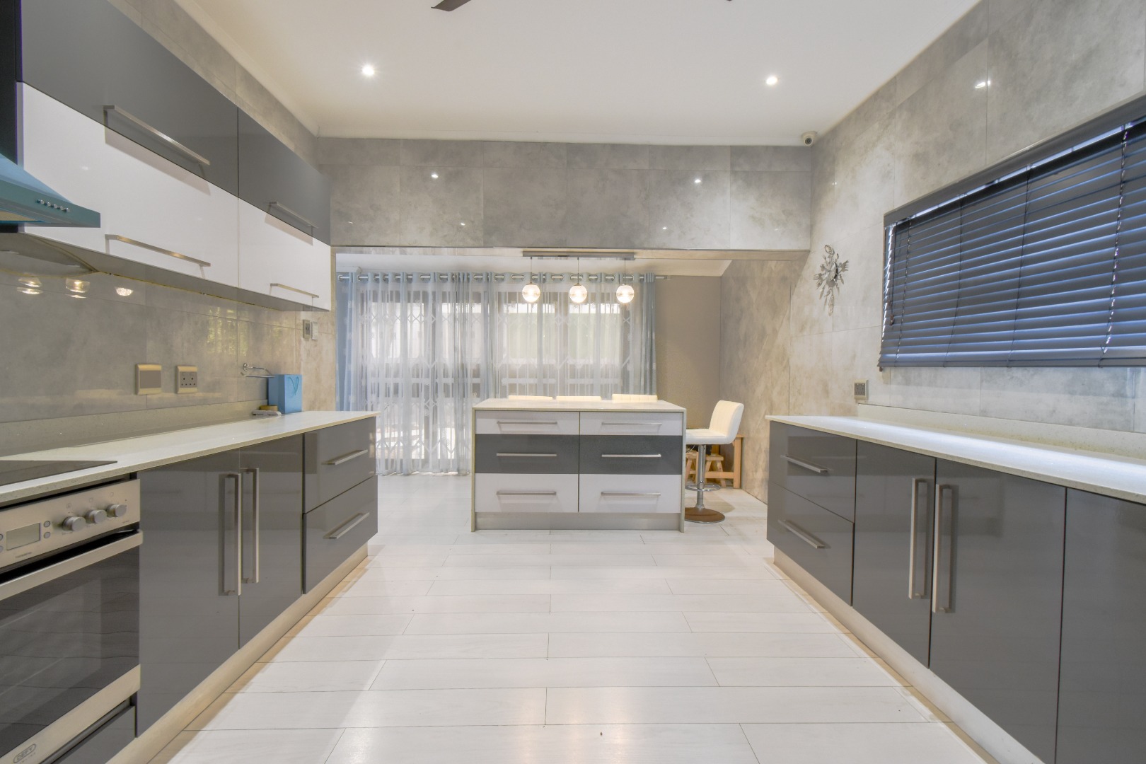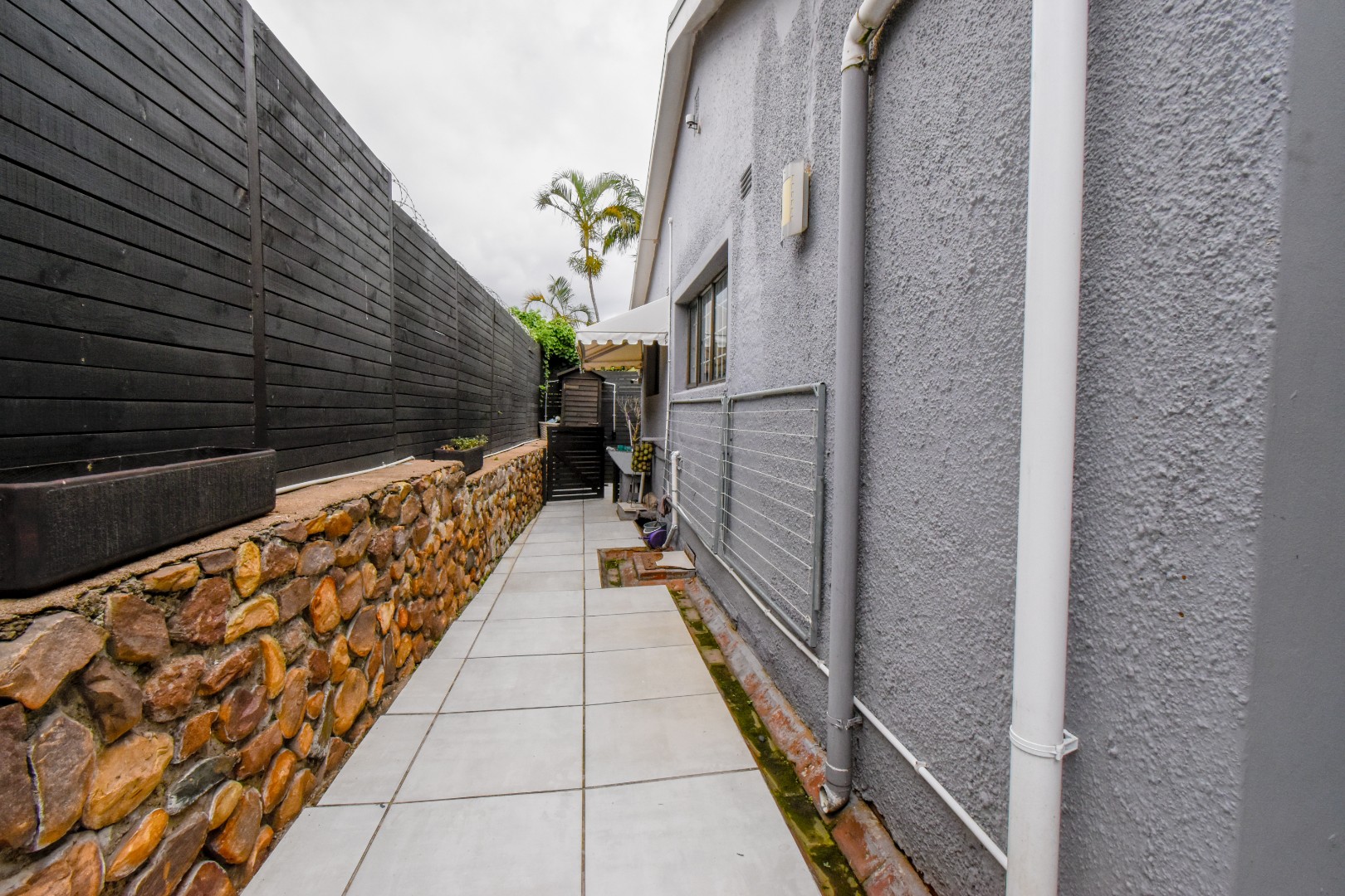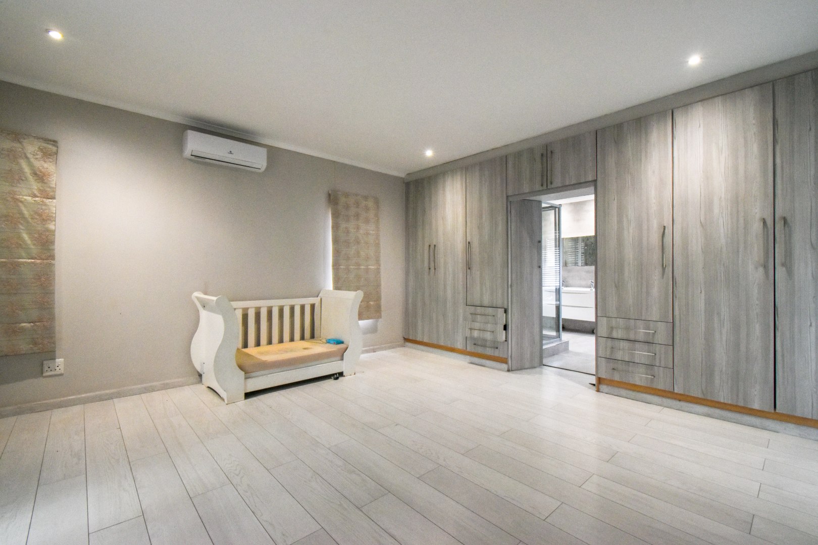Discover a sophisticated modern home set in a quiet cul-de-sac in the sought-after Essenwood suburb of Durban. This striking double-storey residence features contemporary architecture with stone cladding, dark accents, and a statement balcony, surrounded by a beautifully maintained tropical garden with paved walkways and a children’s play area. Inside, spacious open-plan living areas are enhanced by light-toned flooring, recessed lighting, crown molding, and textured feature walls. A sleek wooden staircase leads to four luxurious bedrooms, two en suite, plus a full family bathroom and guest toilet. The home also offers three lounges, a dining area, a covered patio for outdoor entertaining, air conditioning, and two garages. Comprehensive security includes electric fencing, CCTV, an alarm system, 24-hour security, and controlled access, ensuring stylish, secure, and comfortable living in a prime location.