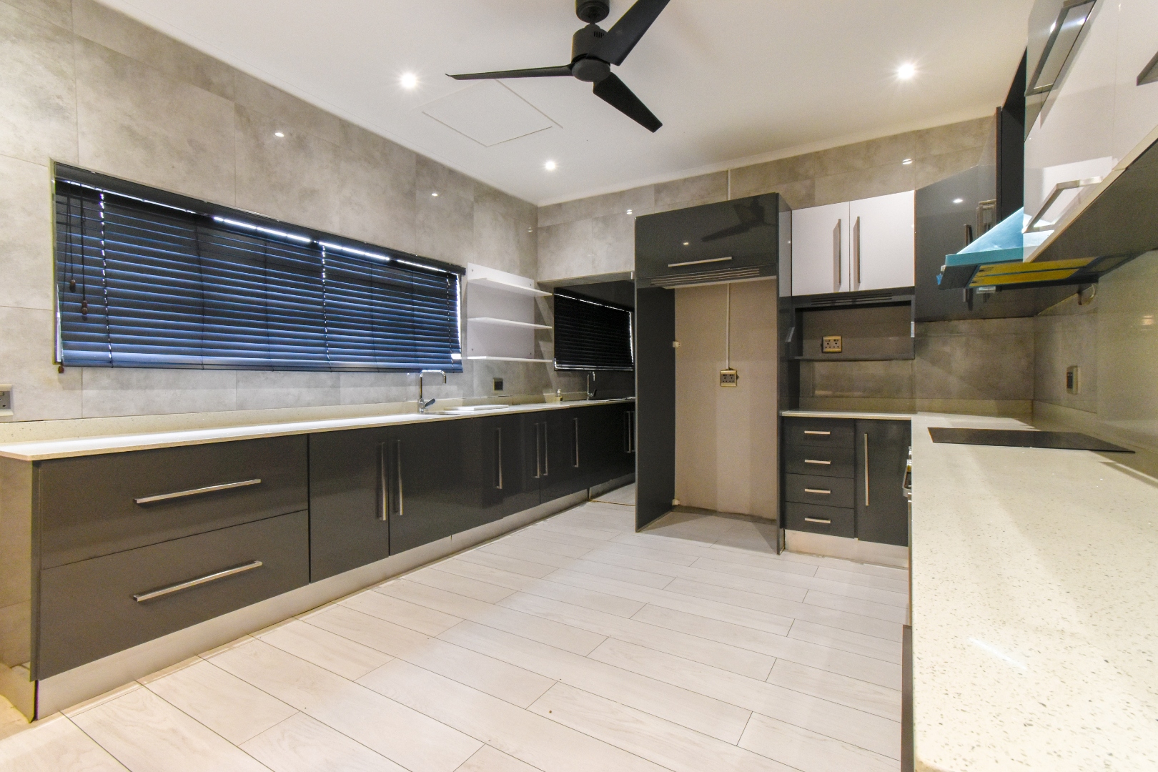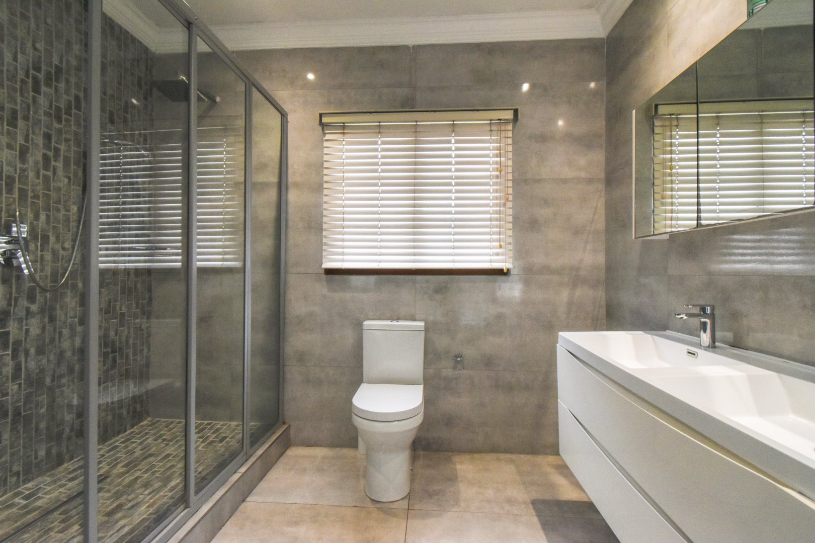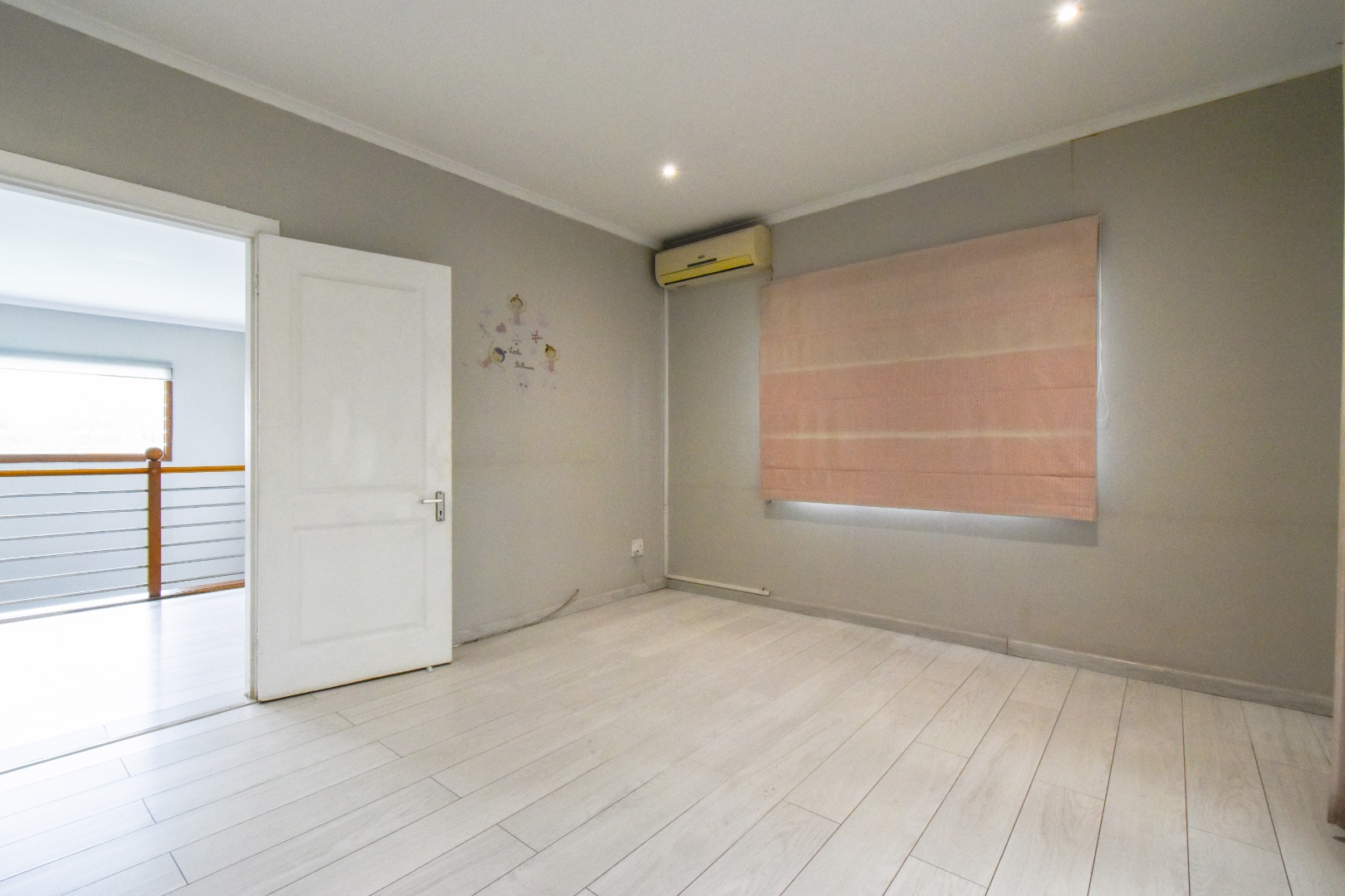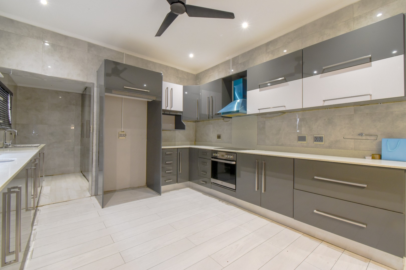 Discover a sophisticated modern home set in a quiet cul-de-sac in the sought-after Essenwood suburb of Durban. This striking double-storey residence features contemporary architecture with stone cladding, dark accents, and a statement balcony, surrounded by a beautifully maintained tropical garden with paved walkways and a children’s play area. Inside, spacious open-plan living areas are enhanced by light-toned flooring, recessed lighting, crown molding, and textured feature walls. A sleek wooden staircase leads to four luxurious bedrooms, two en suite, plus a full family bathroom and guest toilet. The home also offers three lounges, a dining area, a covered patio for outdoor entertaining, air conditioning, and two garages. Comprehensive security includes electric fencing, CCTV, an alarm system, 24-hour security, and controlled access, ensuring stylish, secure, and comfortable living in a prime location.