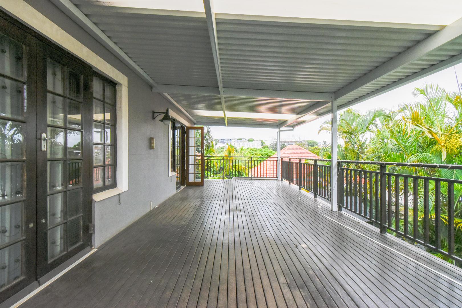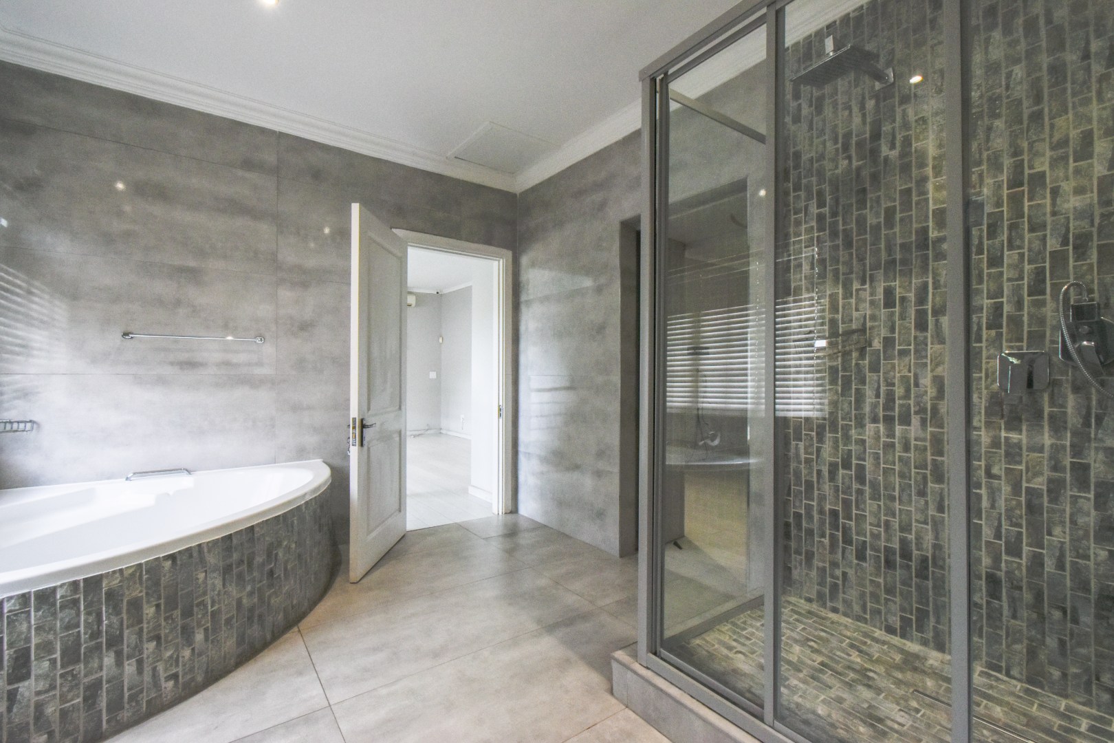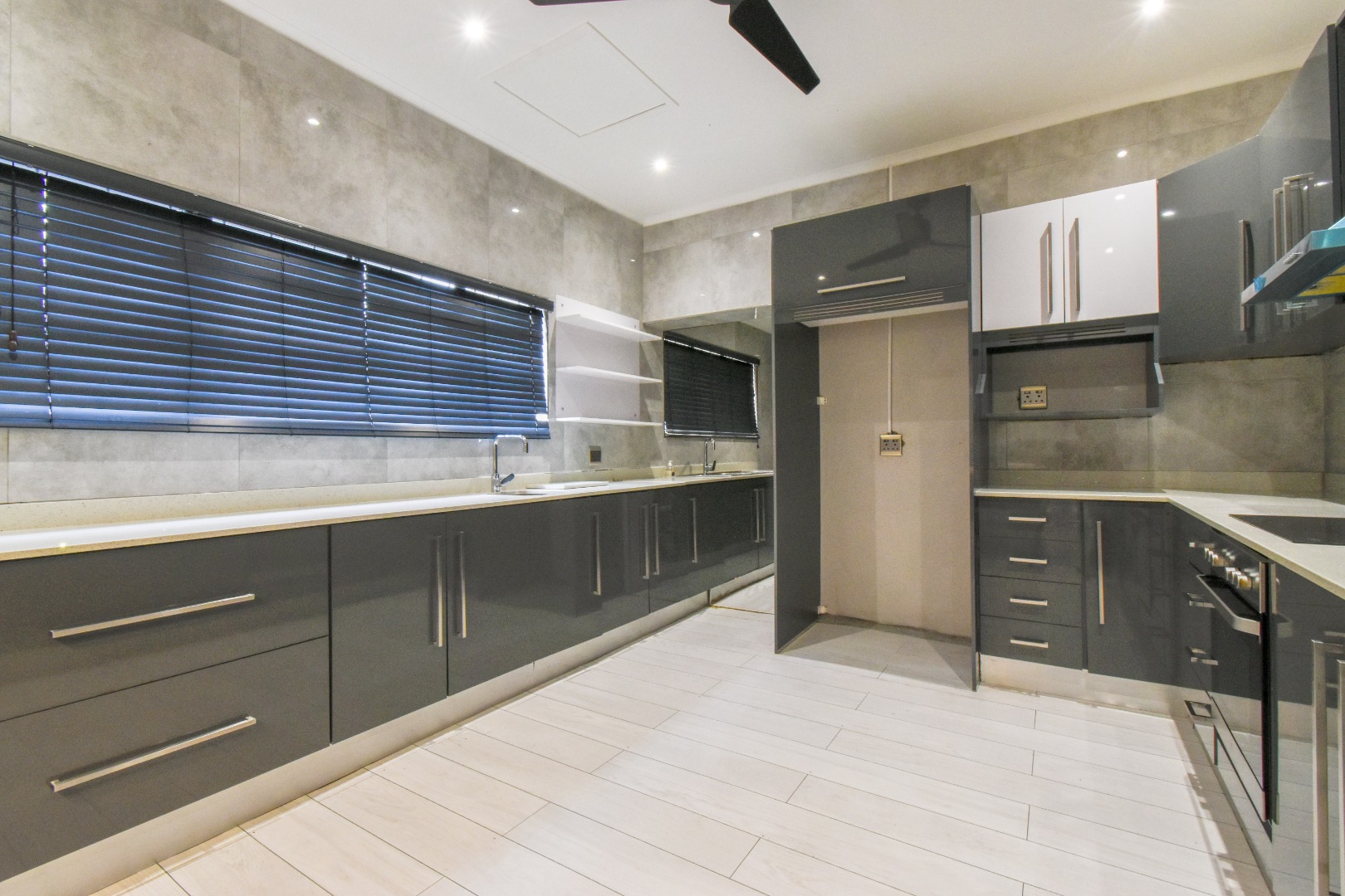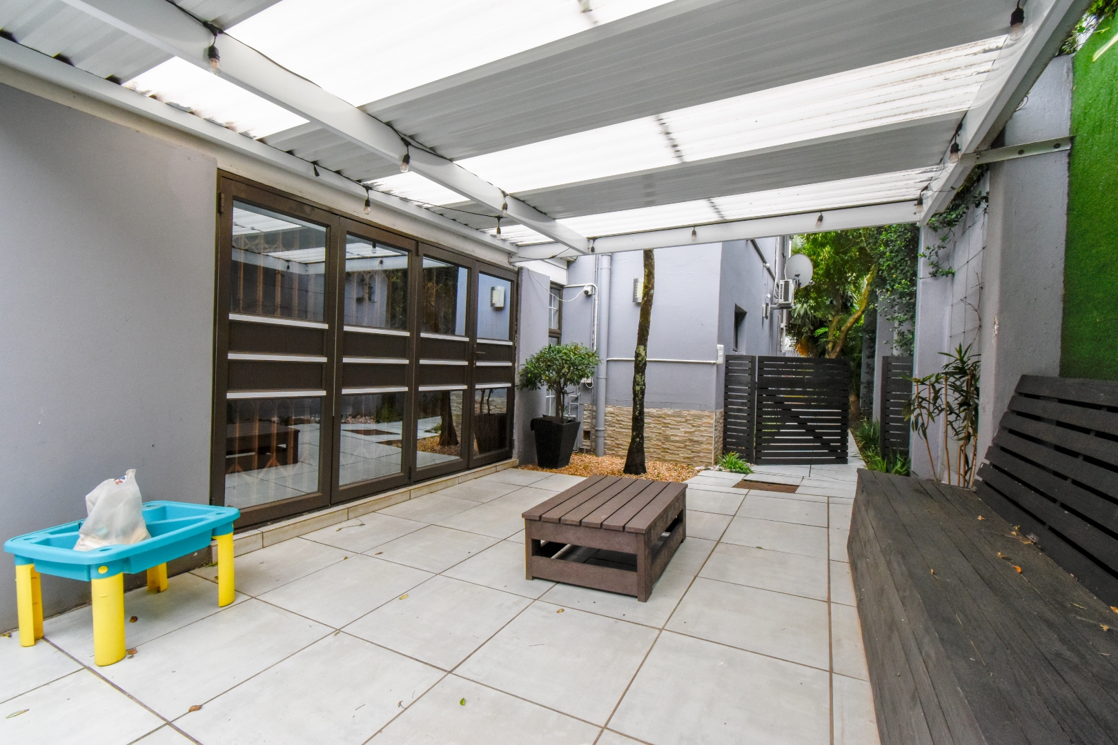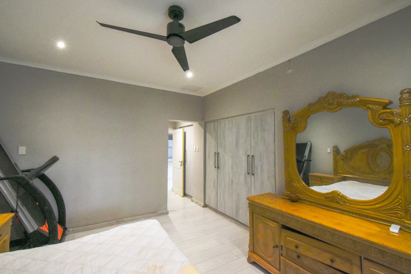 Discover a sophisticated modern home set in a quiet cul-de-sac in the sought-after Essenwood suburb of Durban. This striking double-storey residence features contemporary architecture with stone cladding, dark accents, and a statement balcony, surrounded by a beautifully maintained tropical garden with paved walkways and a children’s play area. Inside, spacious open-plan living areas are enhanced by light-toned flooring, recessed lighting, crown molding, and textured feature walls. A sleek wooden staircase leads to four luxurious bedrooms, two en suite, plus a full family bathroom and guest toilet. The home also offers three lounges, a dining area, a covered patio for outdoor entertaining, air conditioning, and two garages. Comprehensive security includes electric fencing, CCTV, an alarm system, 24-hour security, and controlled access, ensuring stylish, secure, and comfortable living in a prime location.