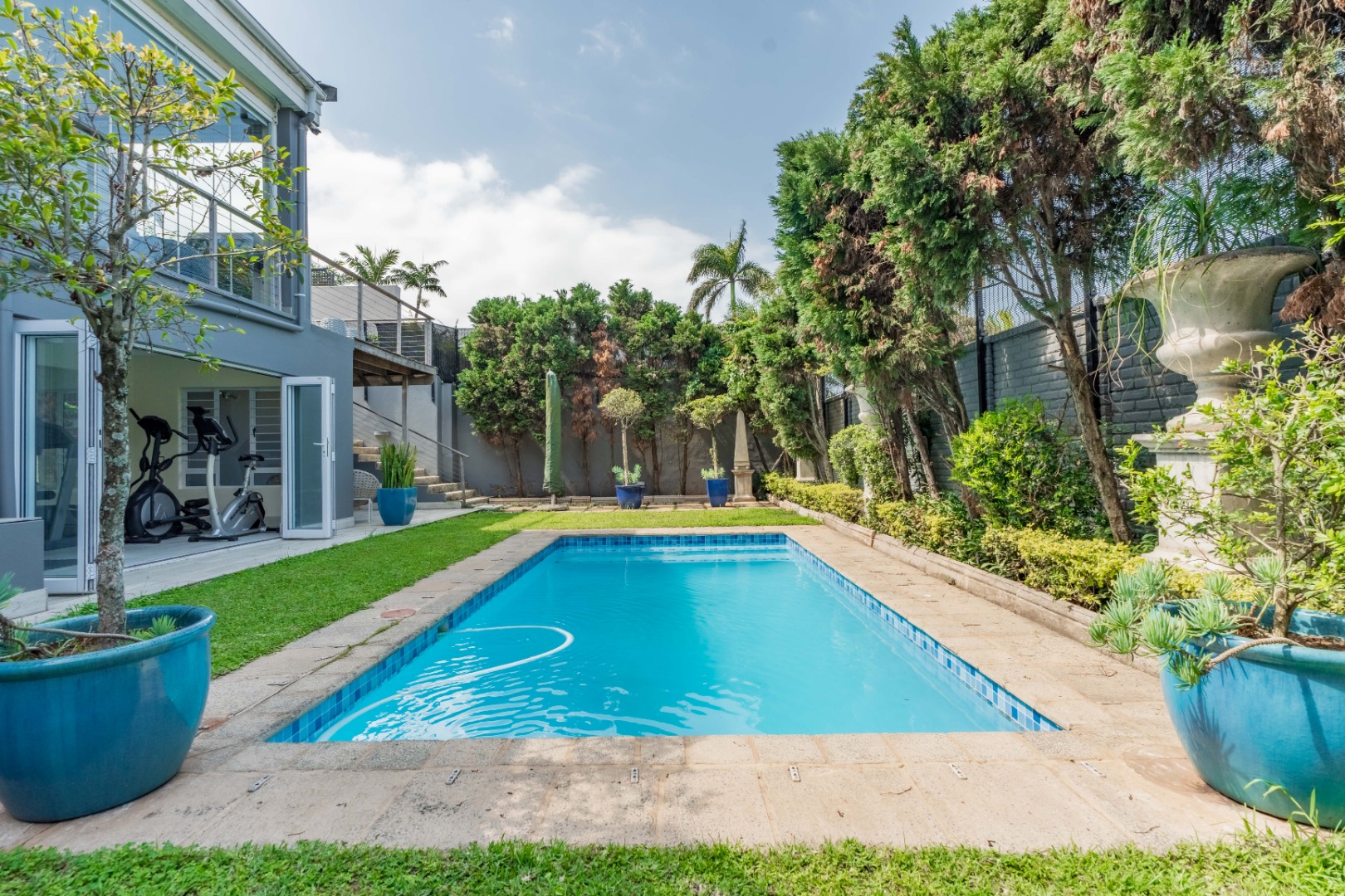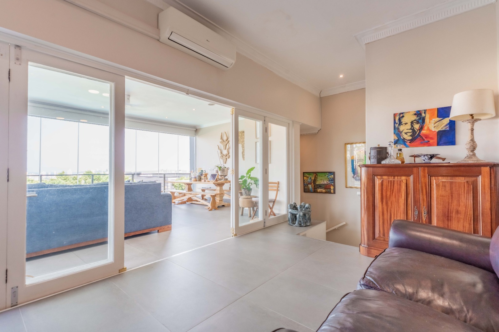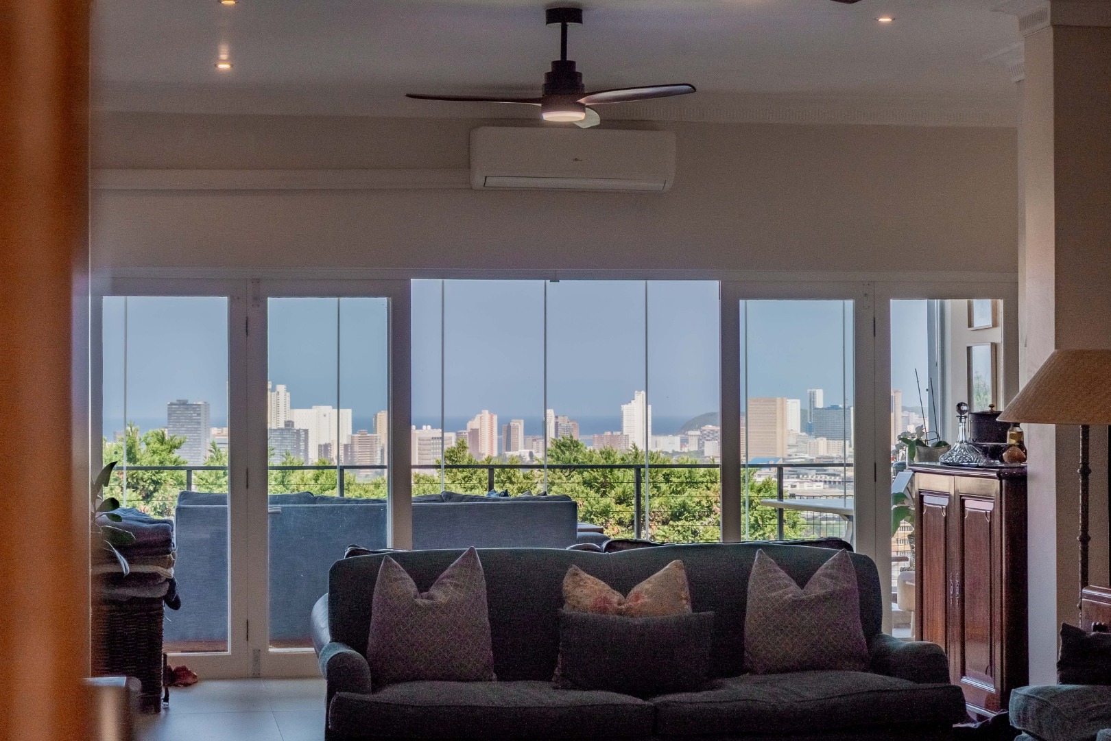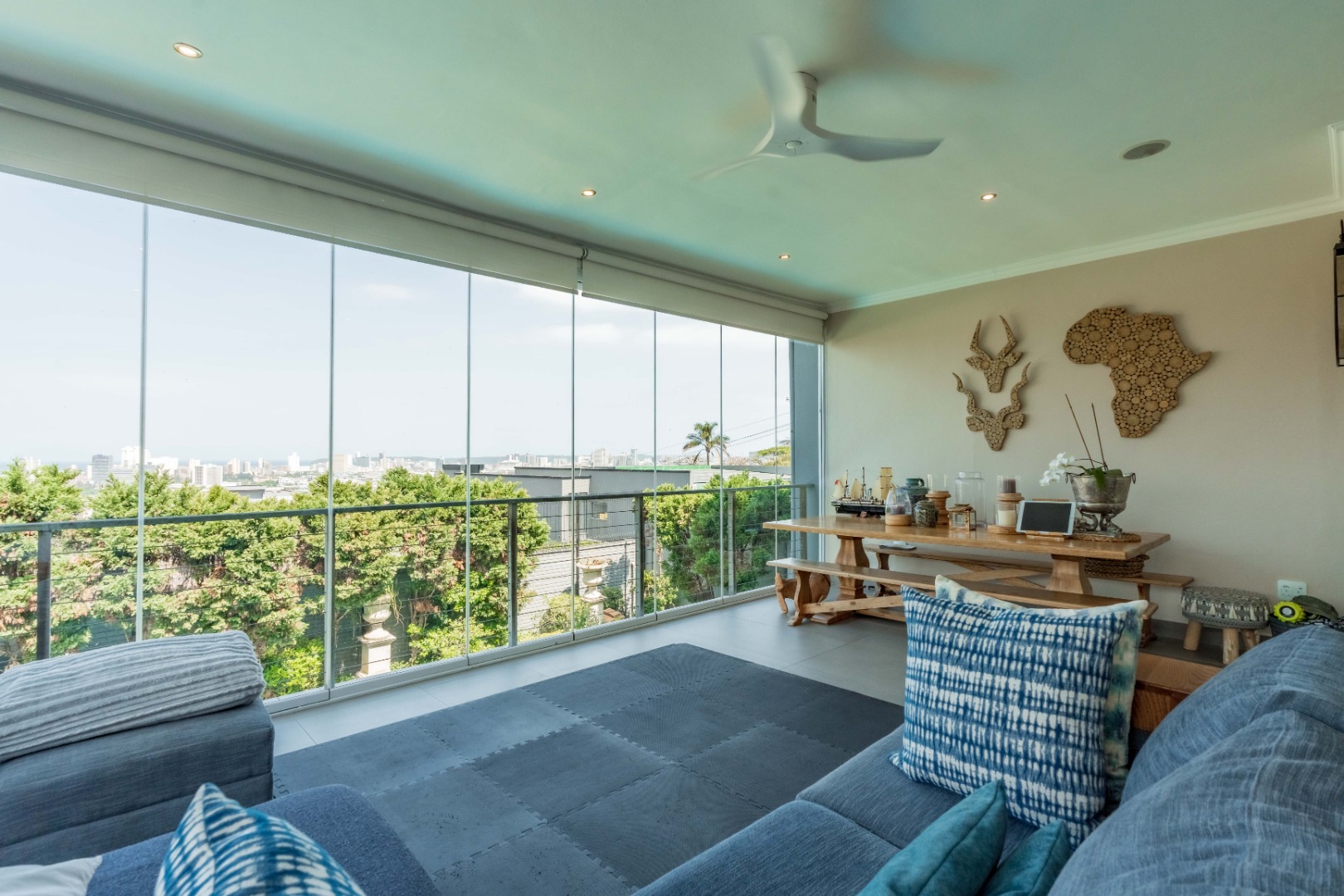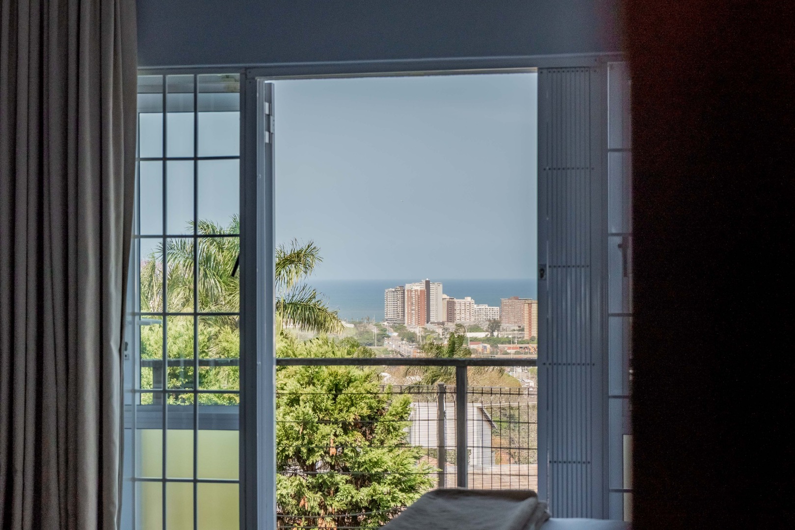 The sun lounge, enclosed with glass sliding doors, opens onto a generous entertainment patio overlooking the newly resurfaced pool, creating an ideal space to unwind and take in Durban’s breath-taking skyline.