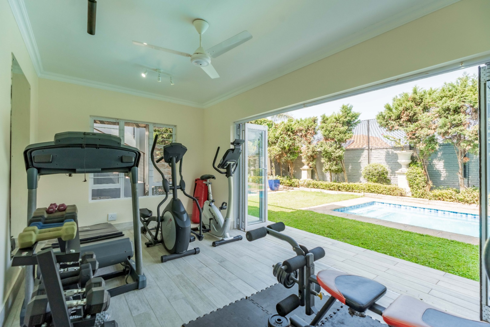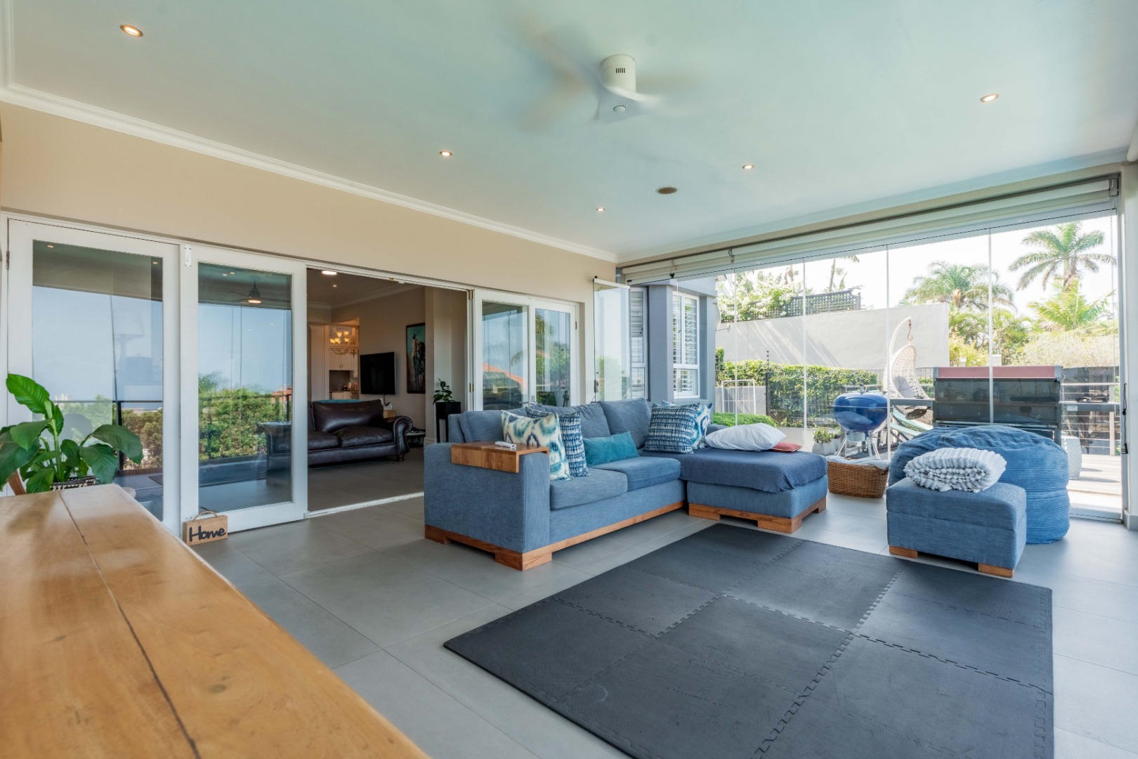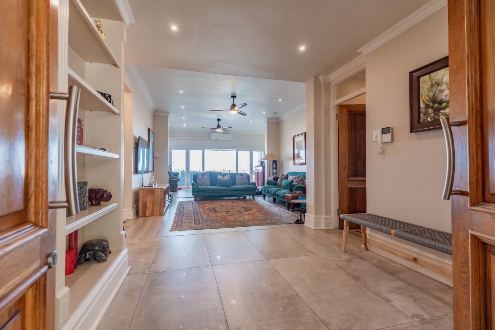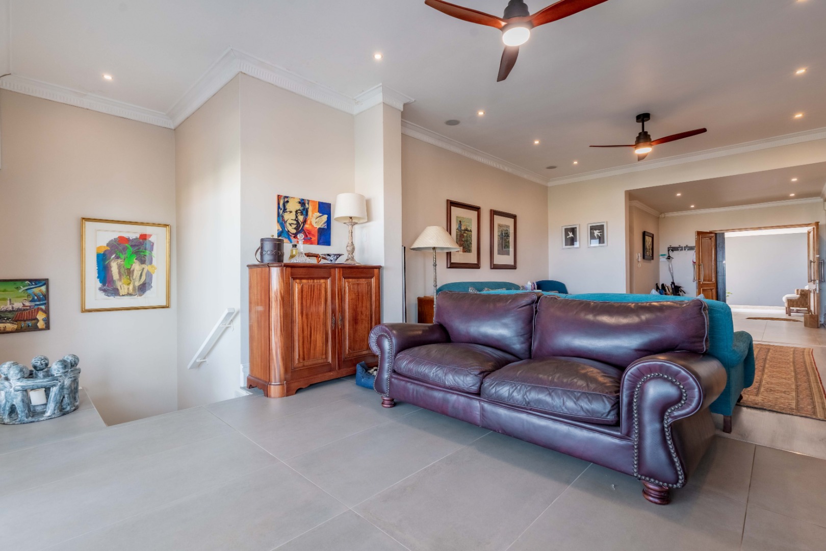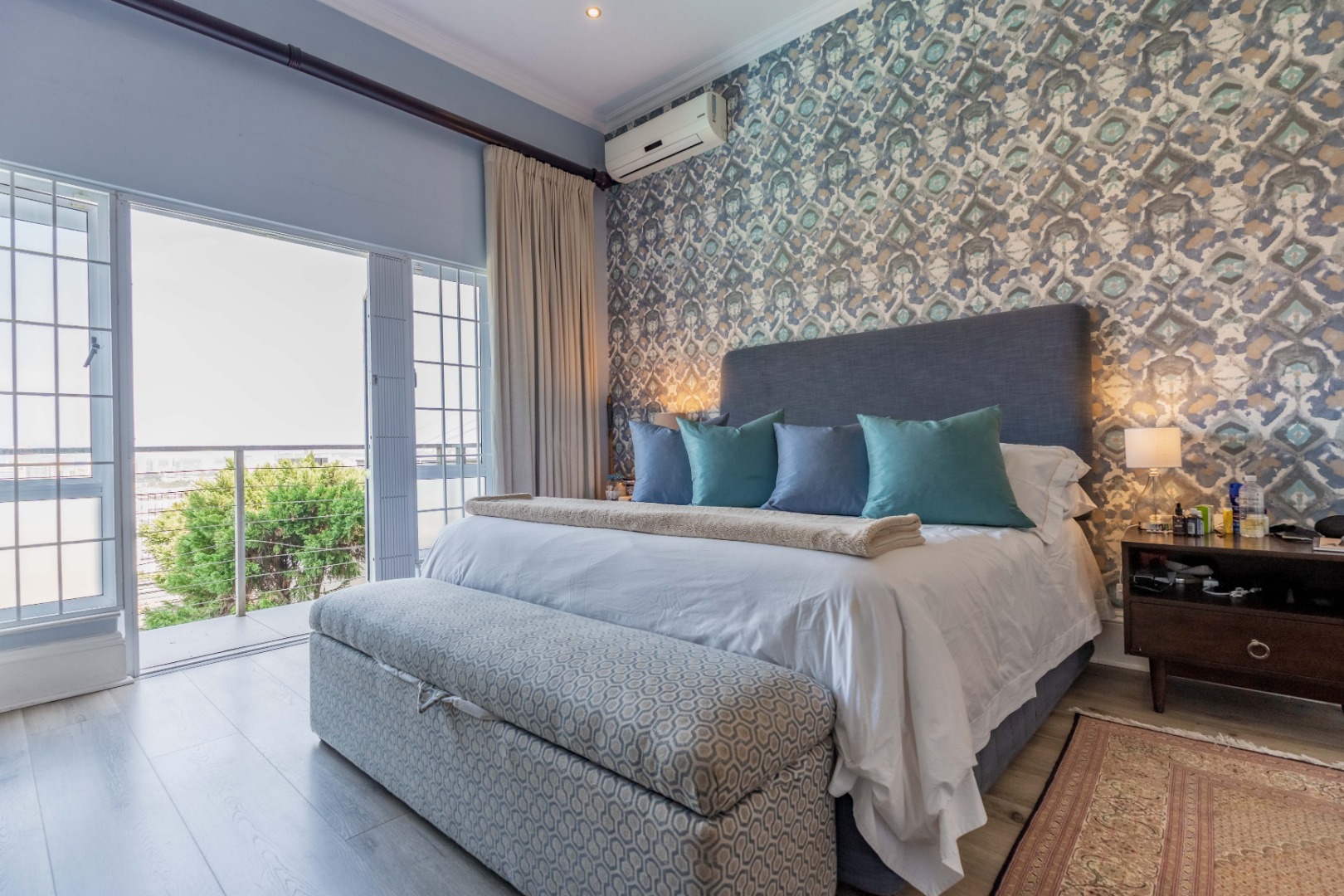 The sun lounge, enclosed with glass sliding doors, opens onto a generous entertainment patio overlooking the newly resurfaced pool, creating an ideal space to unwind and take in Durban’s breath-taking skyline.