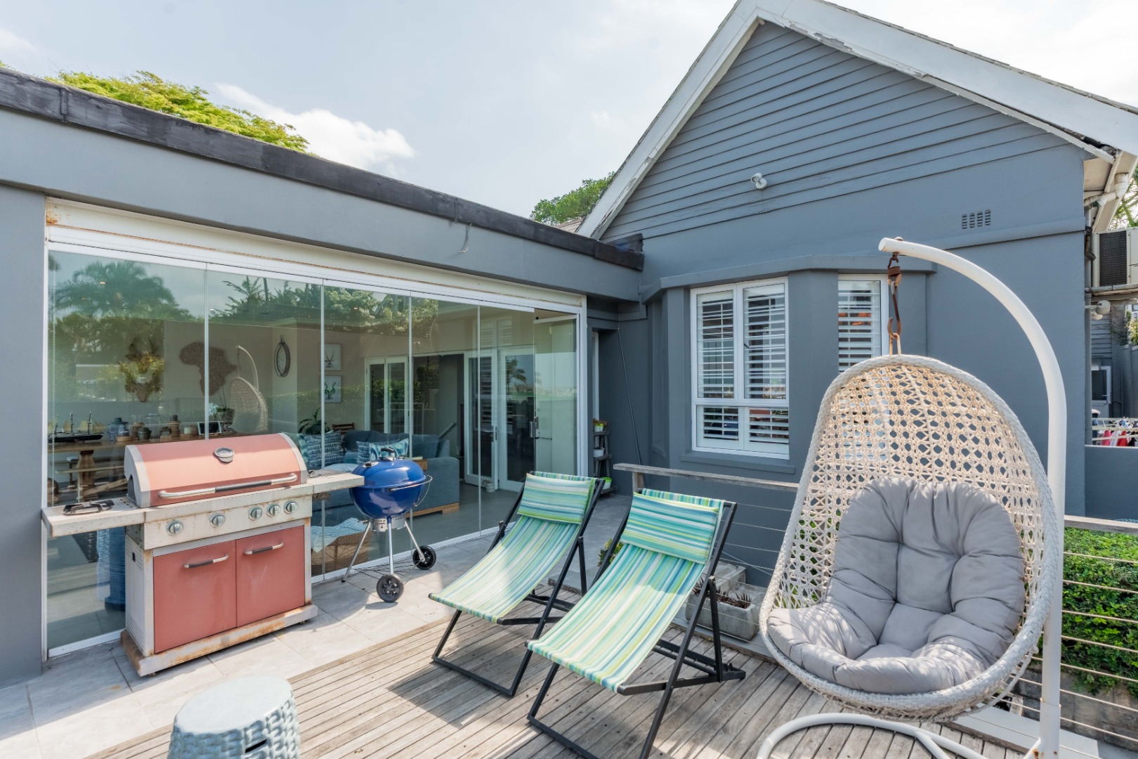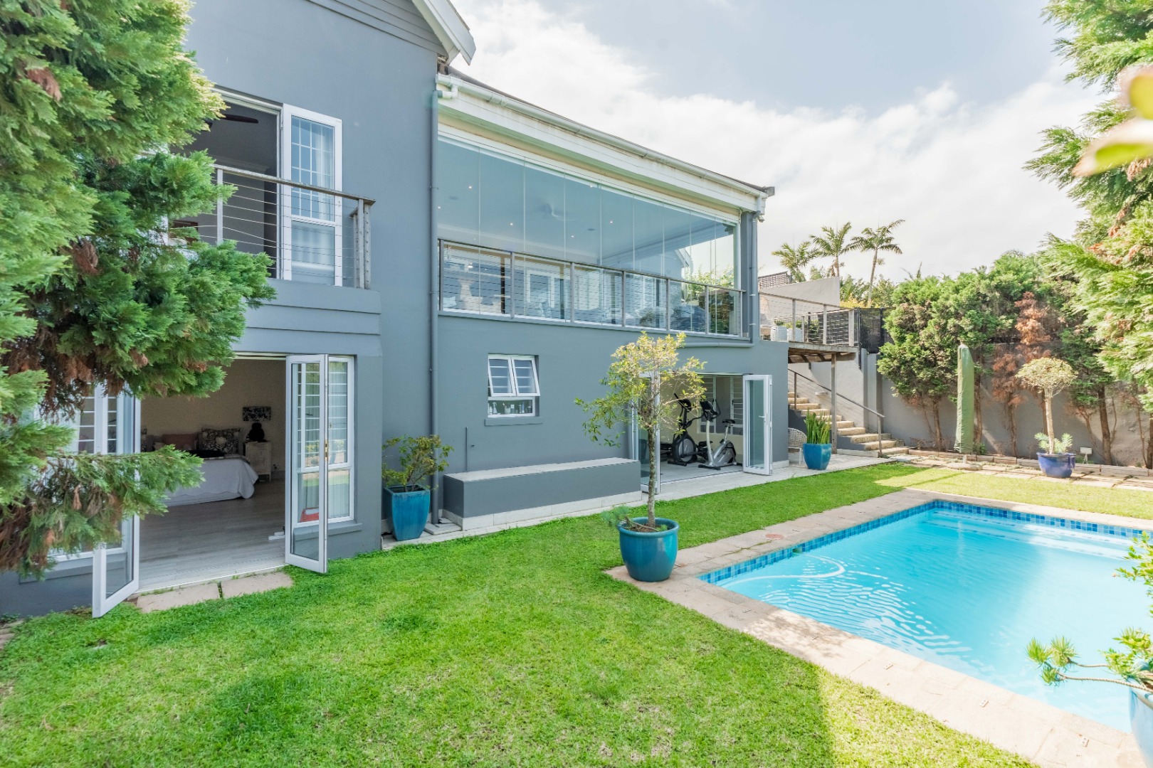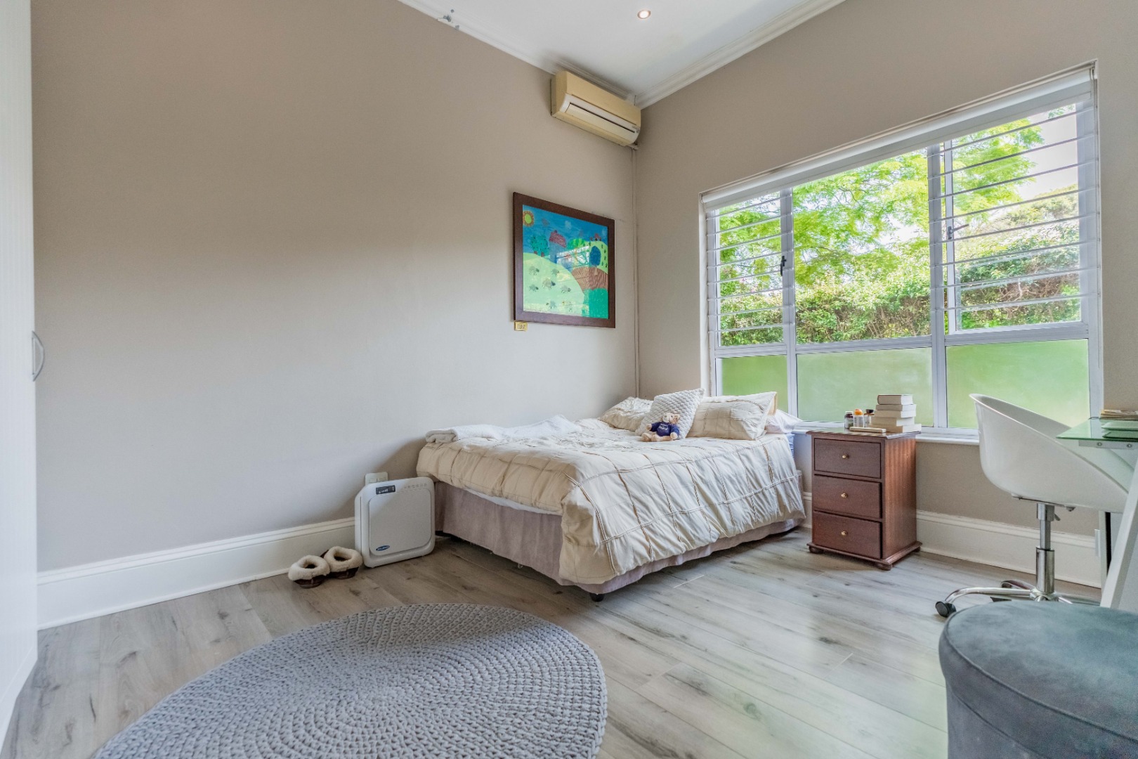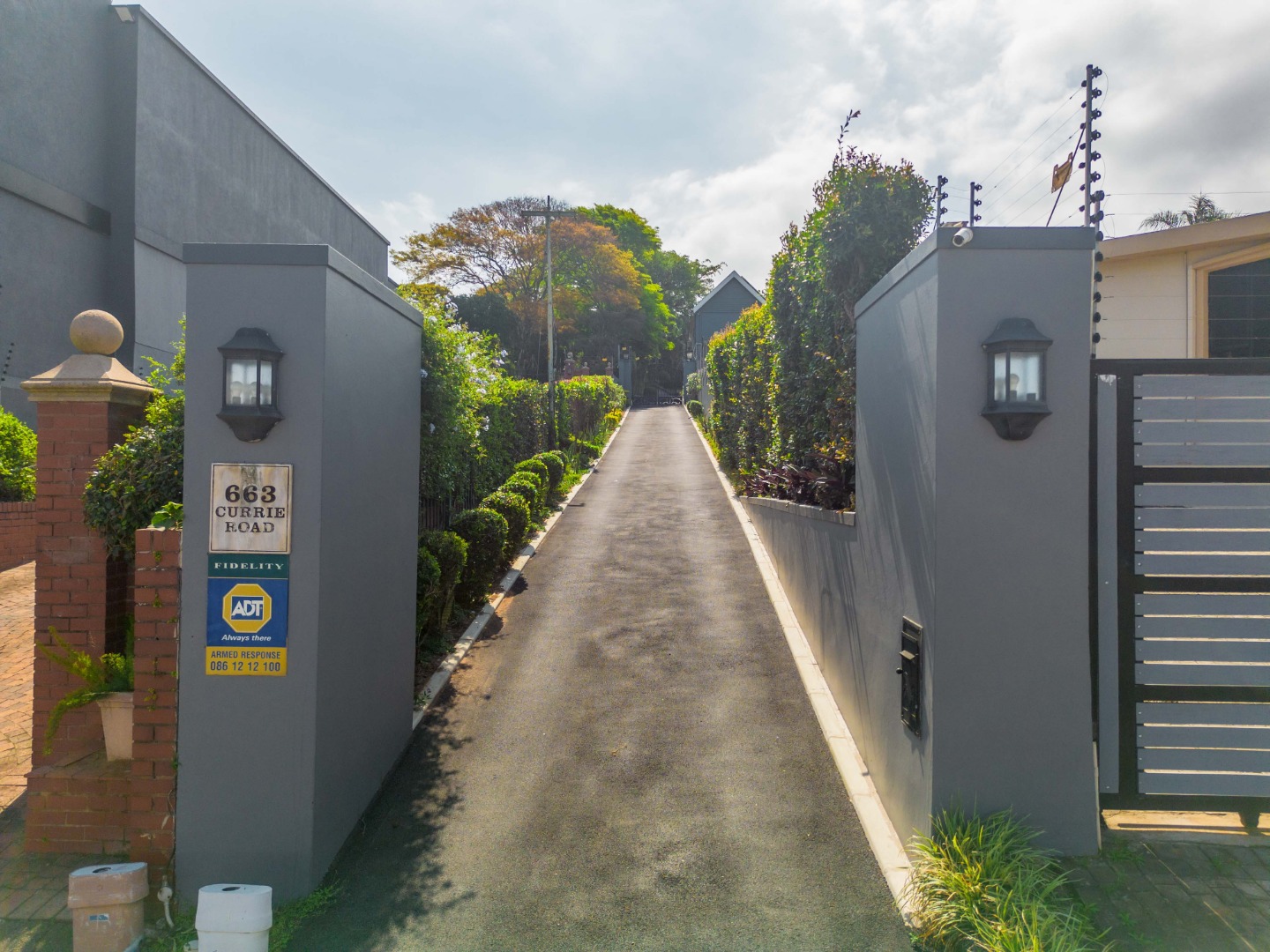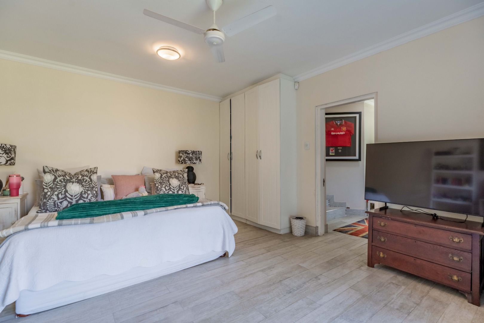The sun lounge, enclosed with glass sliding doors, opens onto a generous entertainment patio overlooking the newly resurfaced pool, creating an ideal space to unwind and take in Durban’s breath-taking skyline.