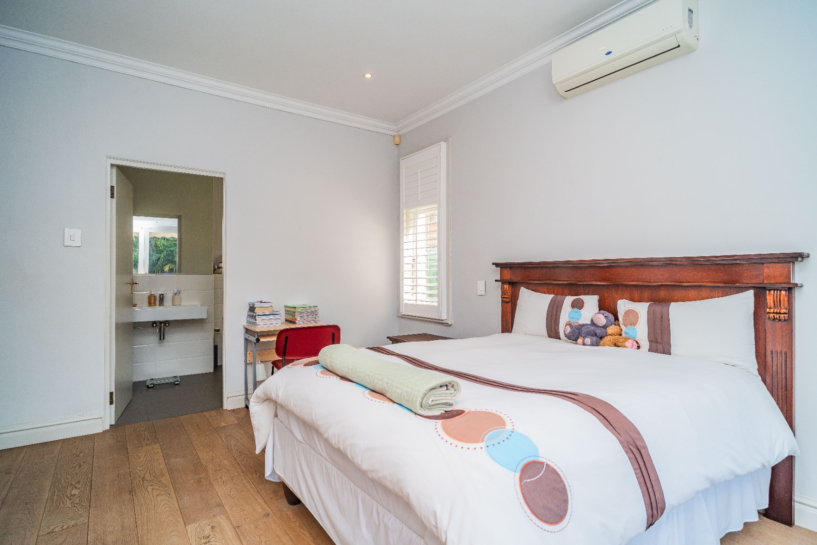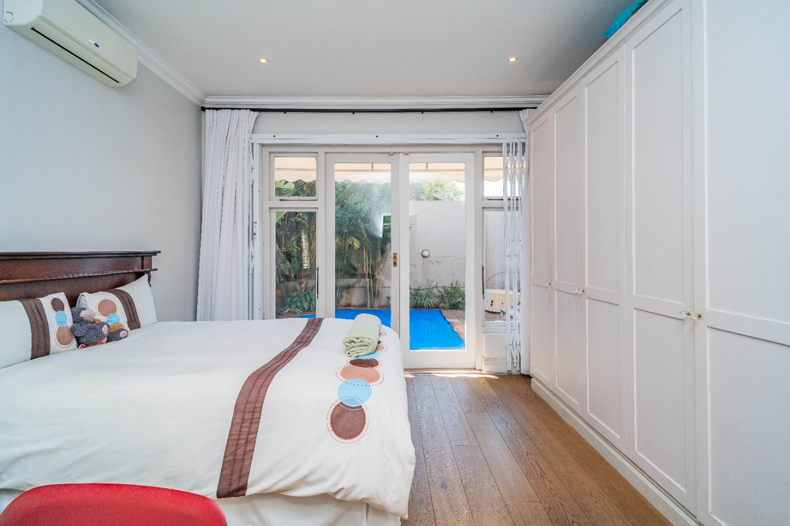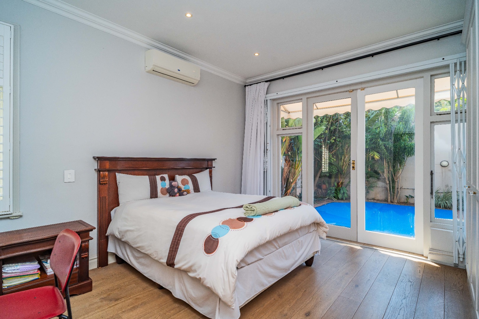 There are two spacious bedrooms, both with split-level air-conditioning, ample built-in cupboards, and stylish en-suite bathrooms. The main bedroom opens onto a decked patio through elegant French doors.