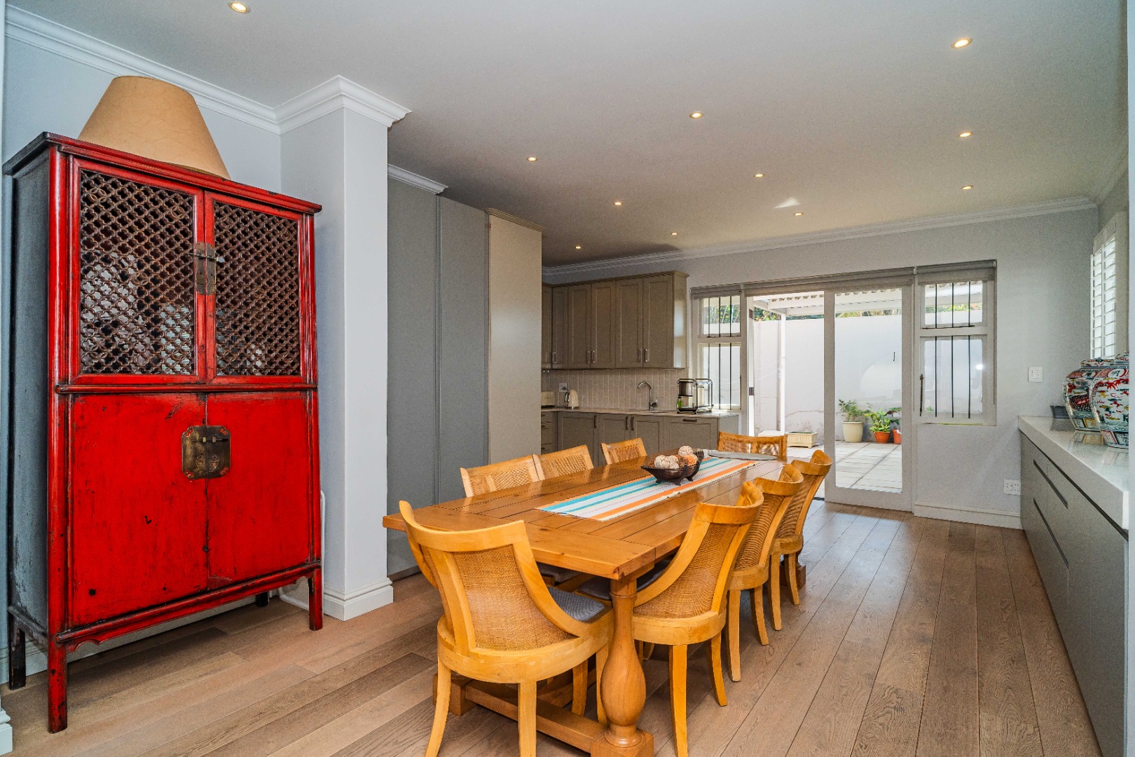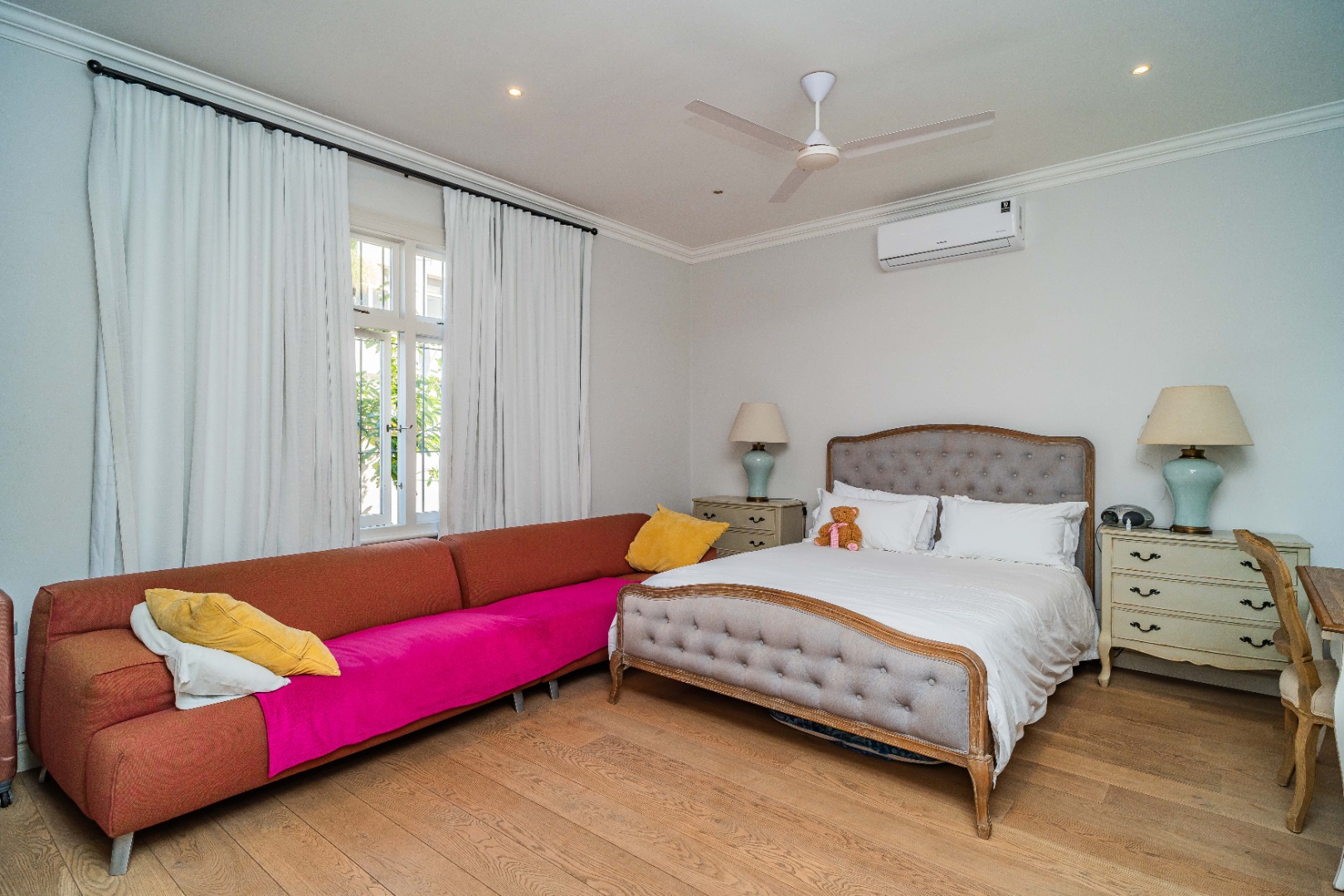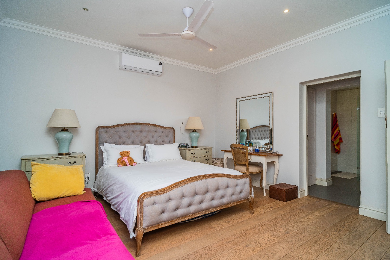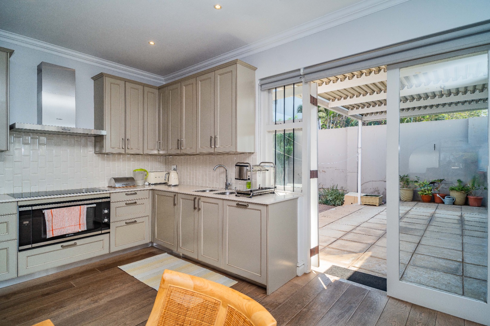 There are two spacious bedrooms, both with split-level air-conditioning, ample built-in cupboards, and stylish en-suite bathrooms. The main bedroom opens onto a decked patio through elegant French doors.