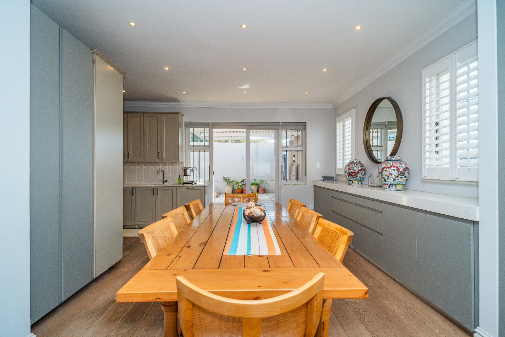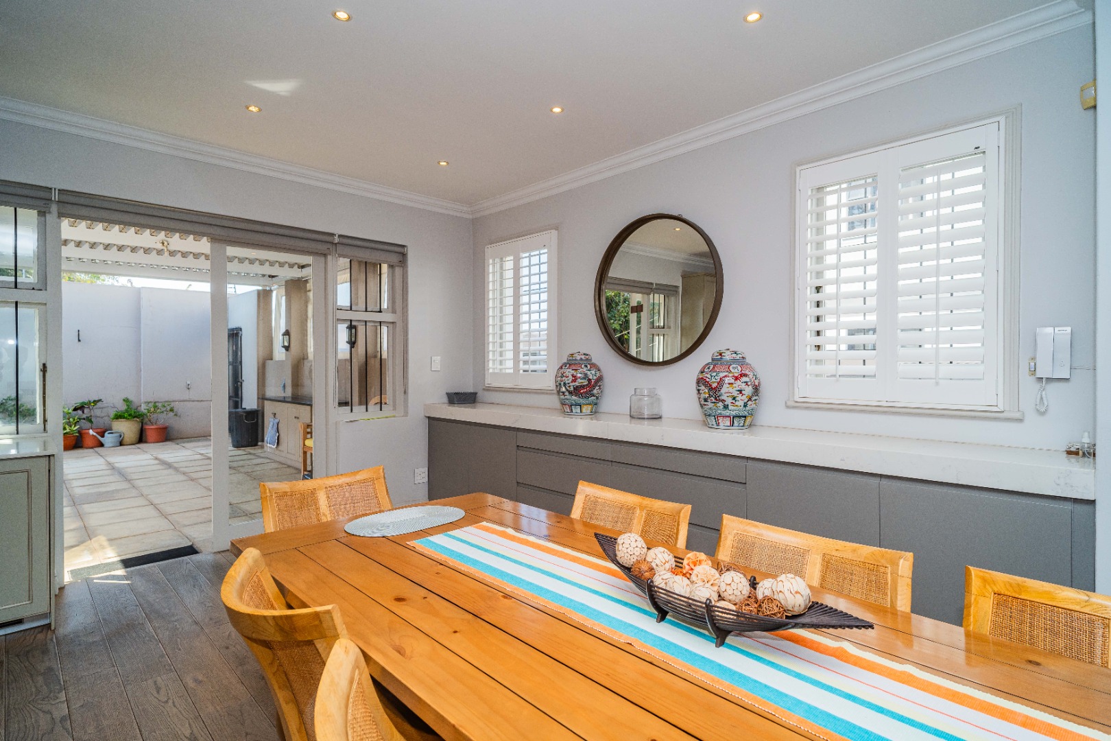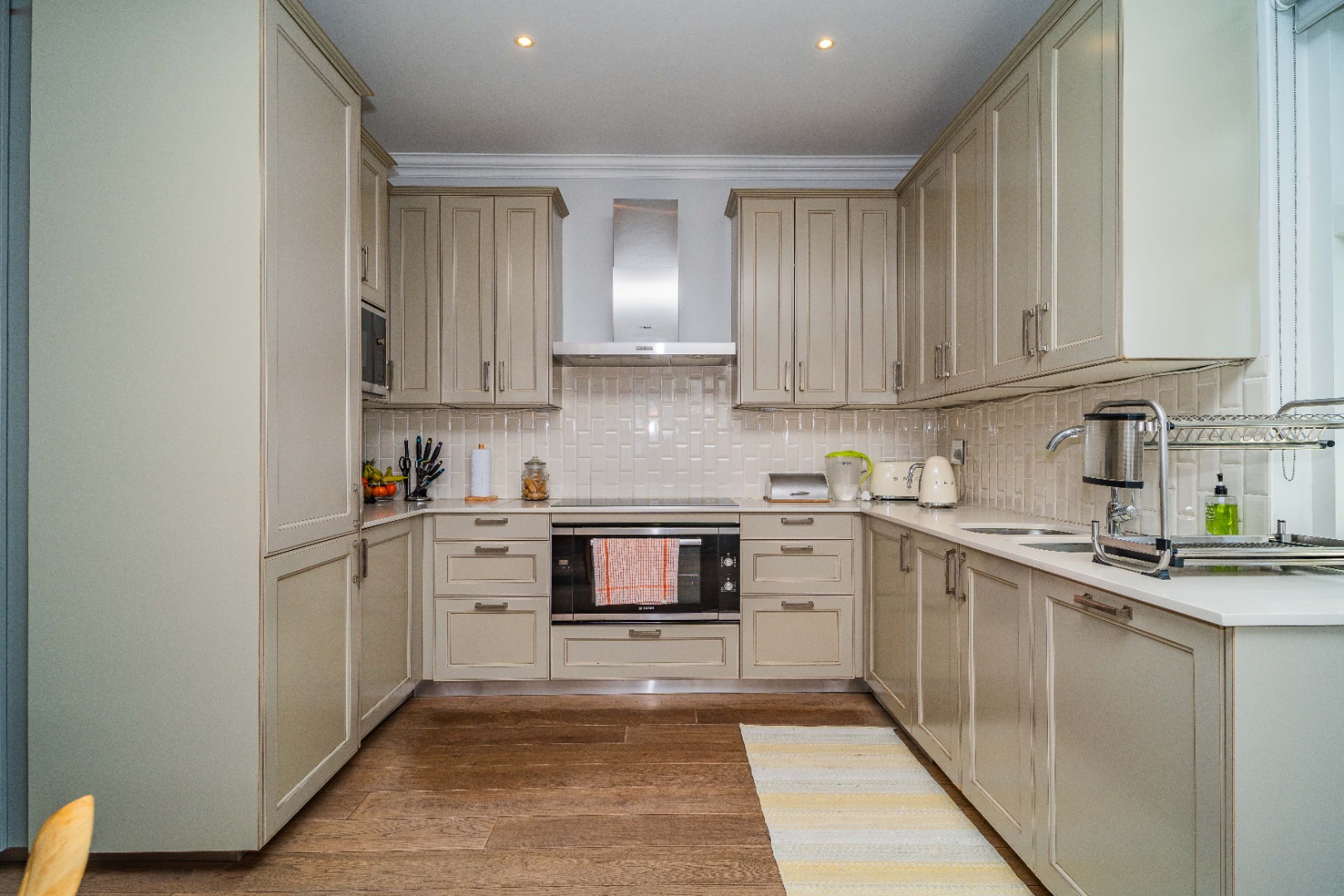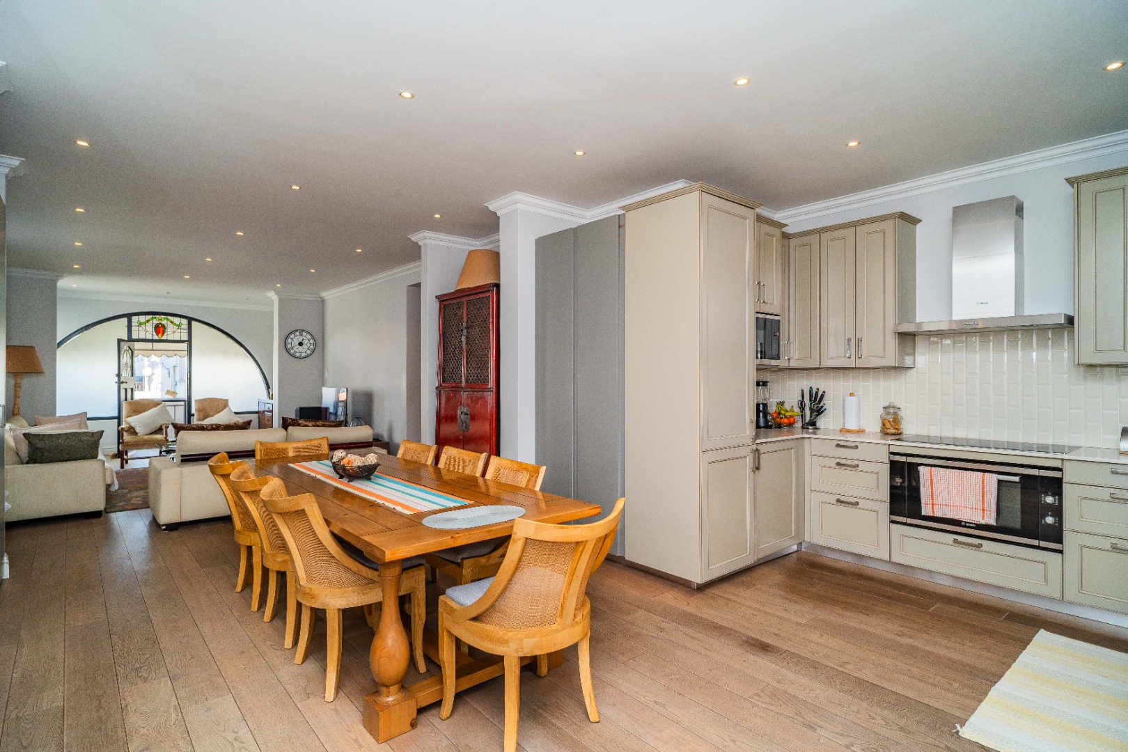 Gourmet kitchen, featuring marble stone countertops, an oven, hob, extractor fan, and integrated fridge/freezer & dishwasher. Expansive dining area with a built-in server, marble stone countertops, and soft-touch drawers.