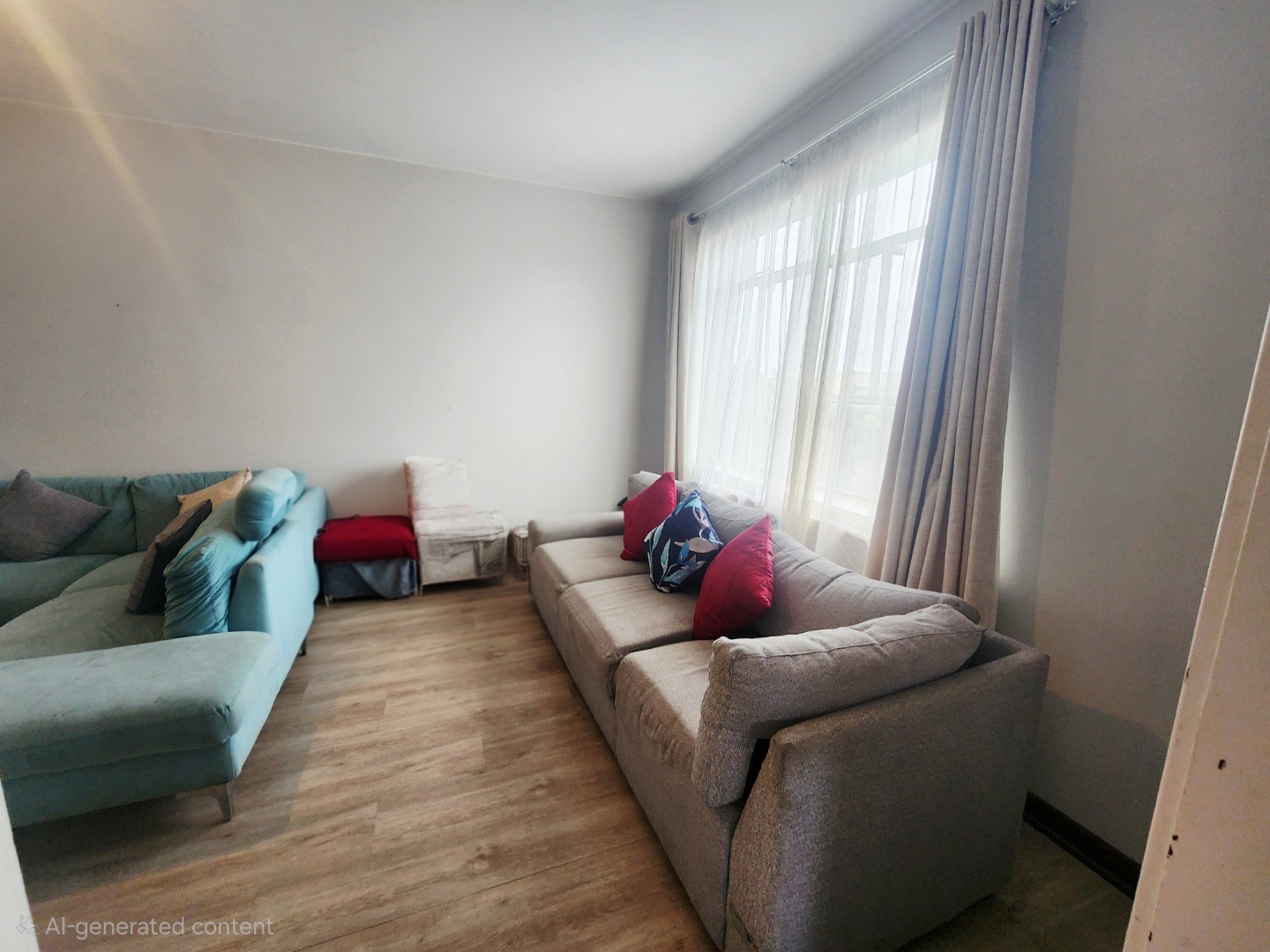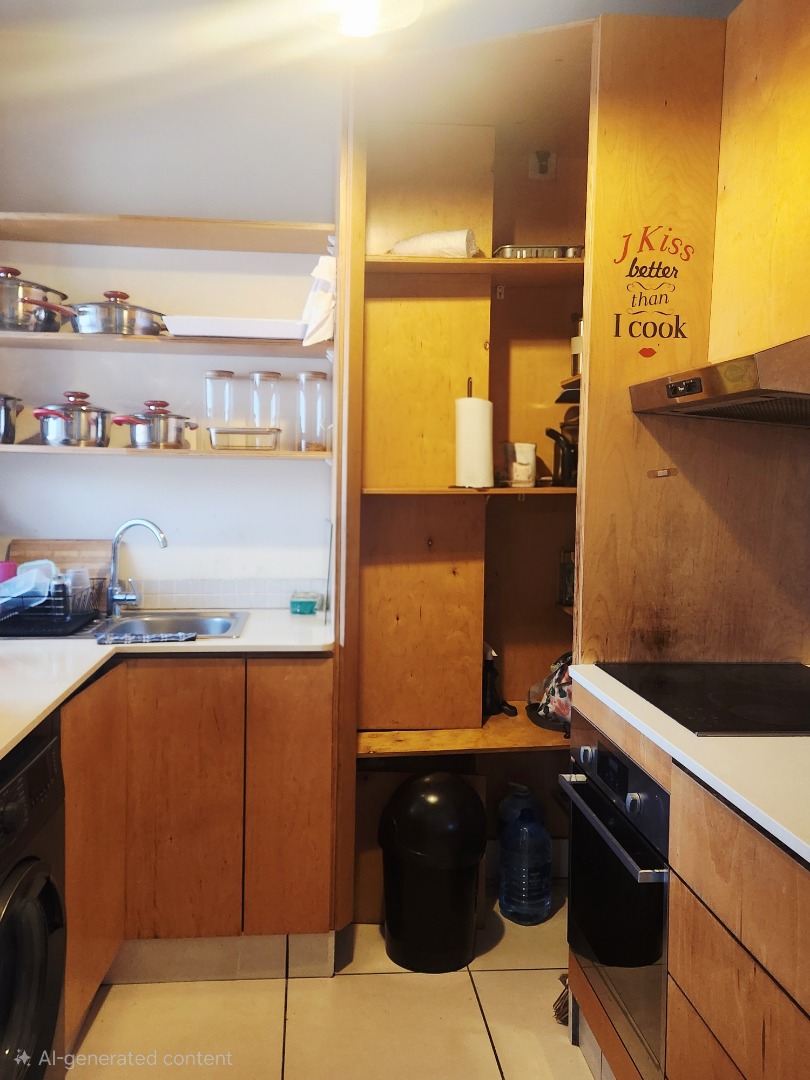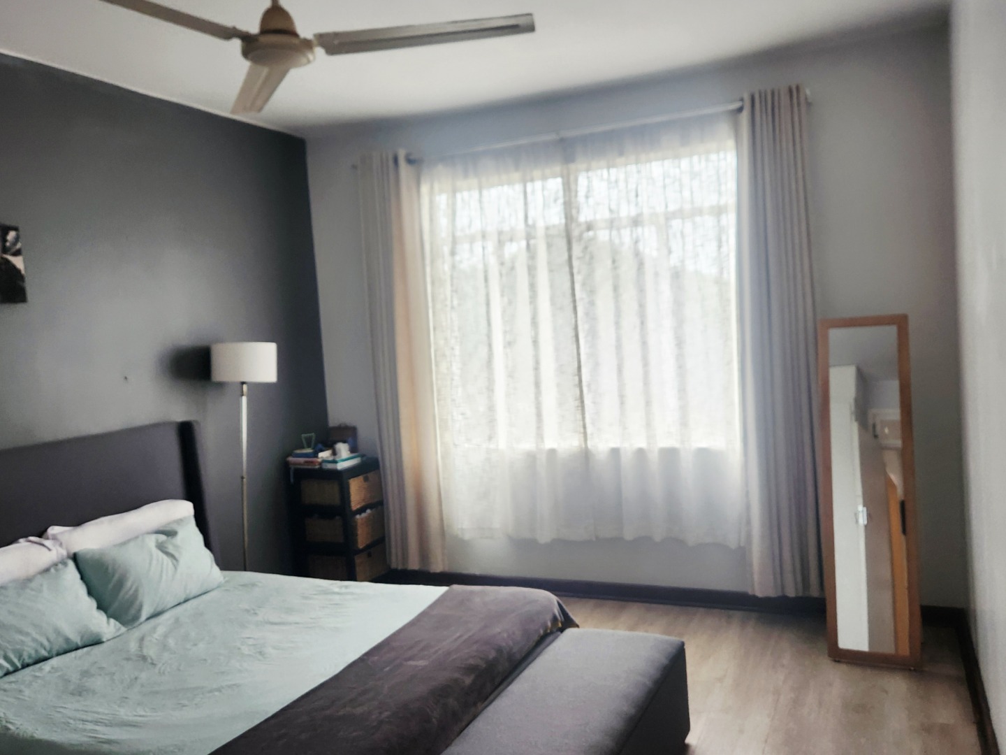 Sleek laminate flooring runs throughout. The flat offers two large bedrooms plus a versatile 0.5 room — ideal as a home office, nursery, or guest nook. Both main bedrooms feature ceiling fans and generous built-in closets. The full bathroom includes both a shower and bath, with the added convenience of a separate toilet.