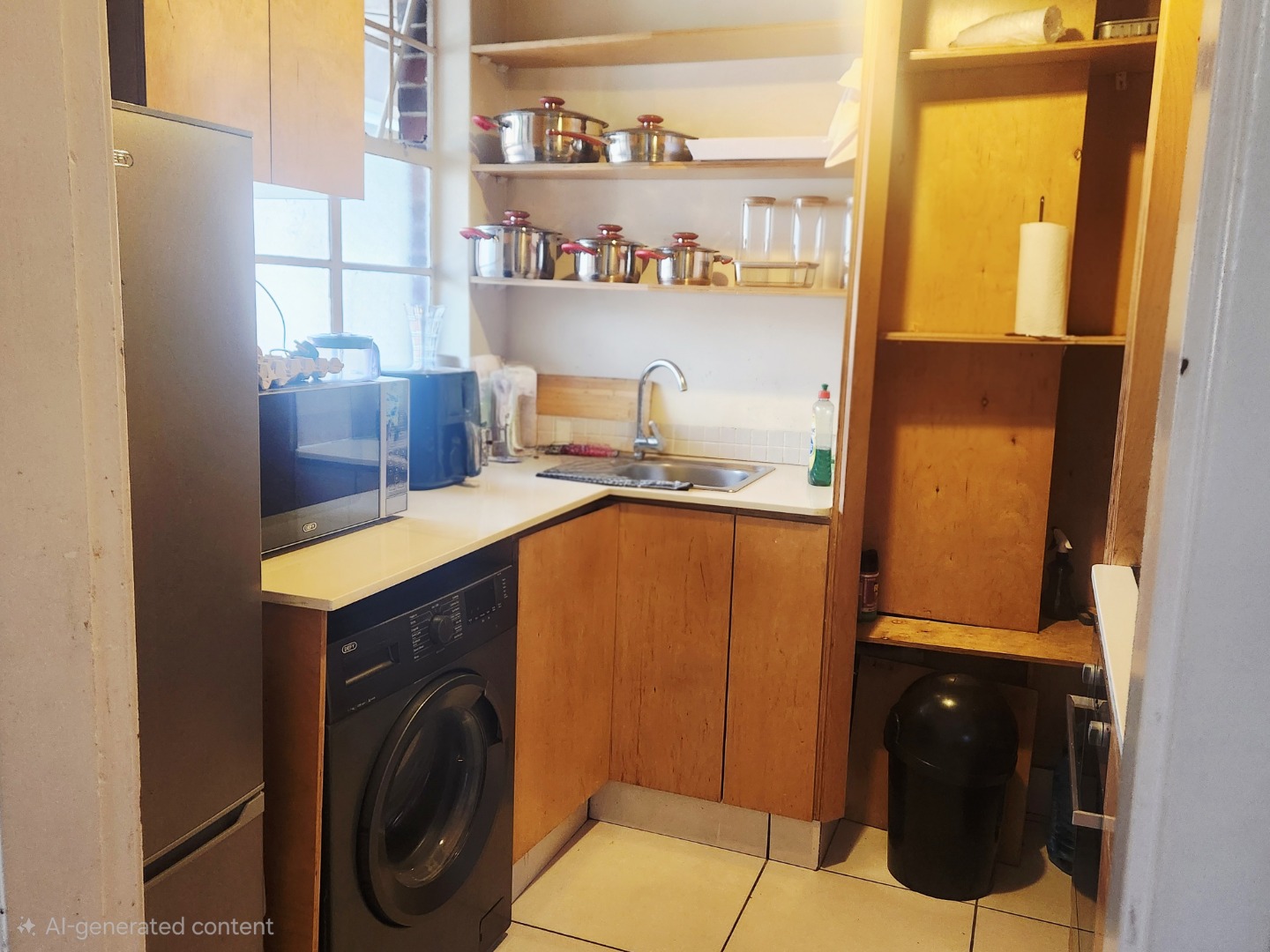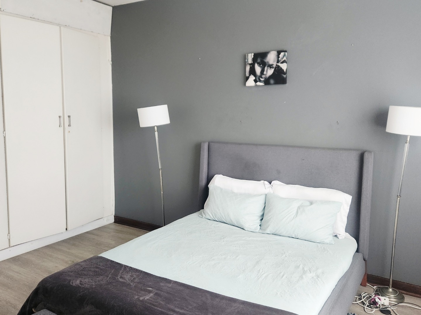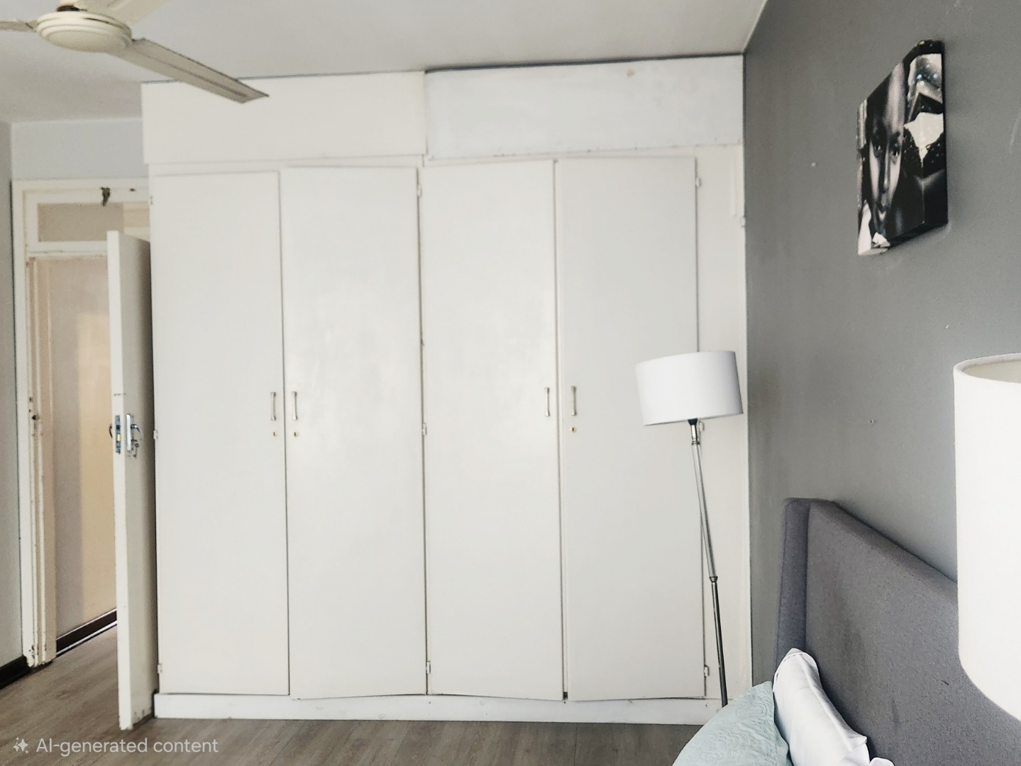 Sleek laminate flooring runs throughout. The flat offers two large bedrooms plus a versatile 0.5 room — ideal as a home office, nursery, or guest nook. Both main bedrooms feature ceiling fans and generous built-in closets. The full bathroom includes both a shower and bath, with the added convenience of a separate toilet.