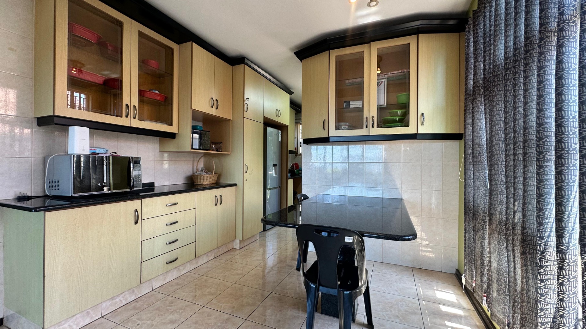 The interior presents an open-concept layout, seamlessly connecting the living and dining areas, enhanced by natural light and polished wooden flooring. The functional kitchen is equipped with ample light wood cabinetry, dark granite-look countertops, tiled floors and backsplash, a built-in oven and stovetop, and a double stainless steel sink. A convenient built-in eating area adds to its practicality, while air conditioning ensures comfort throughout.