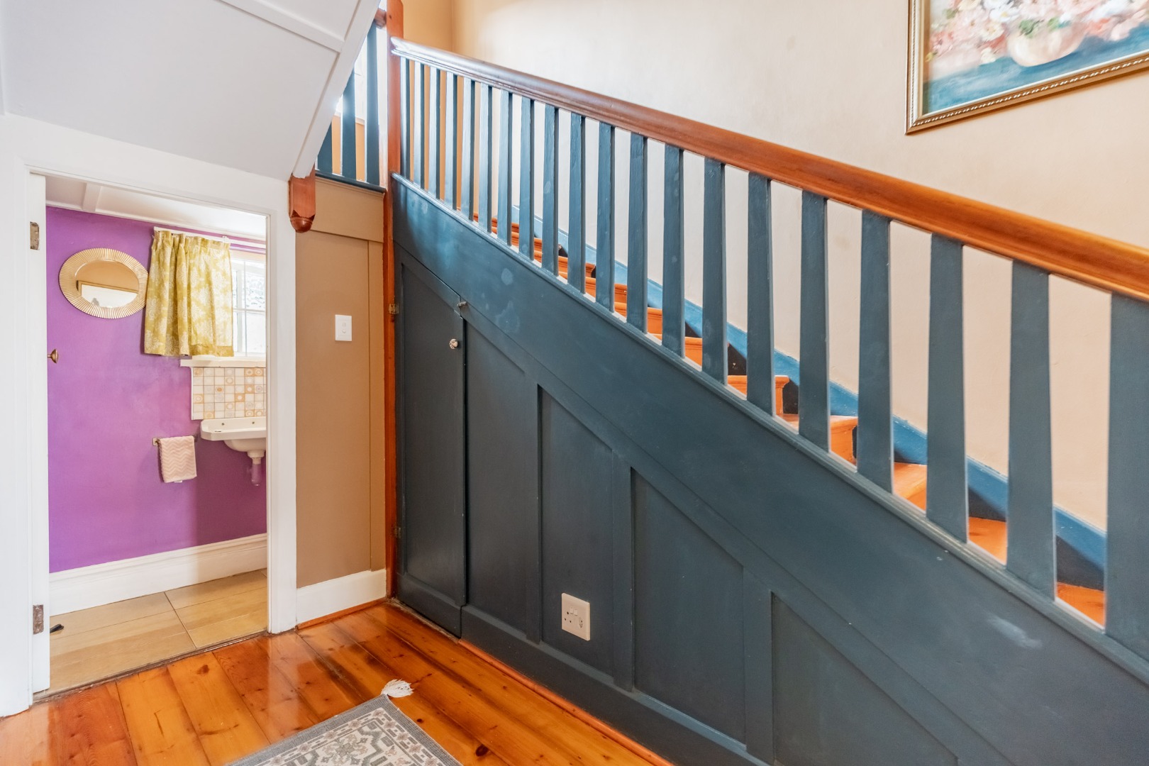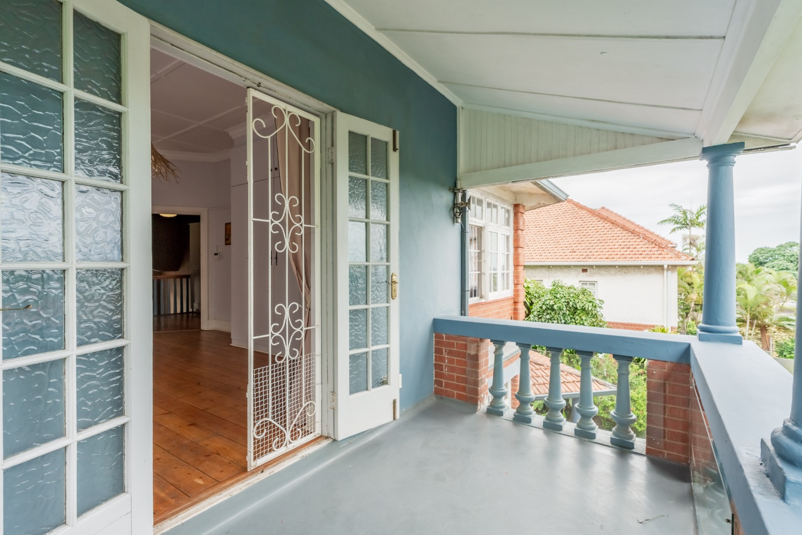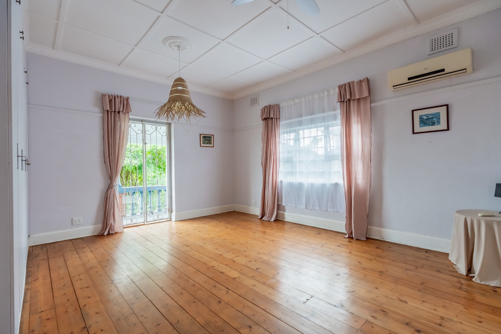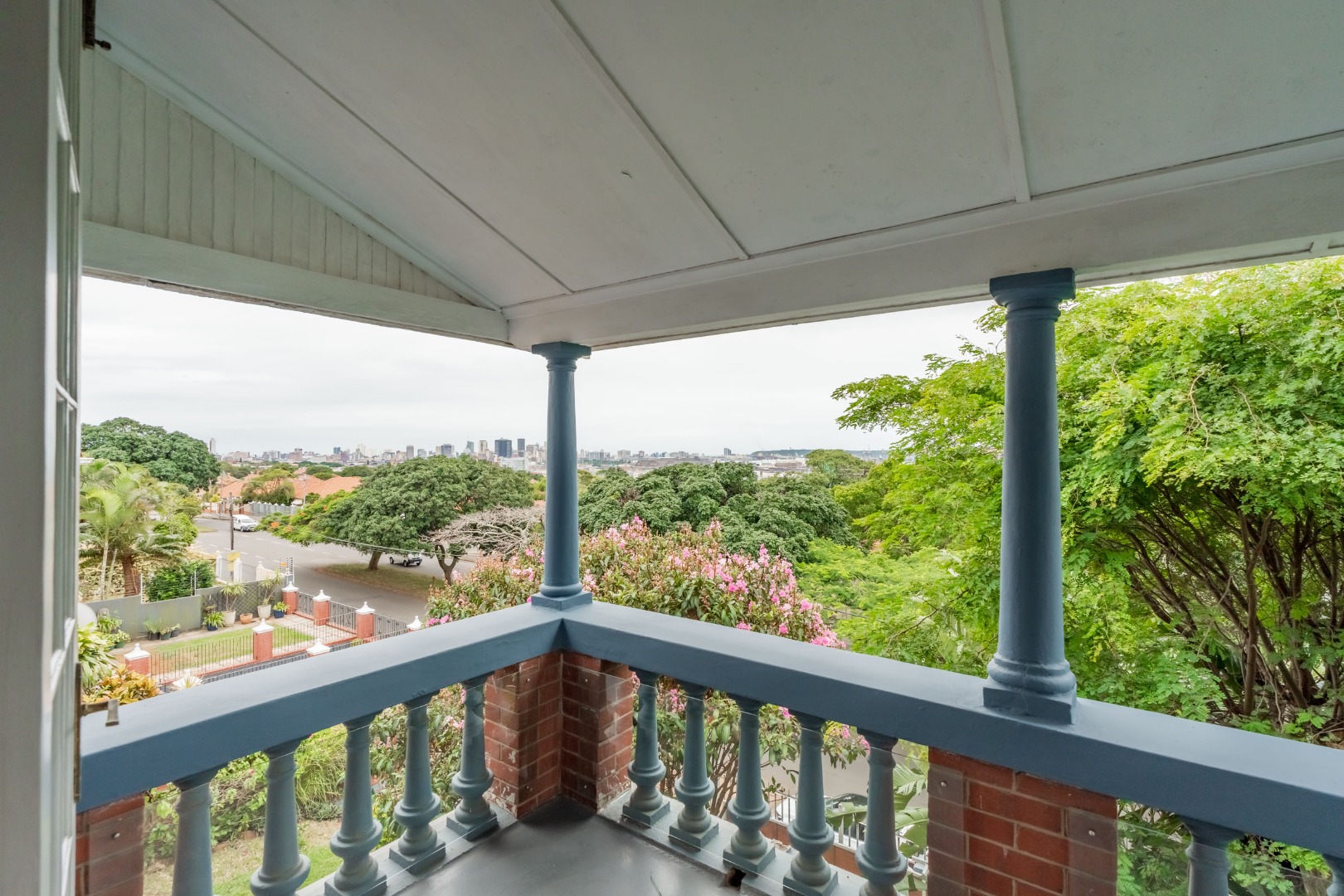Well-maintained wooden floors run throughout the home, complemented by a grand wooden staircase leading upstairs. The upper level offers three bedrooms and two bathrooms. Two of the bedrooms are air-conditioned and fitted with built-in cupboards. The main bedroom has doors that open to a balcony with a lovely view towards the harbour. One bathroom is very spacious and has a classic ball and claw bath, shower, basin and loo, and the second has a bath, basin and loo. A large linen cupboard is conveniently positioned on the landing upstairs.