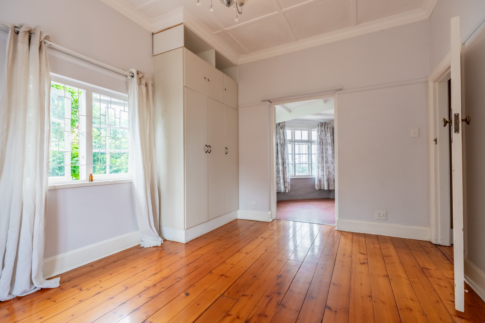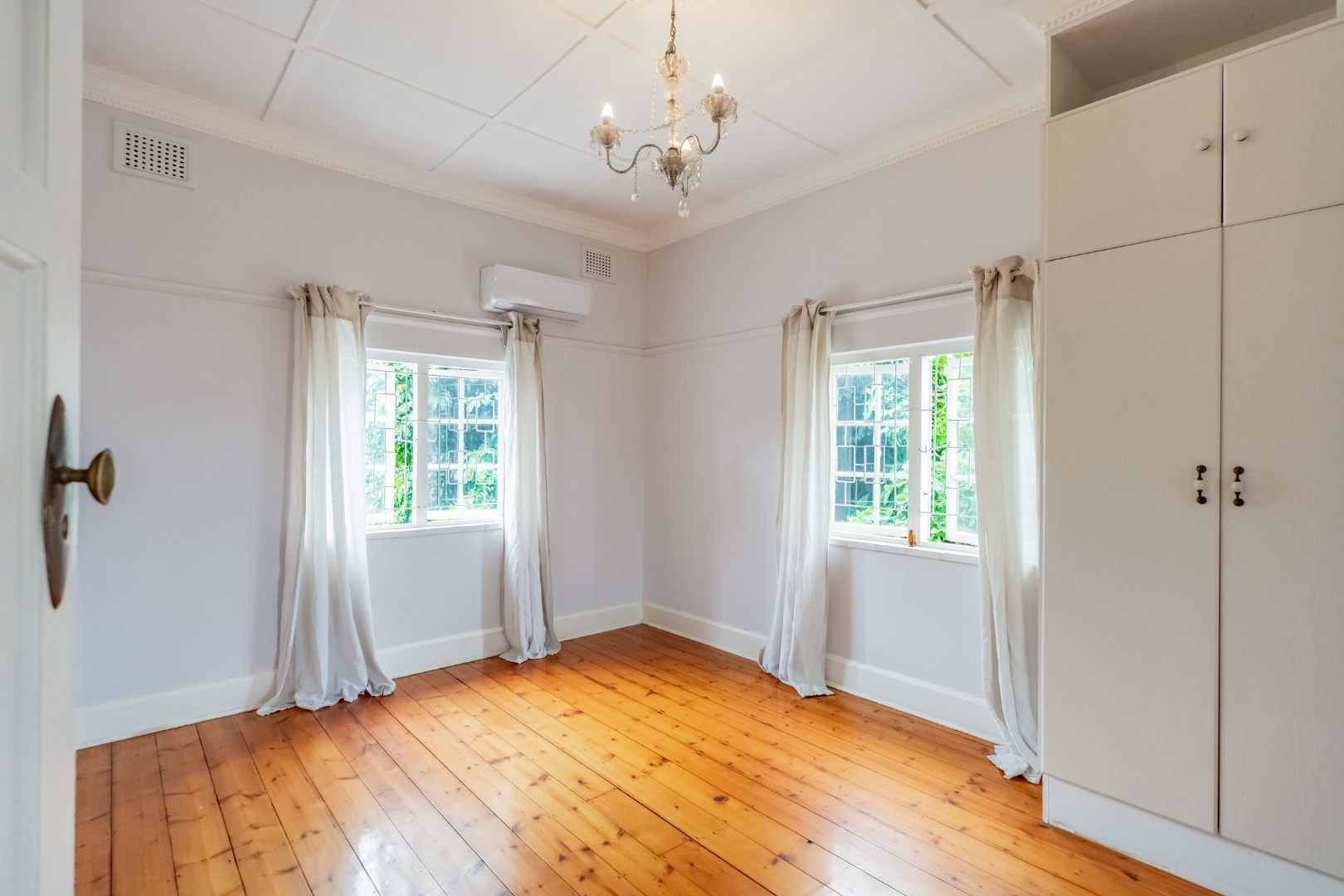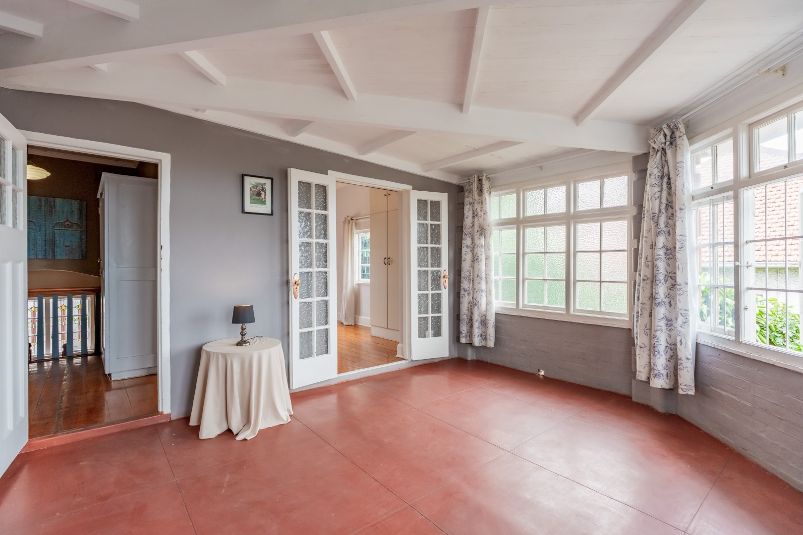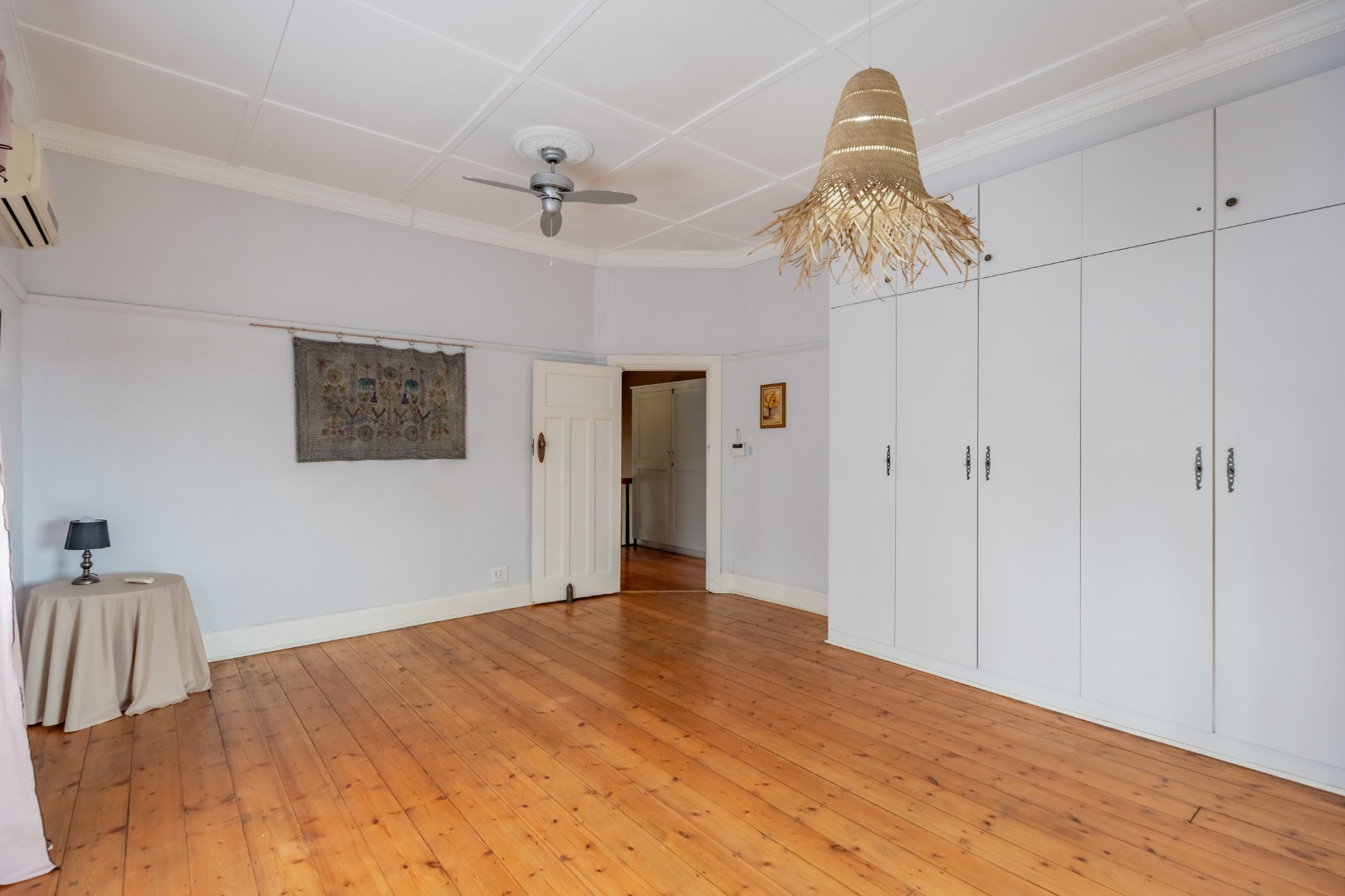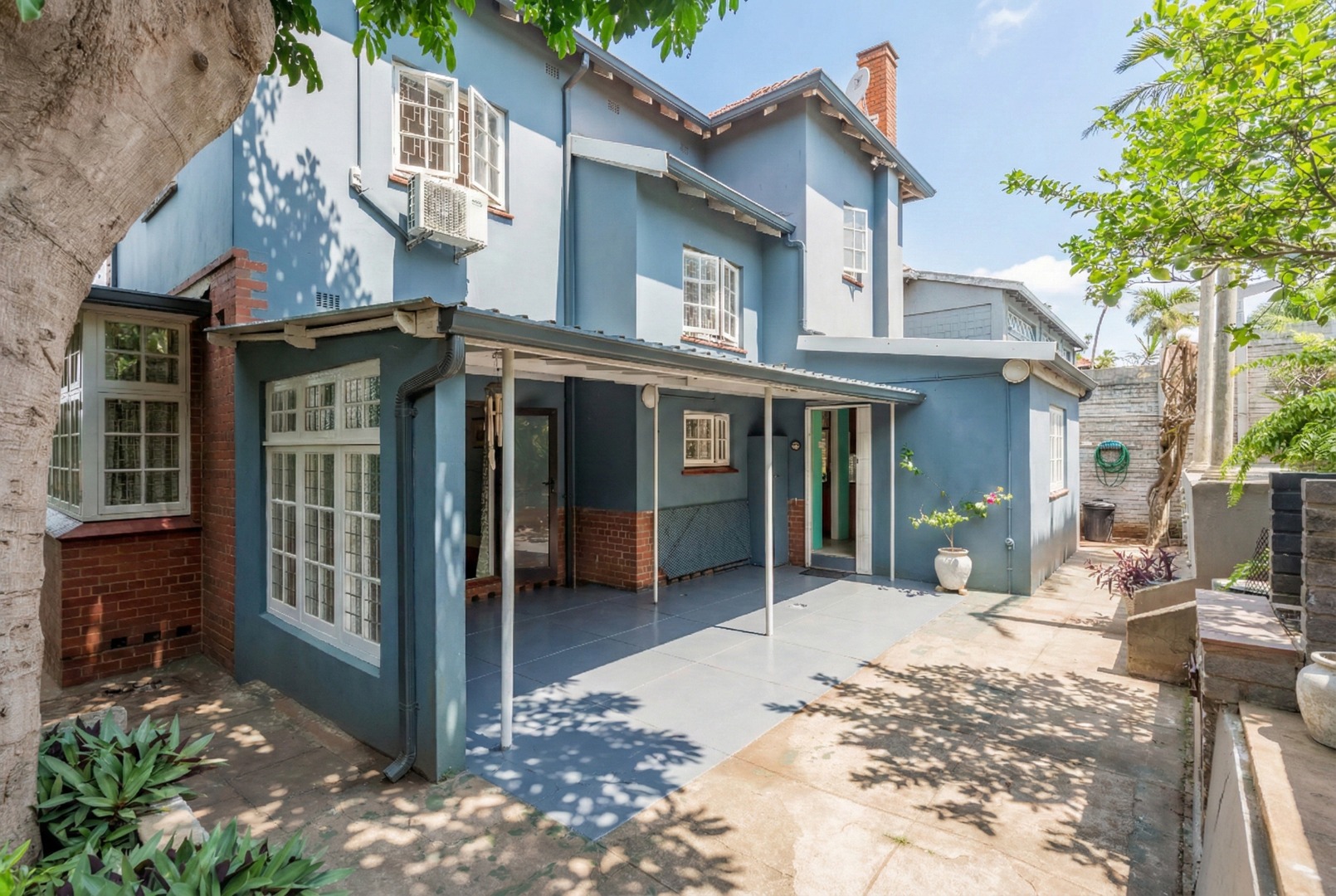Well-maintained wooden floors run throughout the home, complemented by a grand wooden staircase leading upstairs. The upper level offers three bedrooms and two bathrooms. Two of the bedrooms are air-conditioned and fitted with built-in cupboards. The main bedroom has doors that open to a balcony with a lovely view towards the harbour. One bathroom is very spacious and has a classic ball and claw bath, shower, basin and loo, and the second has a bath, basin and loo. A large linen cupboard is conveniently positioned on the landing upstairs.