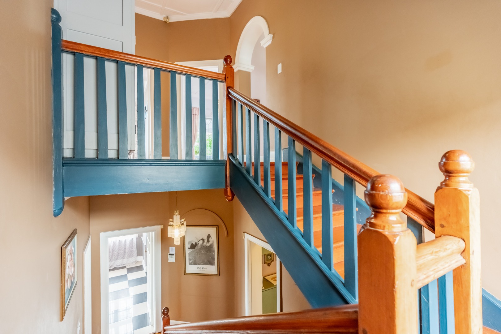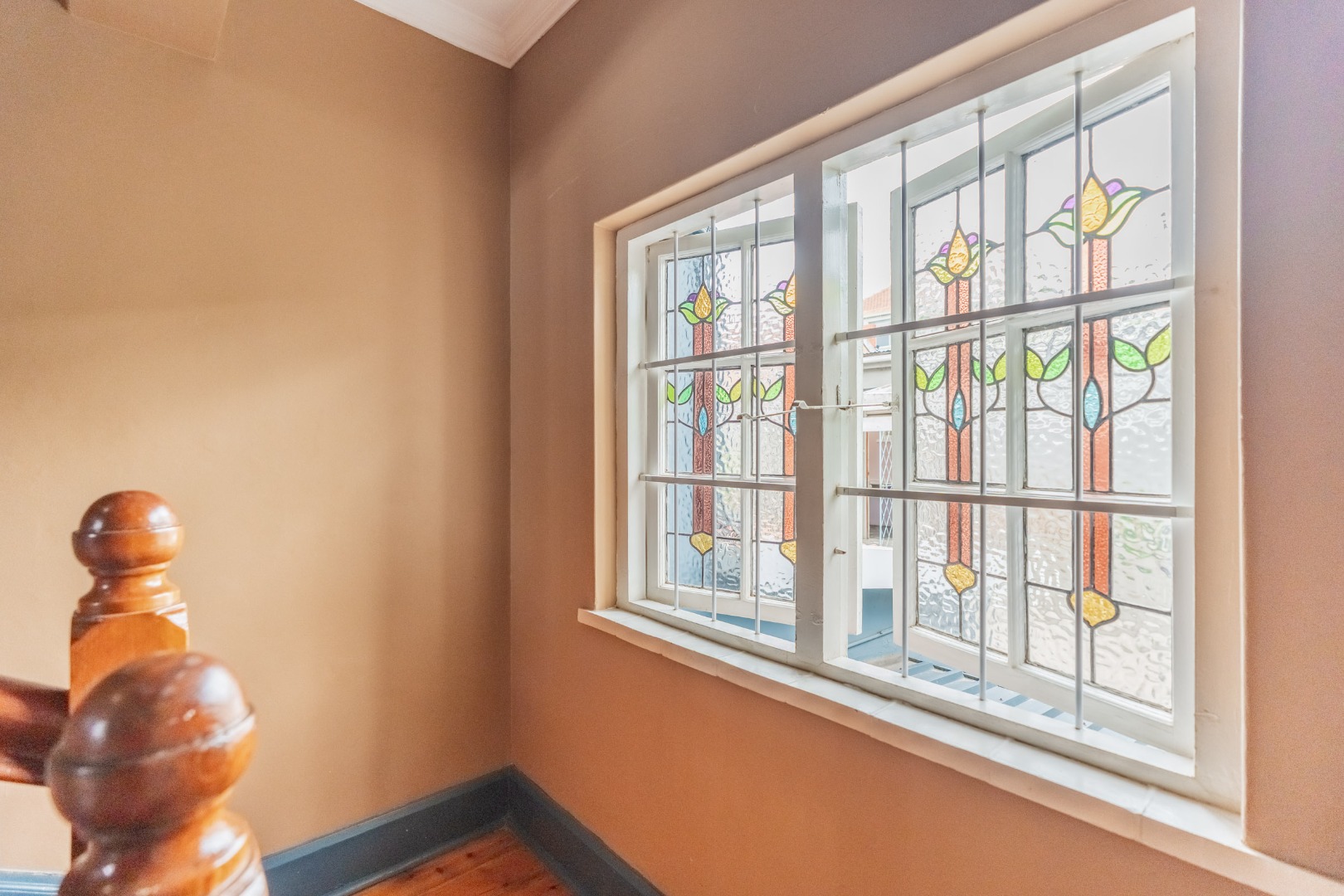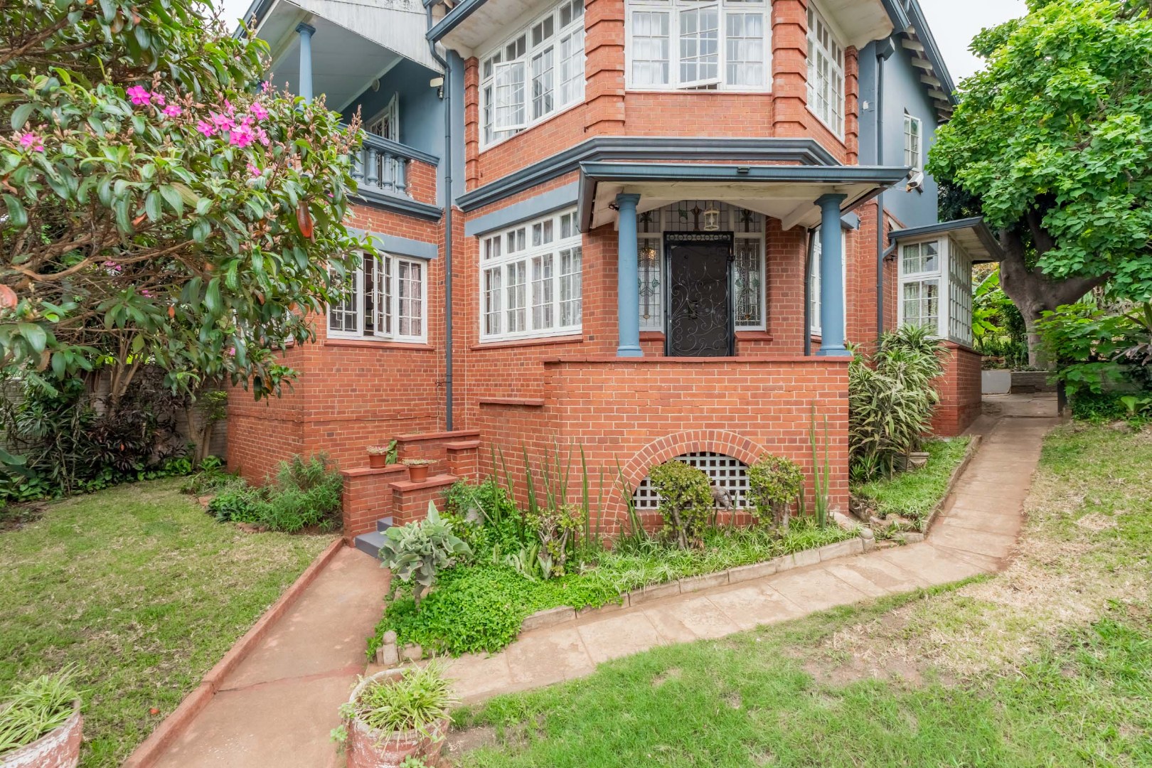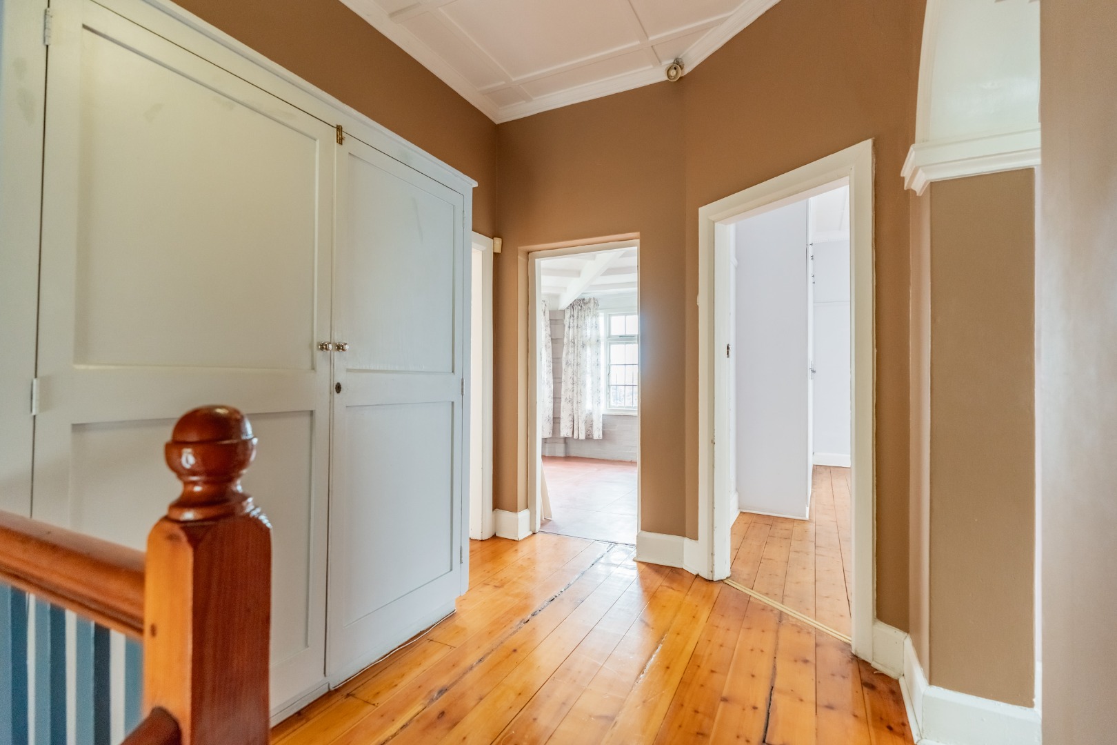 Well-maintained wooden floors run throughout the home, complemented by a grand wooden staircase leading upstairs. The upper level offers three bedrooms and two bathrooms. Two of the bedrooms are air-conditioned and fitted with built-in cupboards. The main bedroom has doors that open to a balcony with a lovely view towards the harbour. One bathroom is very spacious and has a classic ball and claw bath, shower, basin and loo, and the second has a bath, basin and loo. A large linen cupboard is conveniently positioned on the landing upstairs.