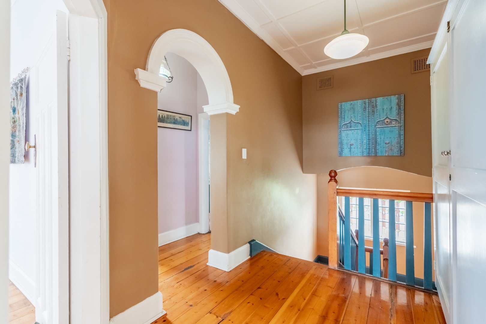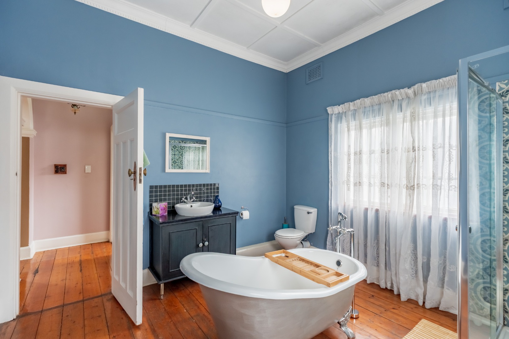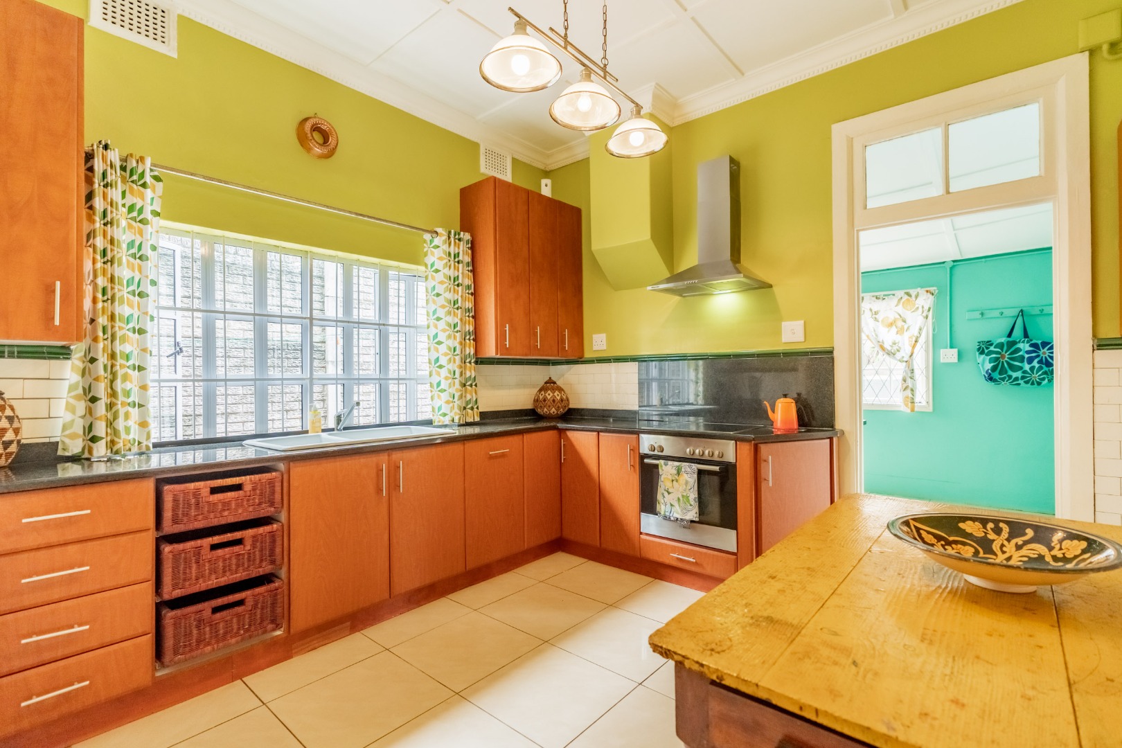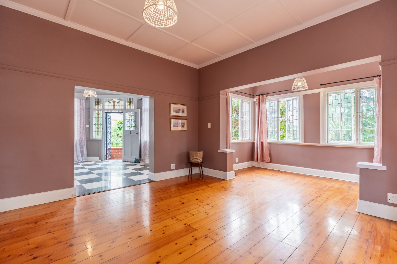 Well-maintained wooden floors run throughout the home, complemented by a grand wooden staircase leading upstairs. The upper level offers three bedrooms and two bathrooms. Two of the bedrooms are air-conditioned and fitted with built-in cupboards. The main bedroom has doors that open to a balcony with a lovely view towards the harbour. One bathroom is very spacious and has a classic ball and claw bath, shower, basin and loo, and the second has a bath, basin and loo. A large linen cupboard is conveniently positioned on the landing upstairs.