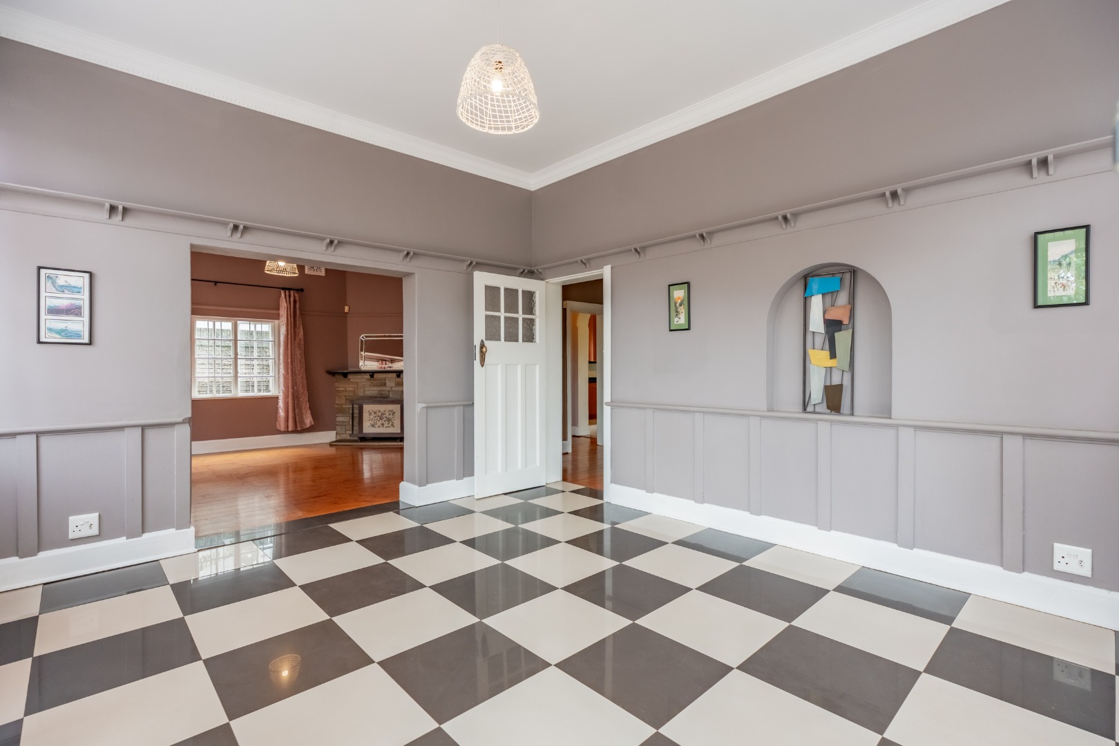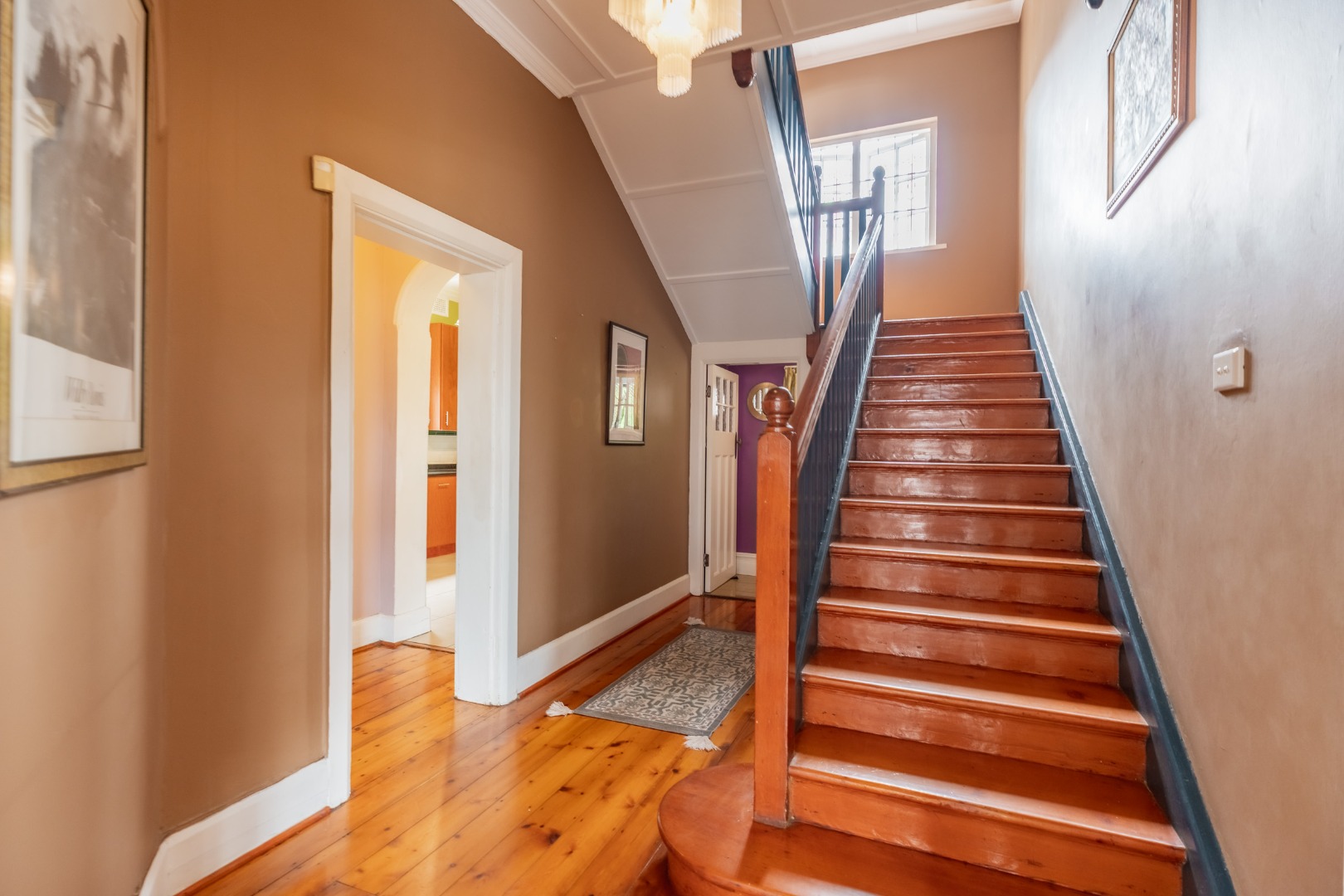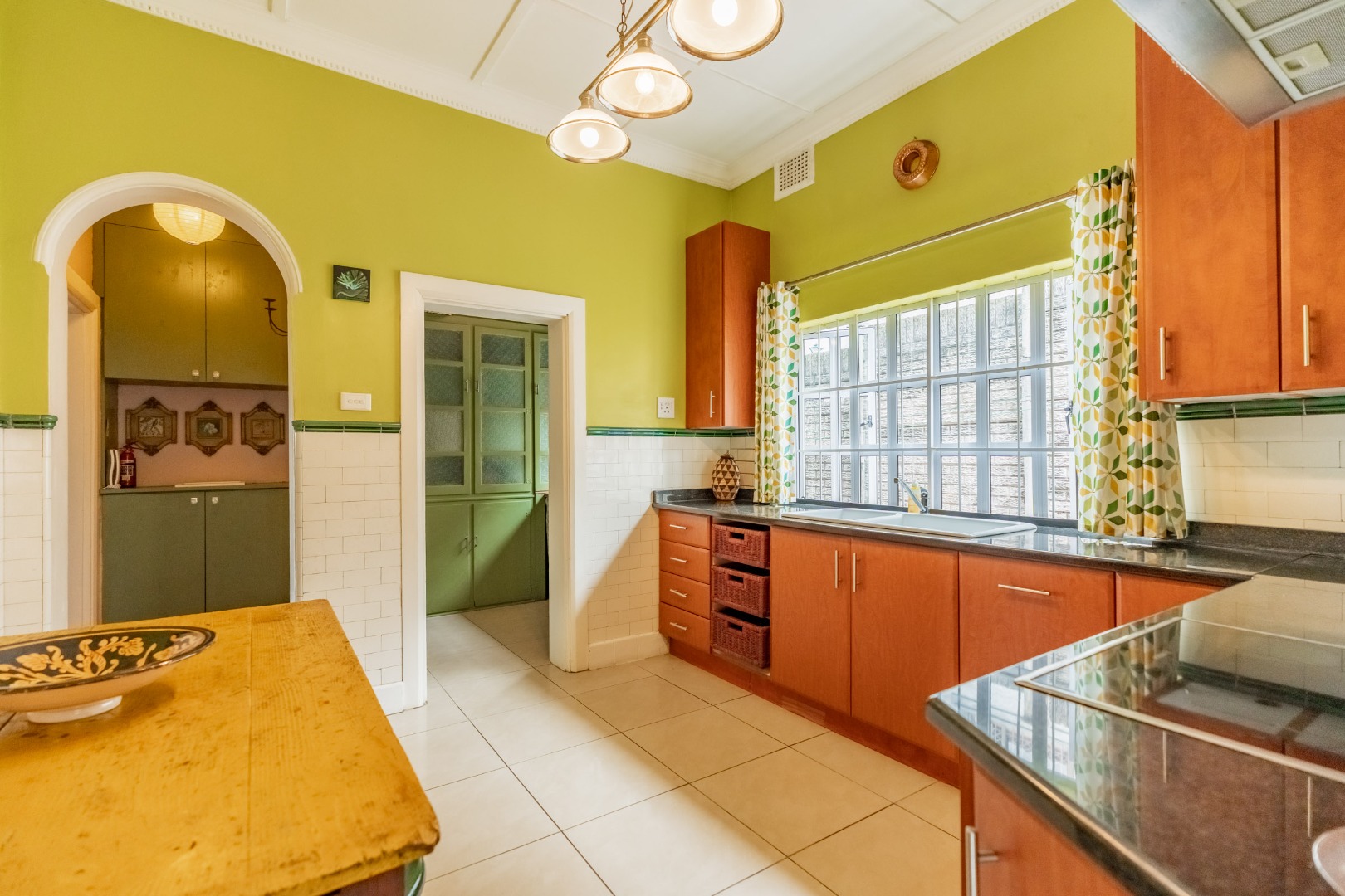 As you enter the home through a beautiful stained-glass doorway, you are welcomed by a spacious tiled entrance hall that leads into a generous lounge. A well designed tiled kitchen features a walk-in pantry with ample cupboard space, while a separate scullery and laundry add practicality. A guest loo is located downstairs. The dining room has double doors that open onto a covered patio and braai area, ideal for relaxed entertaining.