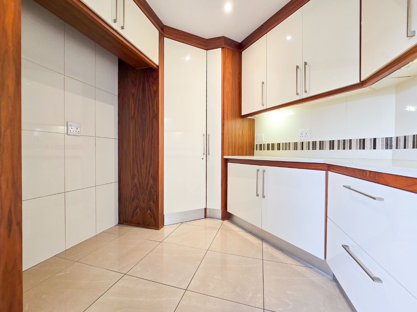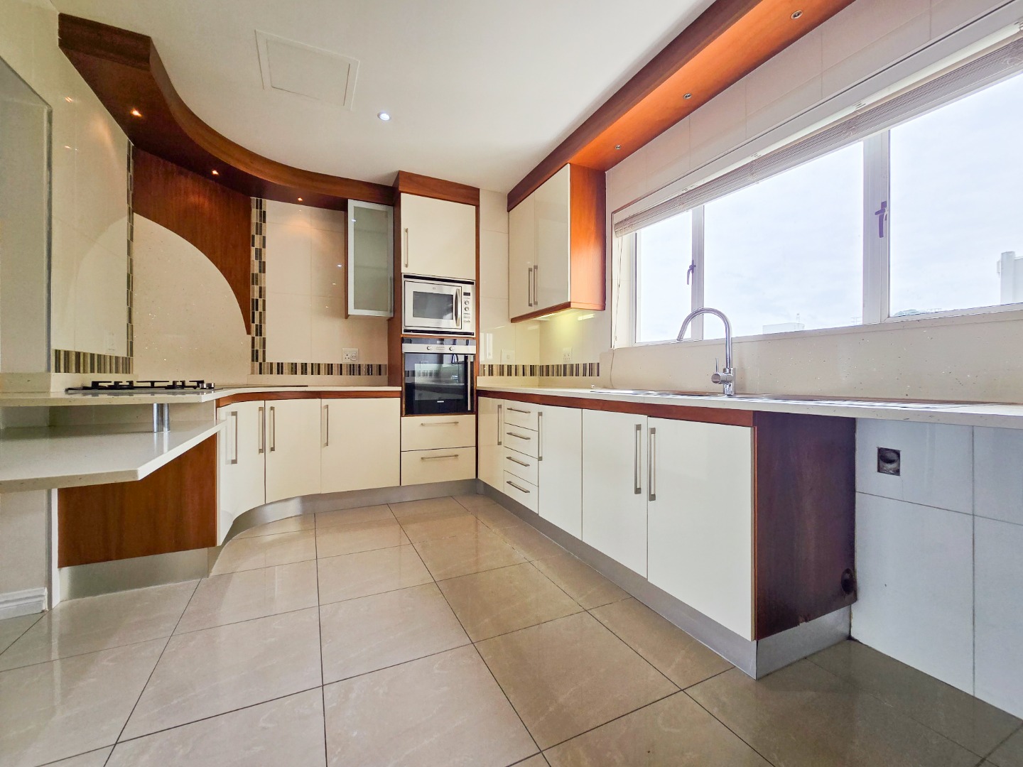 The modern kitchen is both stylish and functional, offering ample cupboard space, marble countertops, a gas hob, and a built-in oven.