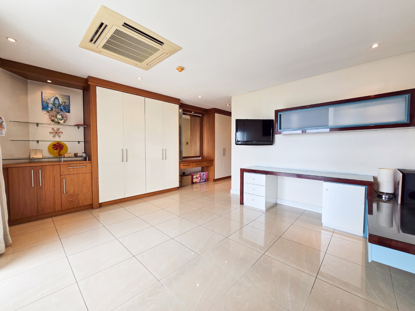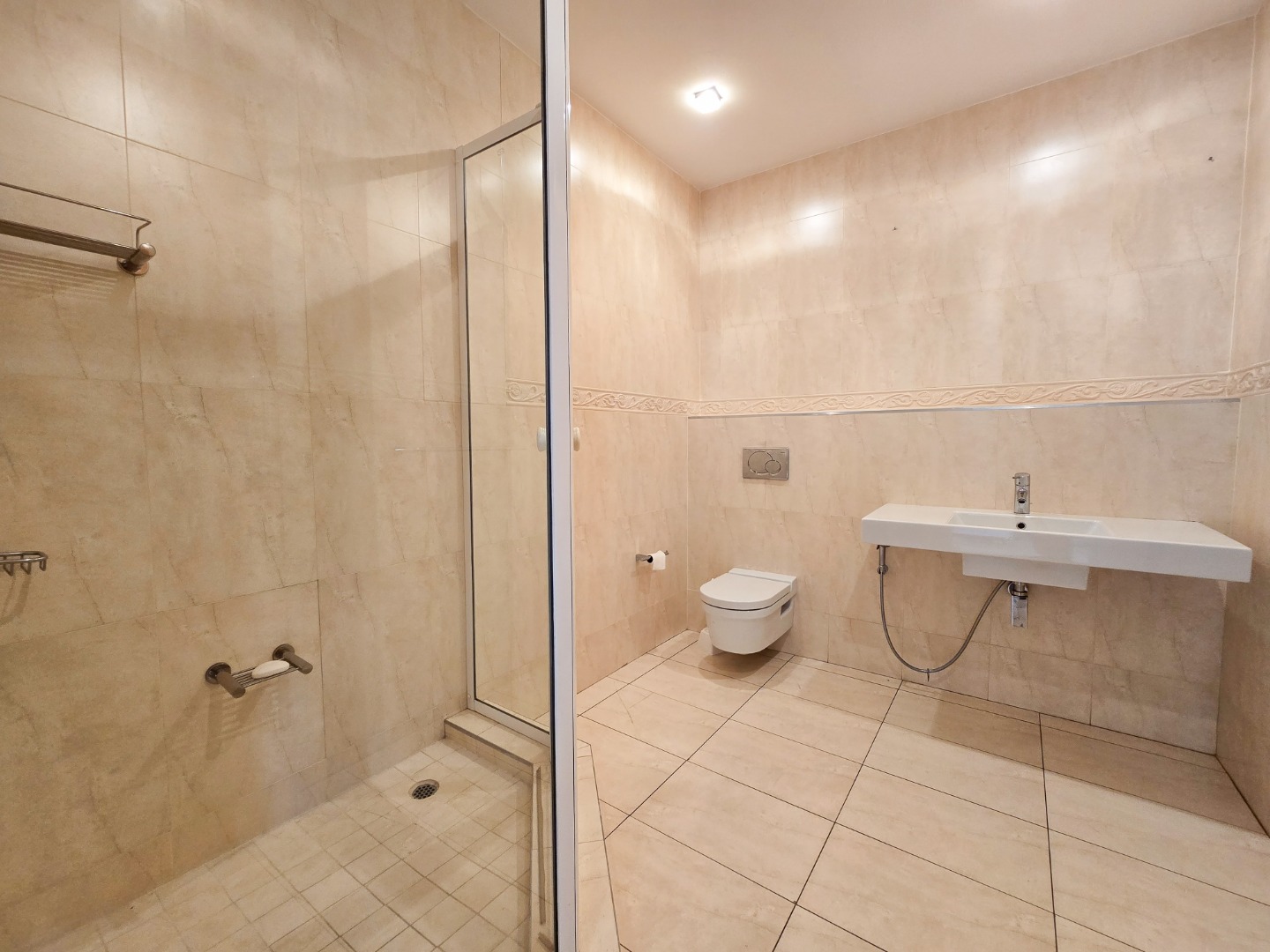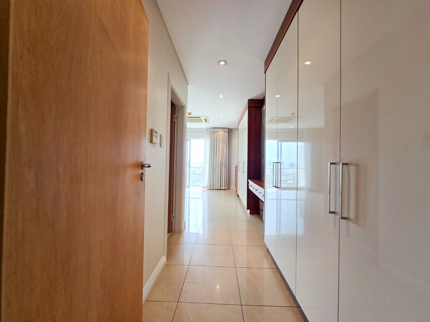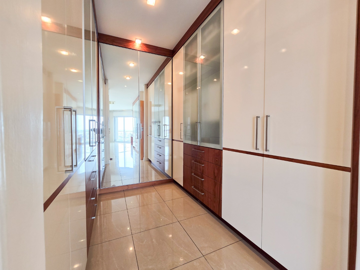 The apartment offers three generously sized bedrooms, each with its own ensuite bathroom. The main bedroom is a true masterpiece, featuring built-in cupboards, a walk-in closet, and a luxurious ensuite with a bathtub, shower, basin, and toilet.