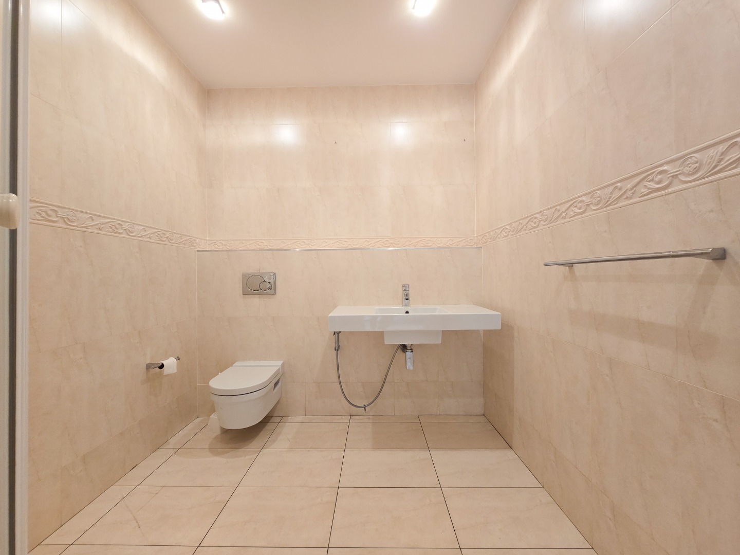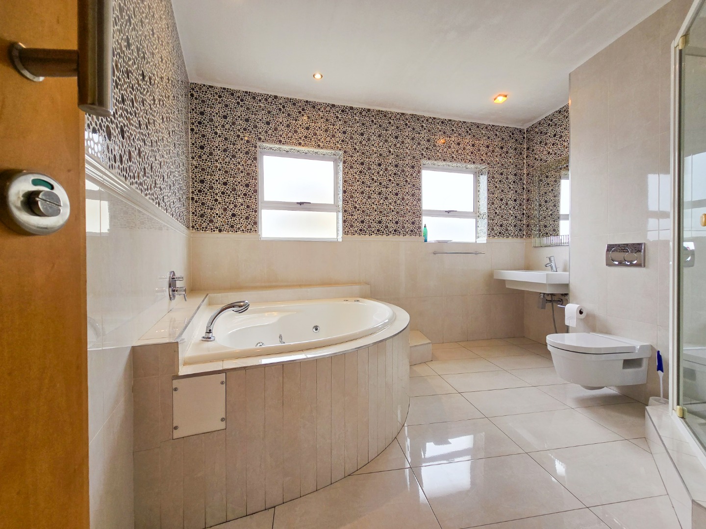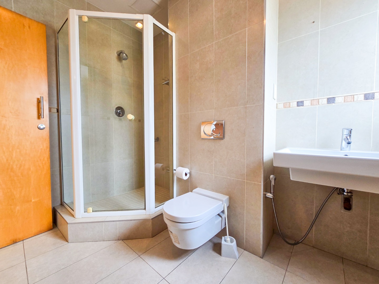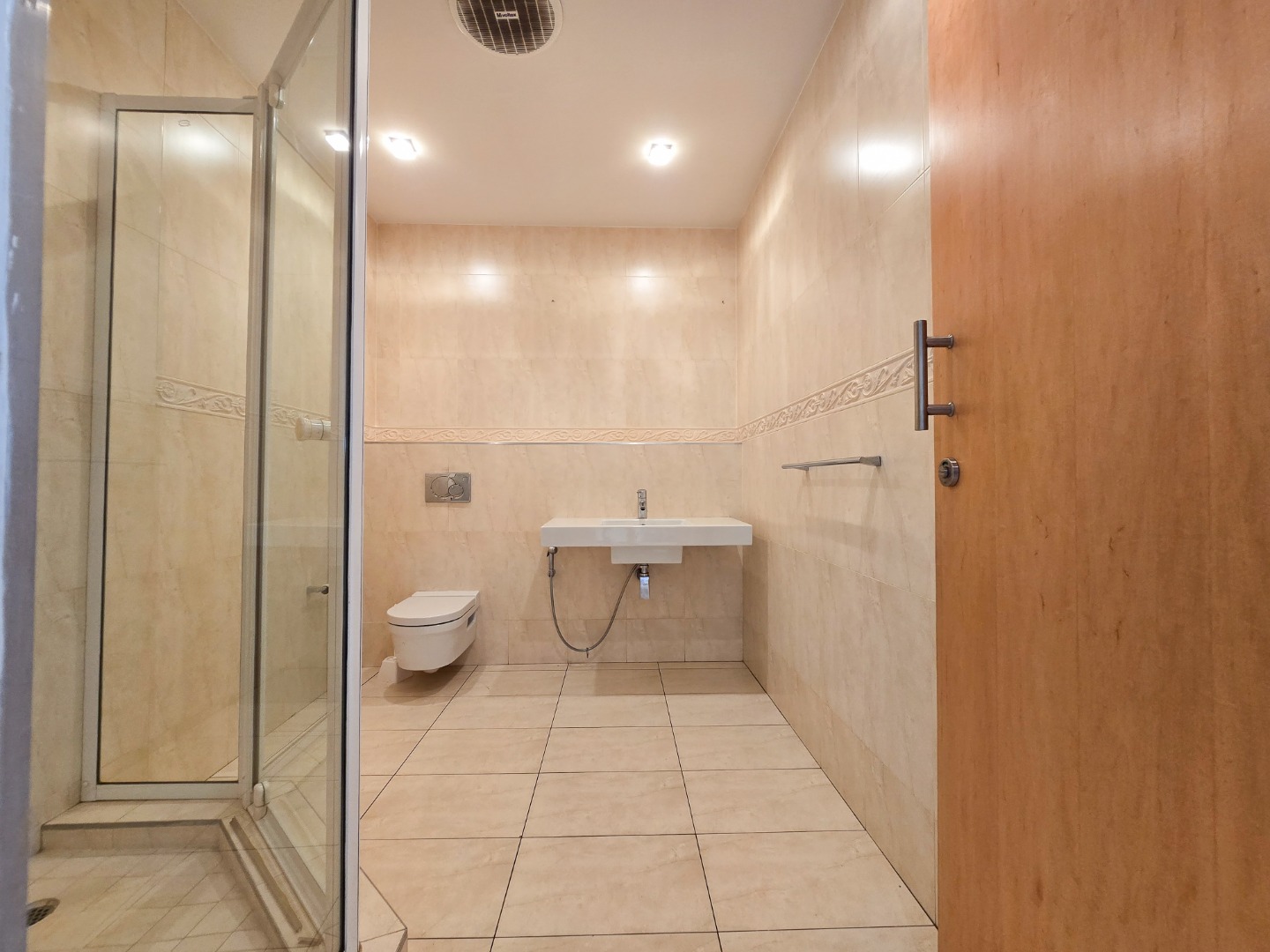 The apartment offers three generously sized bedrooms, each with its own ensuite bathroom. The main bedroom is a true masterpiece, featuring built-in cupboards, a walk-in closet, and a luxurious ensuite with a bathtub, shower, basin, and toilet.