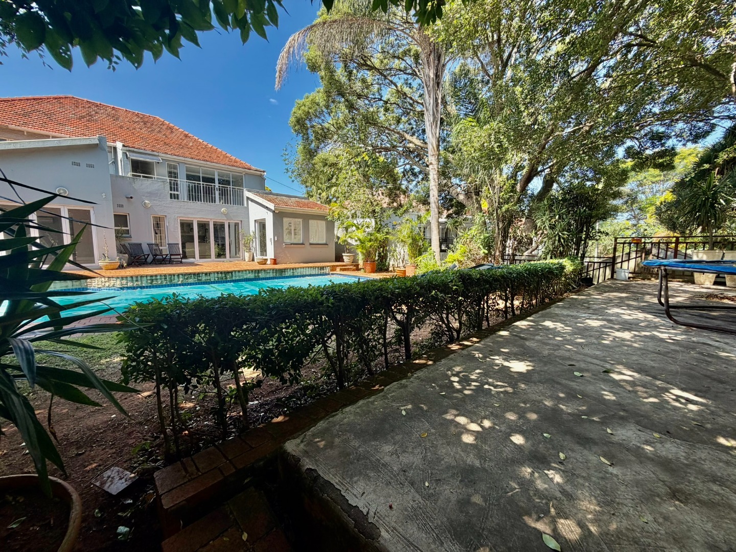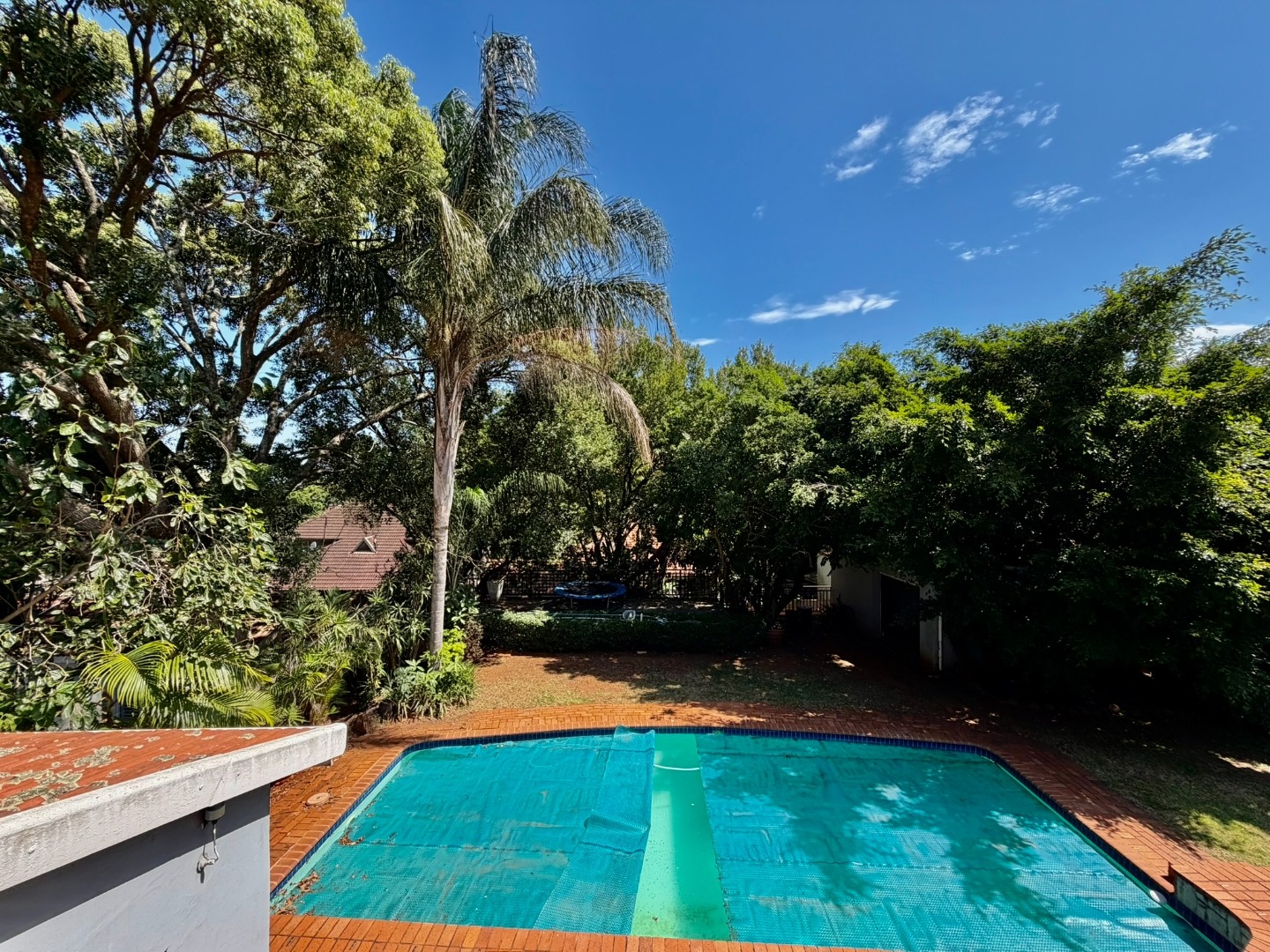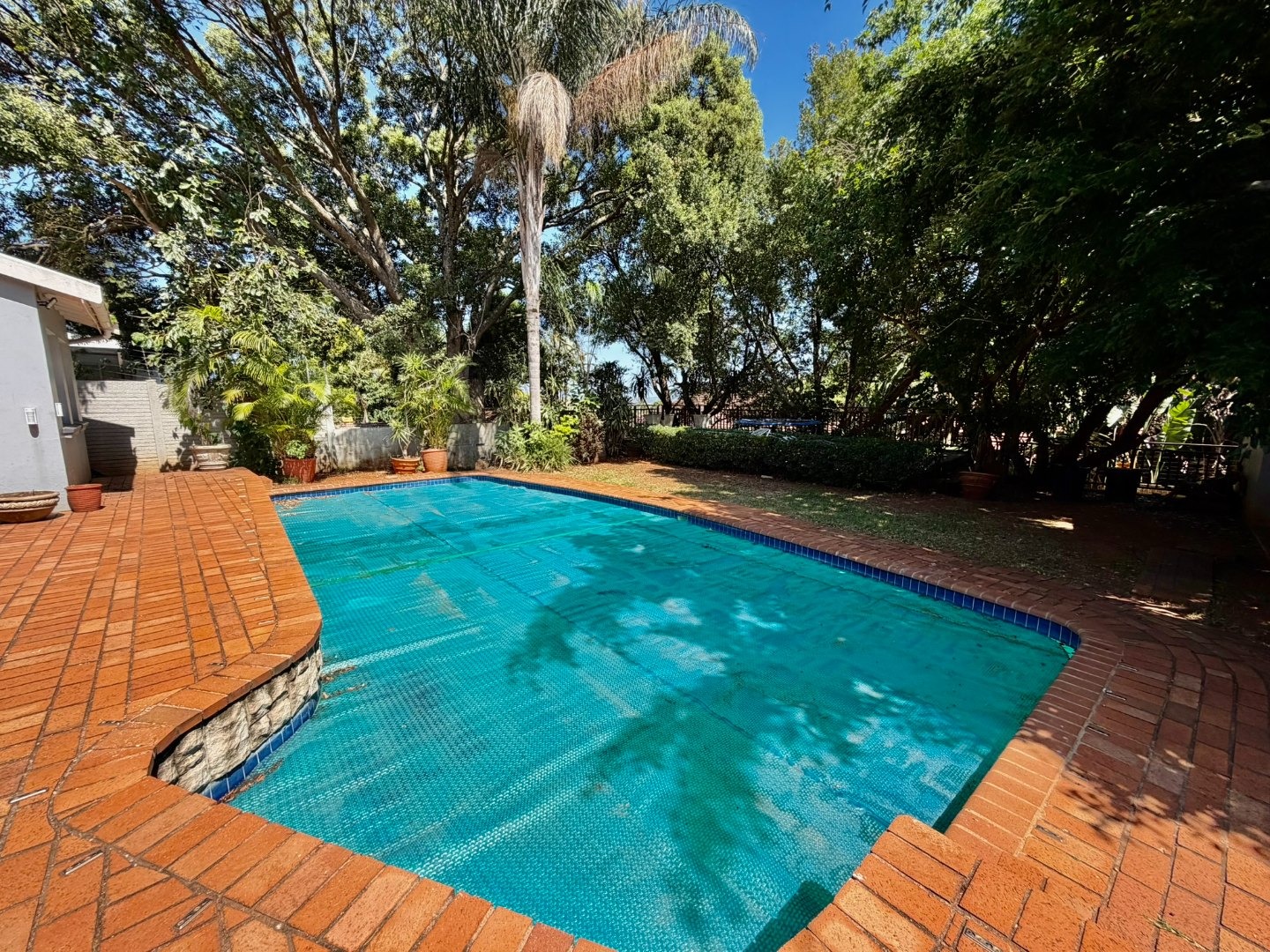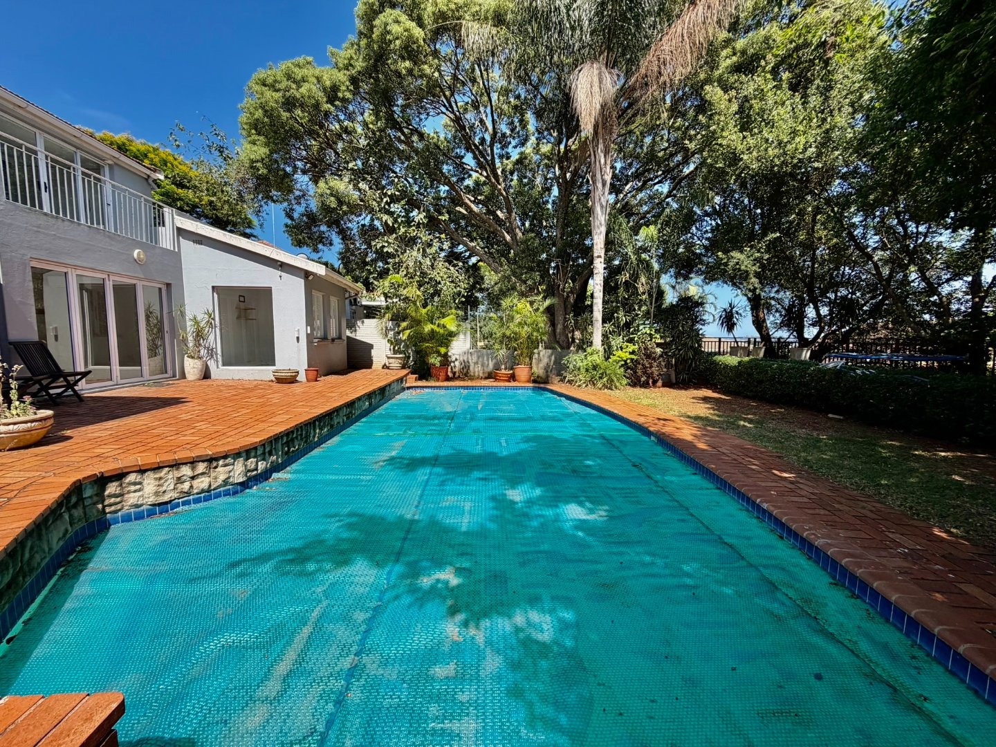 Outdoor living is a highlight, with a large swimming pool, a spacious patio, and a deck, all surrounded by mature trees that offer natural shade and privacy. A dedicated braai room provides an ideal setting for entertaining guests. The property also features three garages, providing secure parking and additional storage. Pets are welcome, making this a true family home.