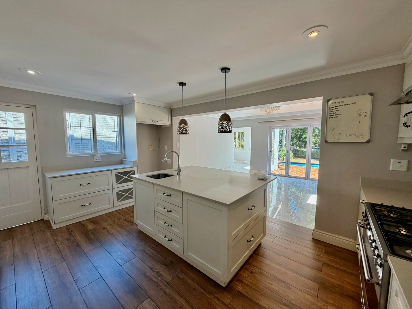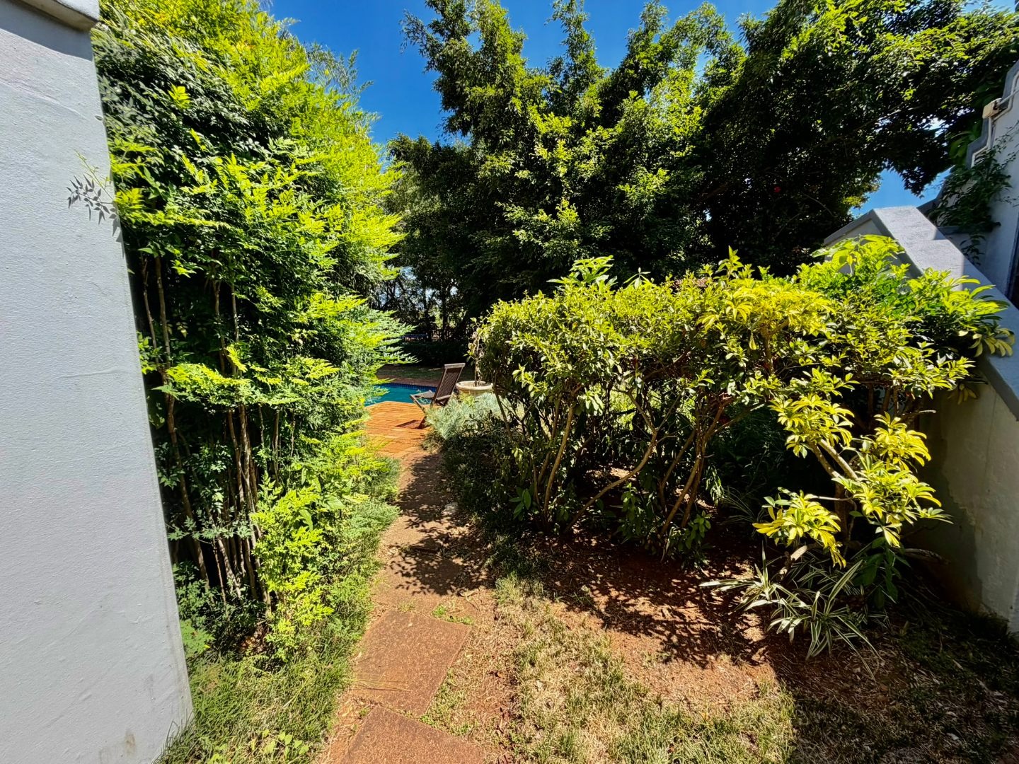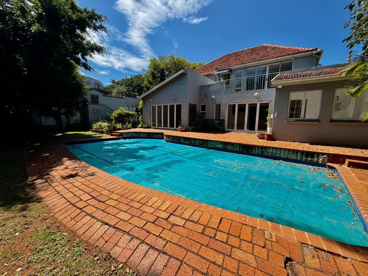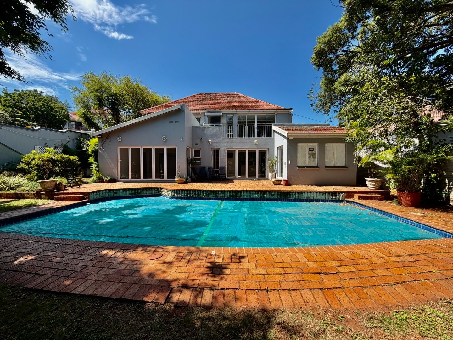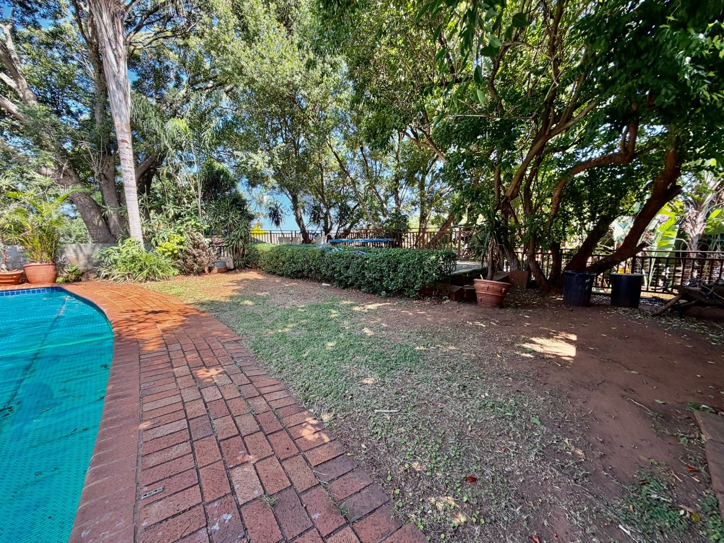 Outdoor living is a highlight, with a large swimming pool, a spacious patio, and a deck, all surrounded by mature trees that offer natural shade and privacy. A dedicated braai room provides an ideal setting for entertaining guests. The property also features three garages, providing secure parking and additional storage. Pets are welcome, making this a true family home.