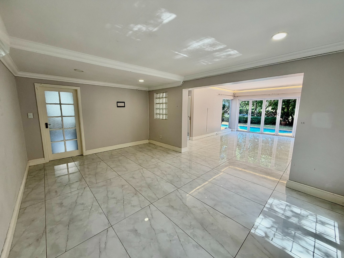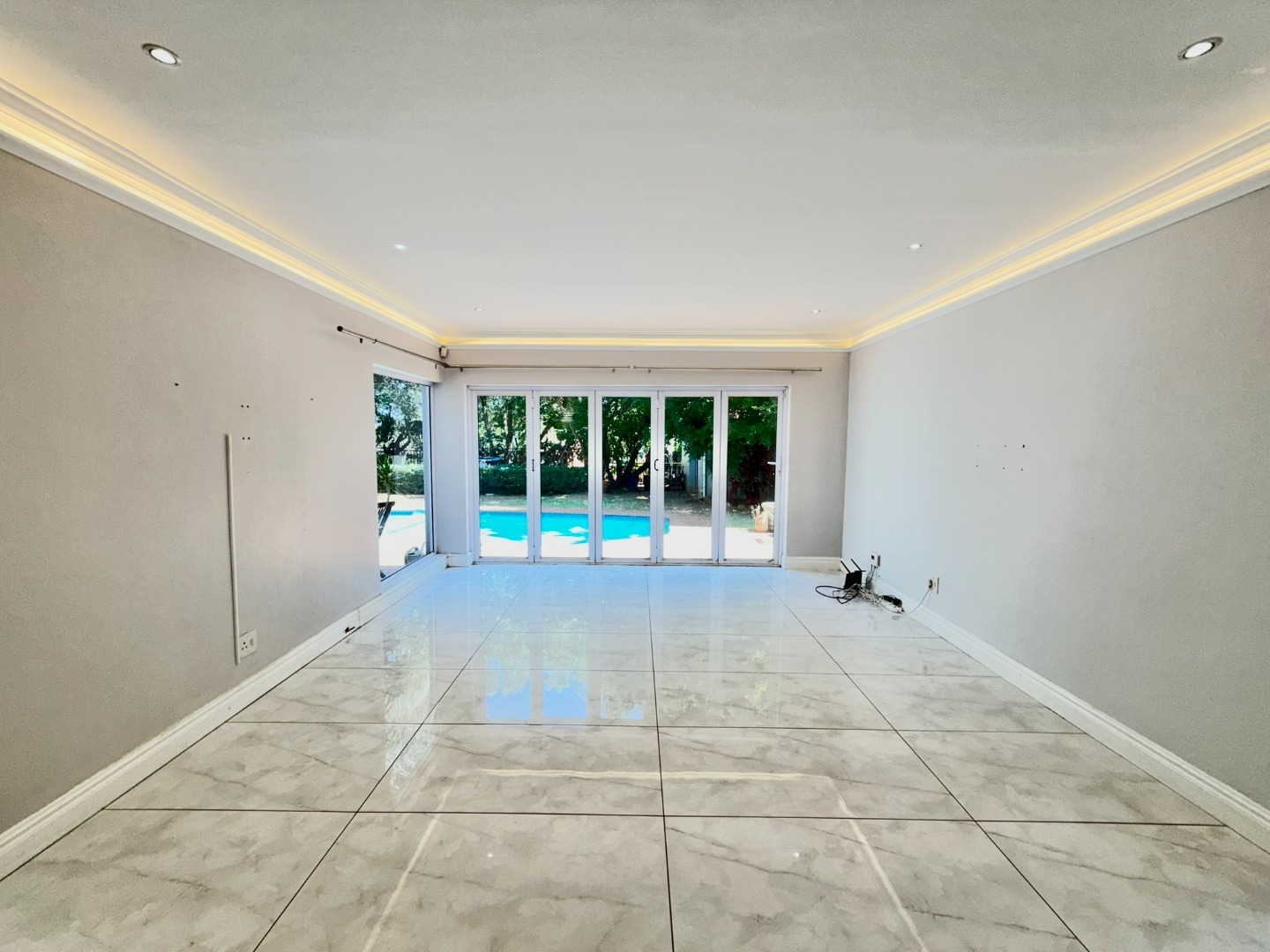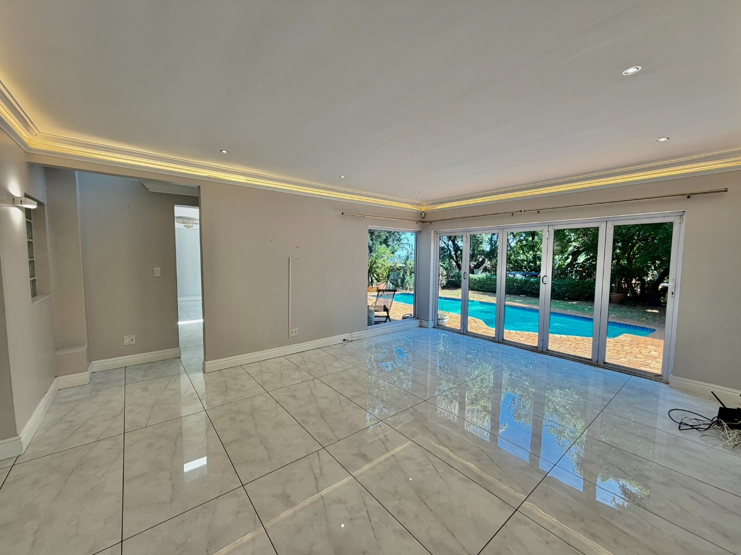 Step inside to an interior designed for modern living, featuring an open-plan layout that enhances natural light and flow. The living spaces boast contemporary marble-look tiled floors, elegant crown molding, and sophisticated recessed and cove lighting. Large glass and bifold doors seamlessly connect the indoors with the expansive outdoor areas. The residence includes a well-appointed kitchen, a dedicated dining room, a comfortable lounge, and an additional family TV room, ensuring ample space for relaxation and entertainment. A private study and a practical pantry add to the home's functionality.