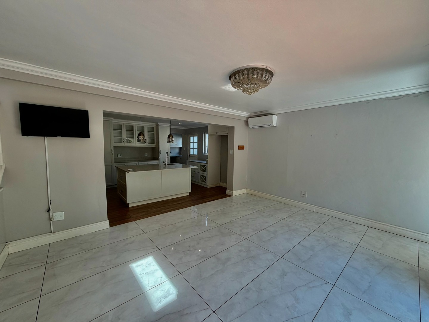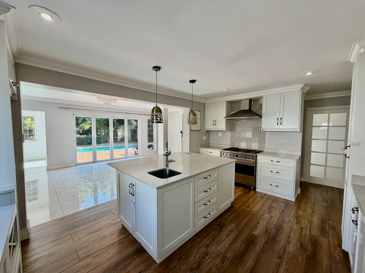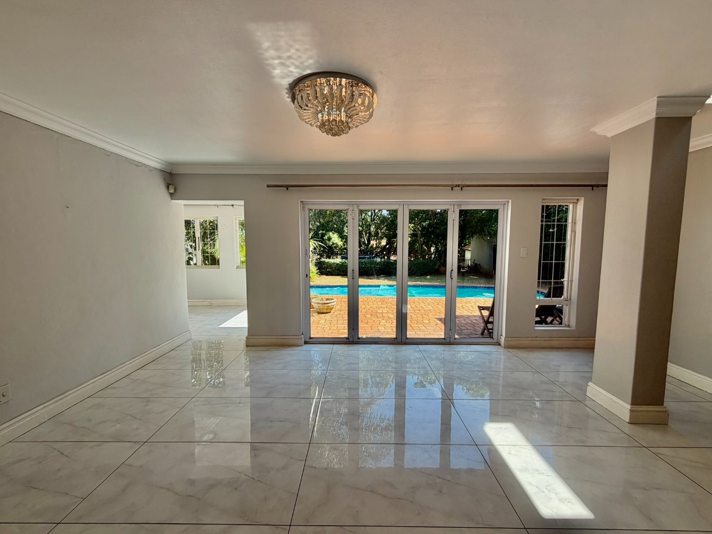 Step inside to an interior designed for modern living, featuring an open-plan layout that enhances natural light and flow. The living spaces boast contemporary marble-look tiled floors, elegant crown molding, and sophisticated recessed and cove lighting. Large glass and bifold doors seamlessly connect the indoors with the expansive outdoor areas. The residence includes a well-appointed kitchen, a dedicated dining room, a comfortable lounge, and an additional family TV room, ensuring ample space for relaxation and entertainment. A private study and a practical pantry add to the home's functionality.