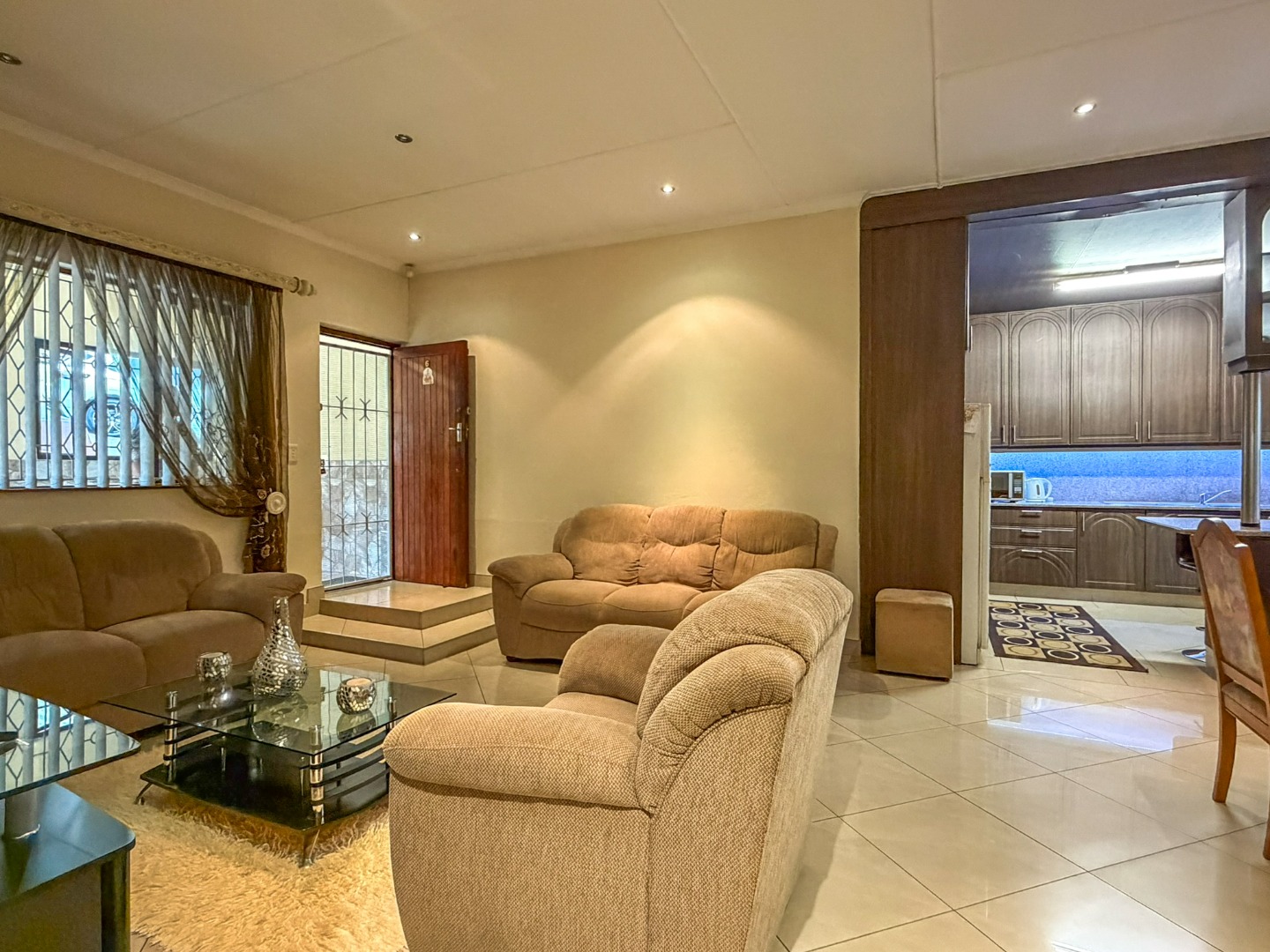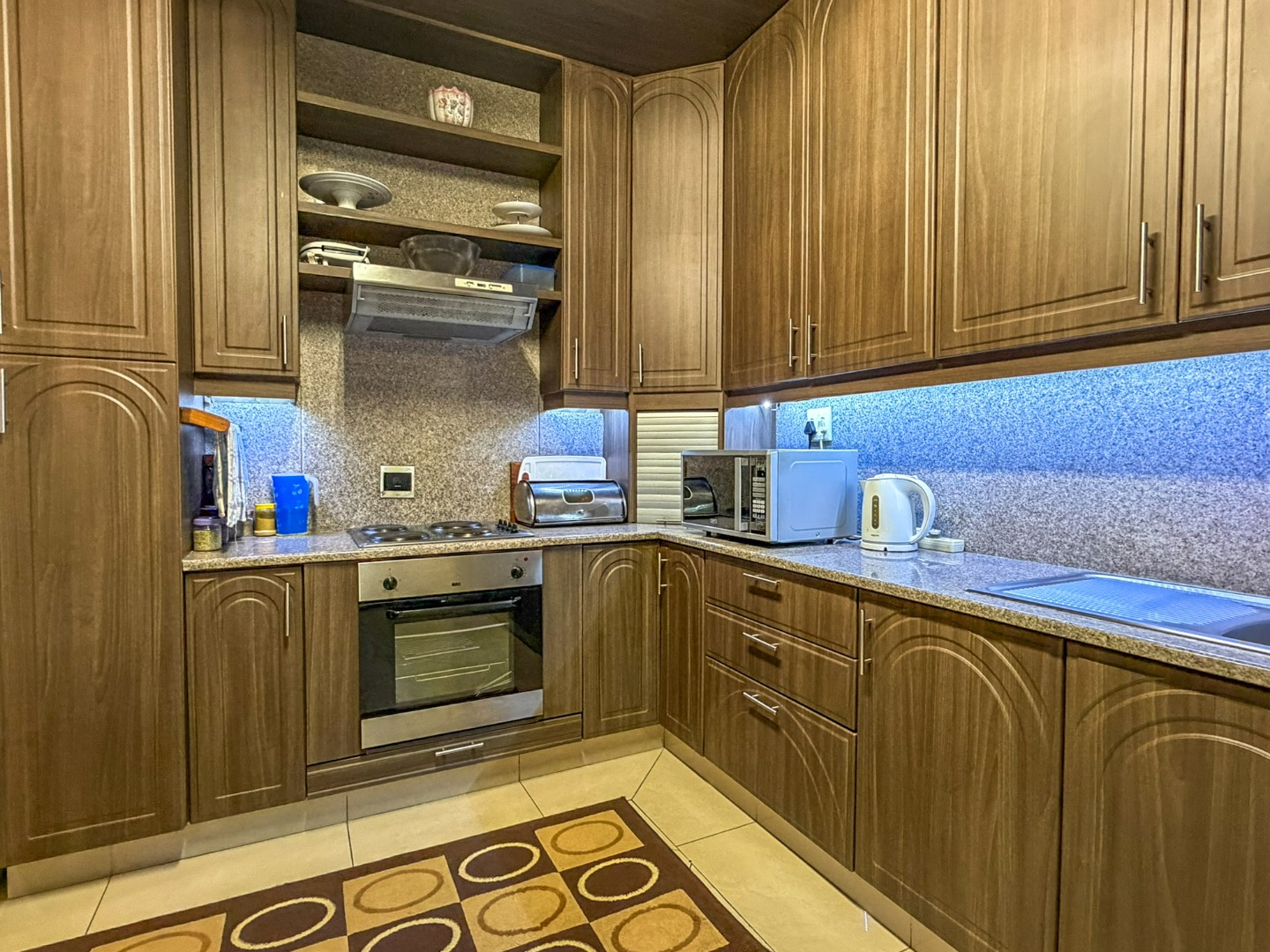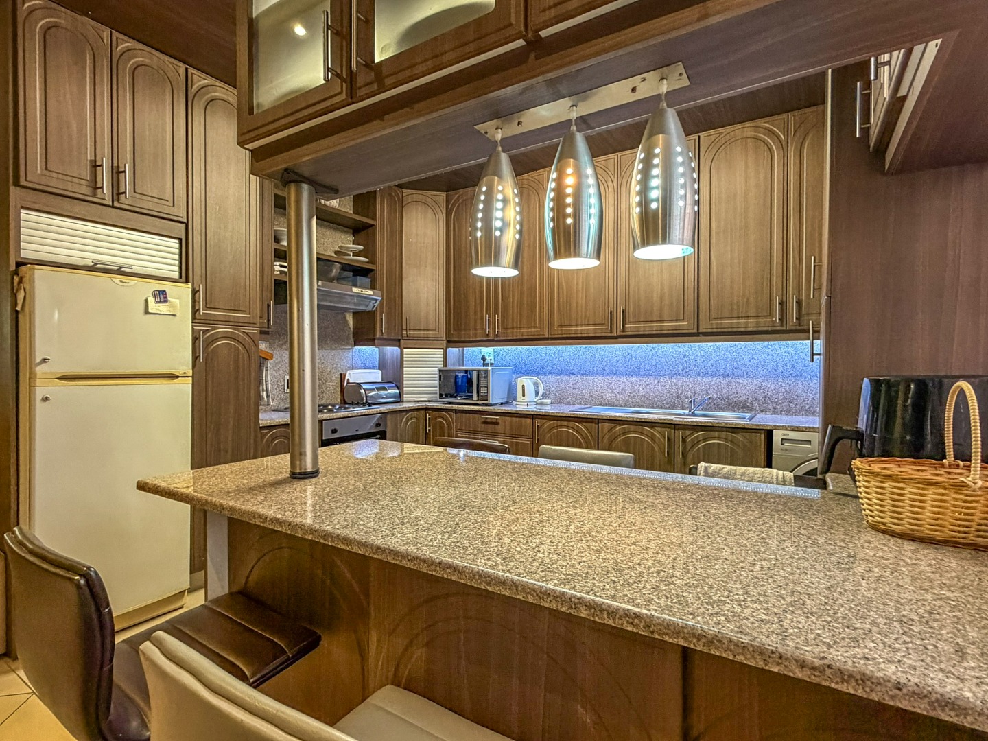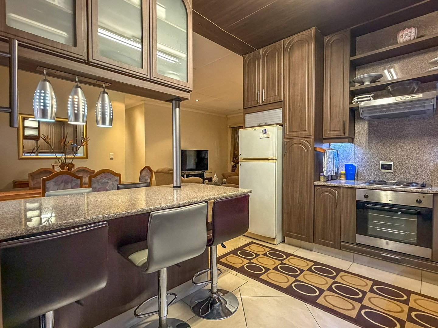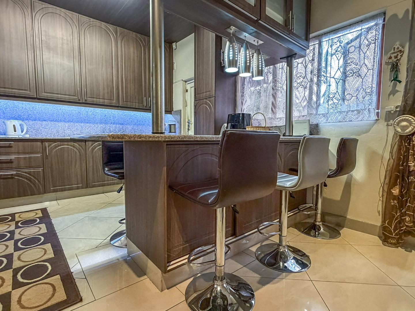 This spacious simplex opens into a comfortable lounge area, leading seamlessly into an open-plan dining area and kitchen with a breakfast nook. The kitchen is fitted with granite countertops, built-in cupboards, an extractor fan, hob, and oven, offering both style and functionality.