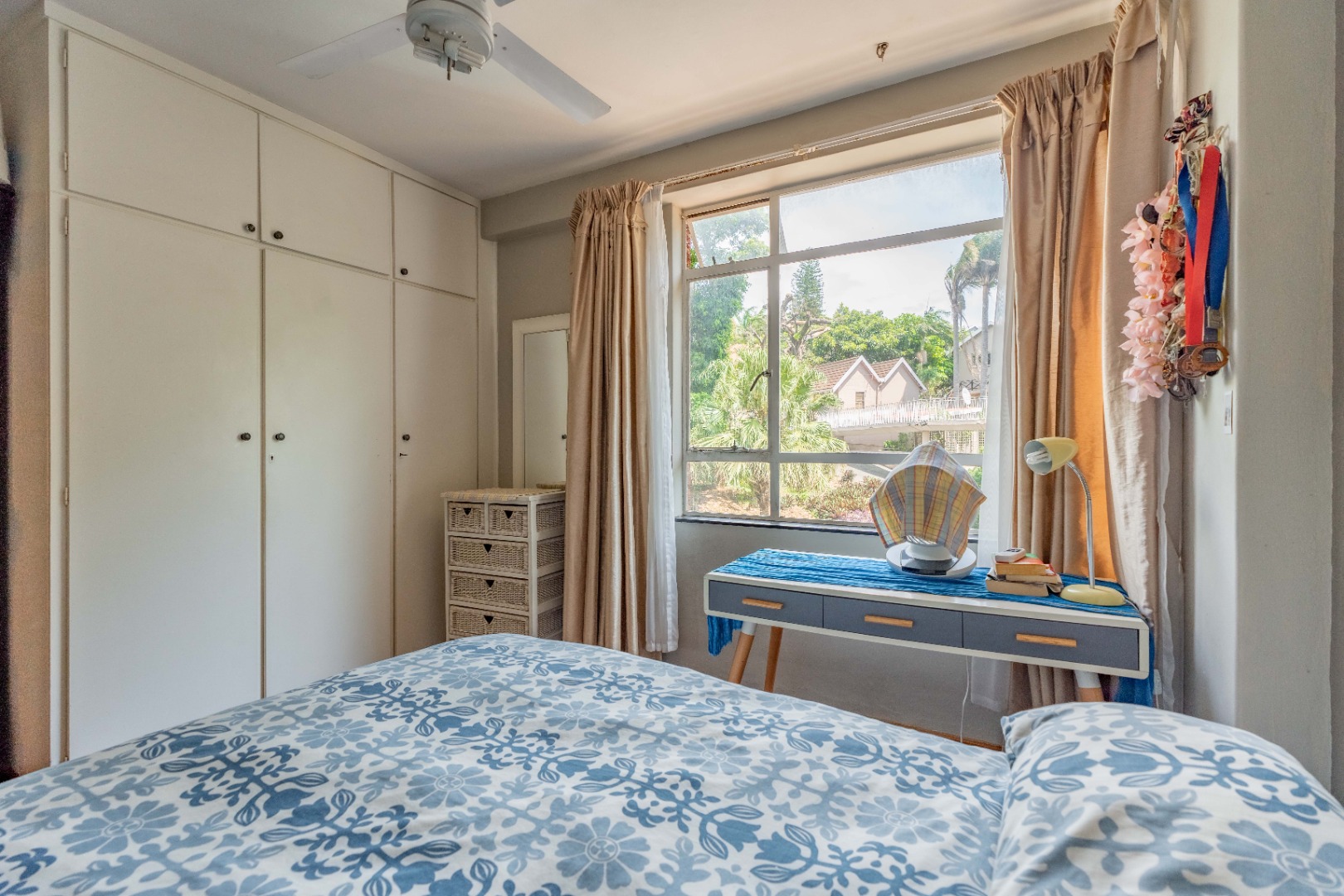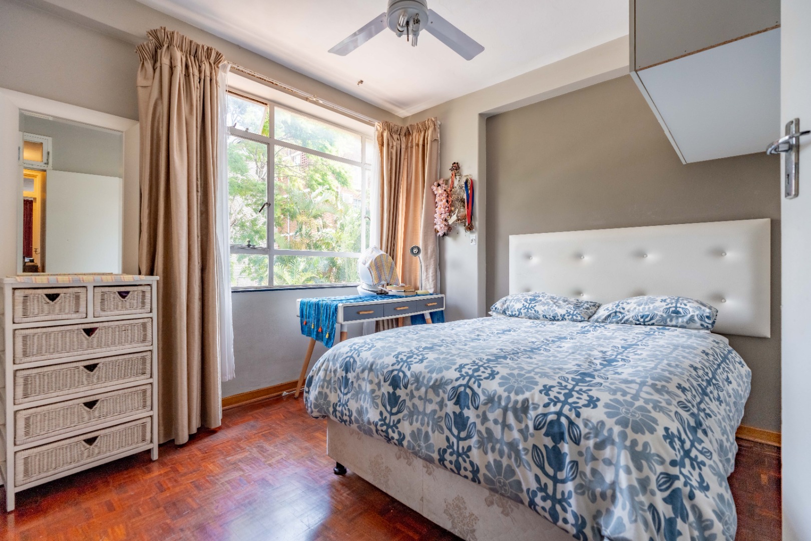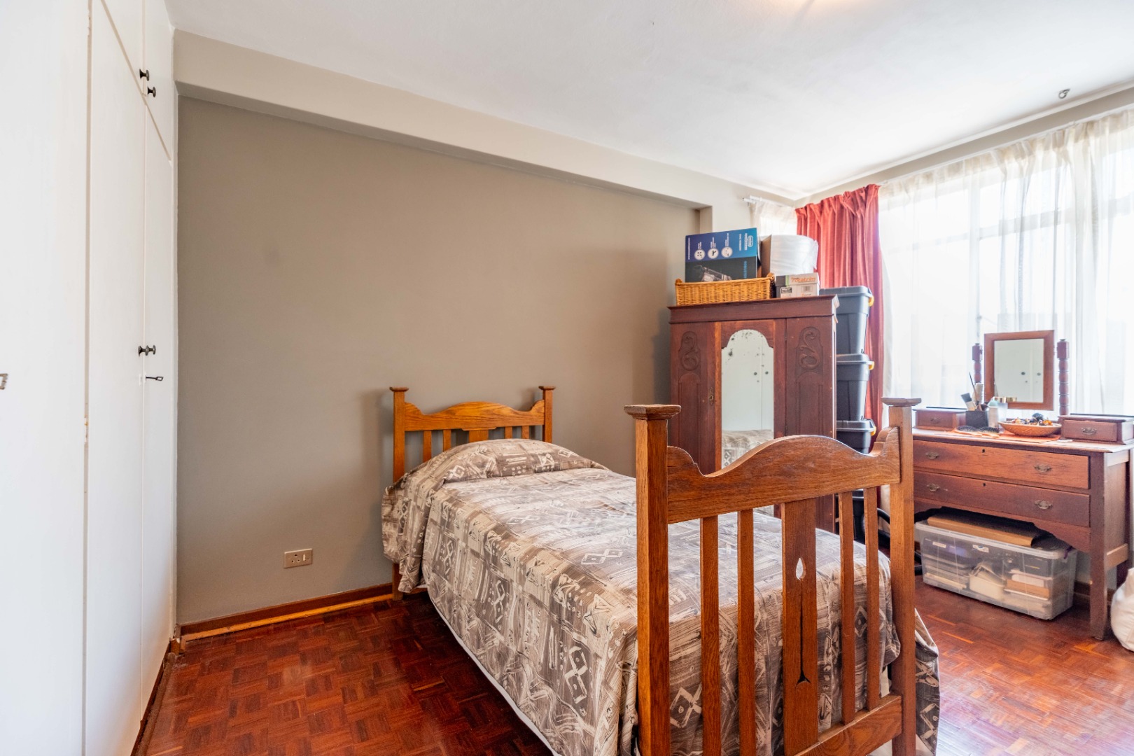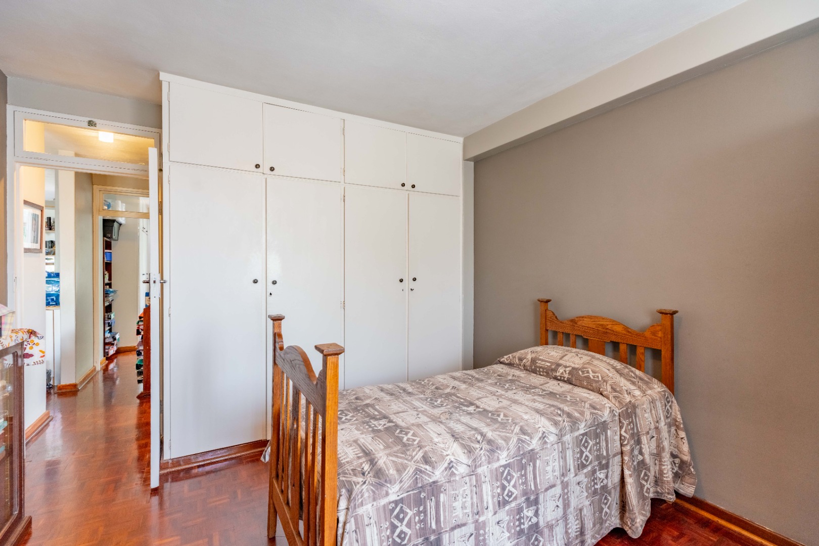 The main bedroom is both spacious and comfortable, featuring ample built-in cupboard space and the added luxury of air-conditioning to ensure year-round comfort. For added practicality, the apartment comes with one designated parking bay.