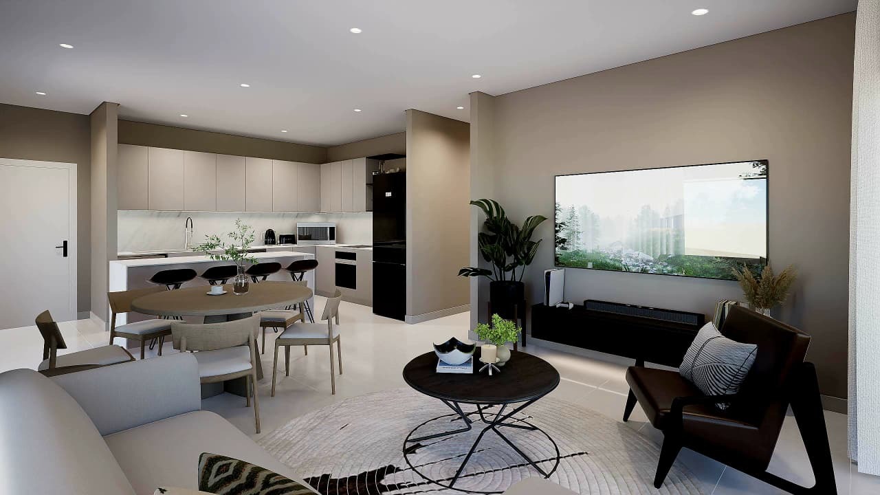 - Modern open-plan kitchens with central islands flowing into spacious TV lounges and undercover balconies with sleek glass balustrades