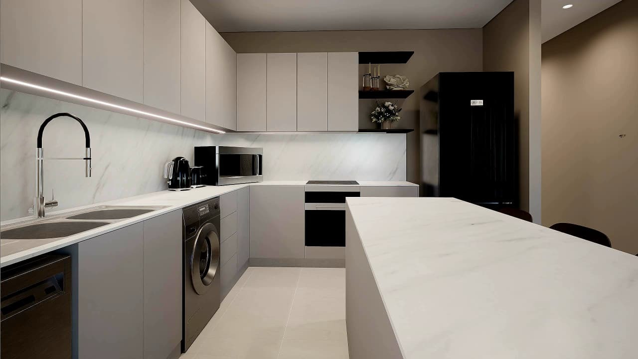 - Designer kitchen cabinetry in a mix of high-gloss and matte finishes