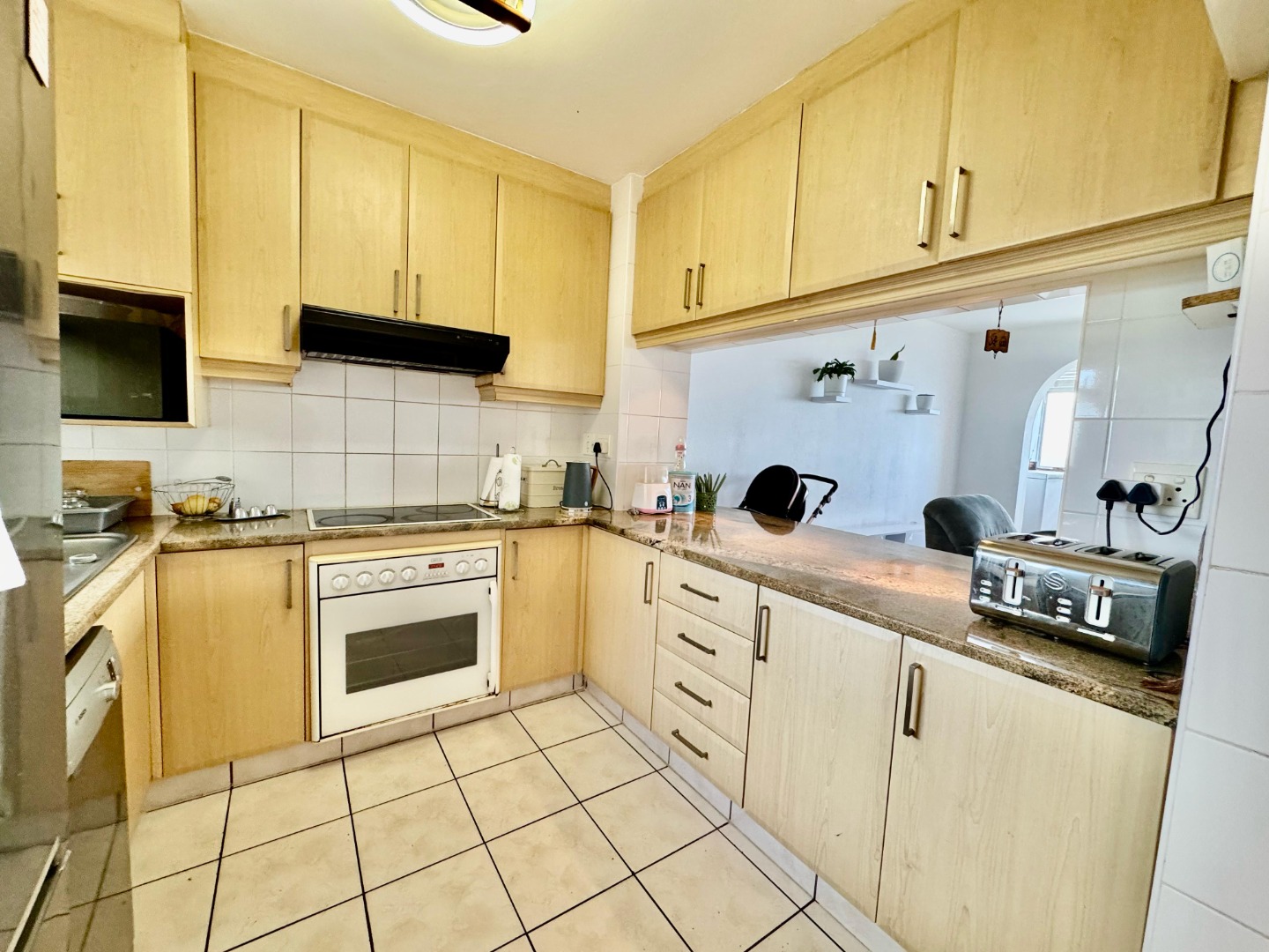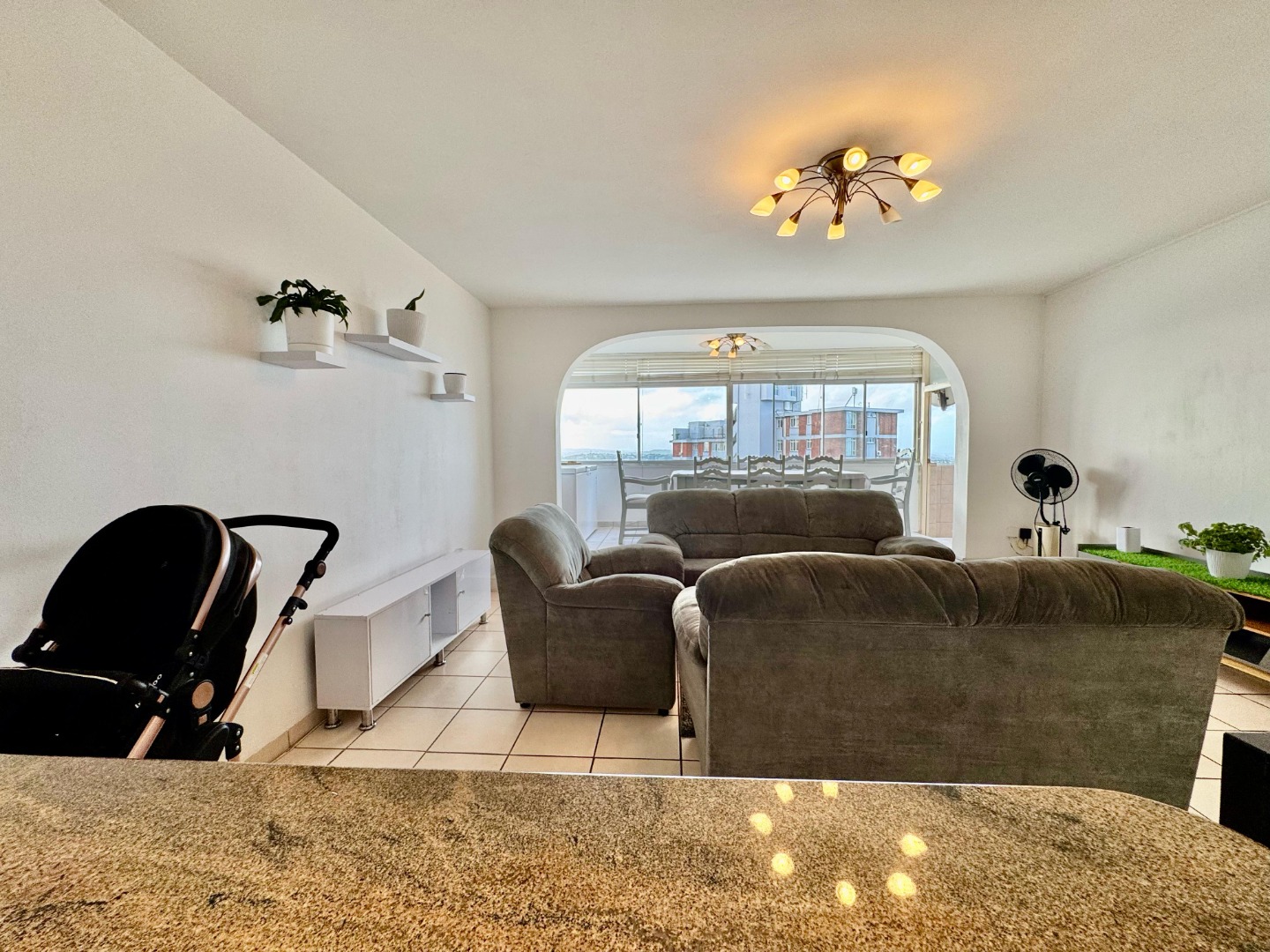 The kitchen is fitted with granite countertops, a built-in stove and oven, and is plumbed for a washing machine—perfectly designed for easy living. The open-plan lounge and dining area is generously proportioned, ideal for entertaining or relaxing, and boasts stunning panoramic views that add a touch of luxury to everyday living.