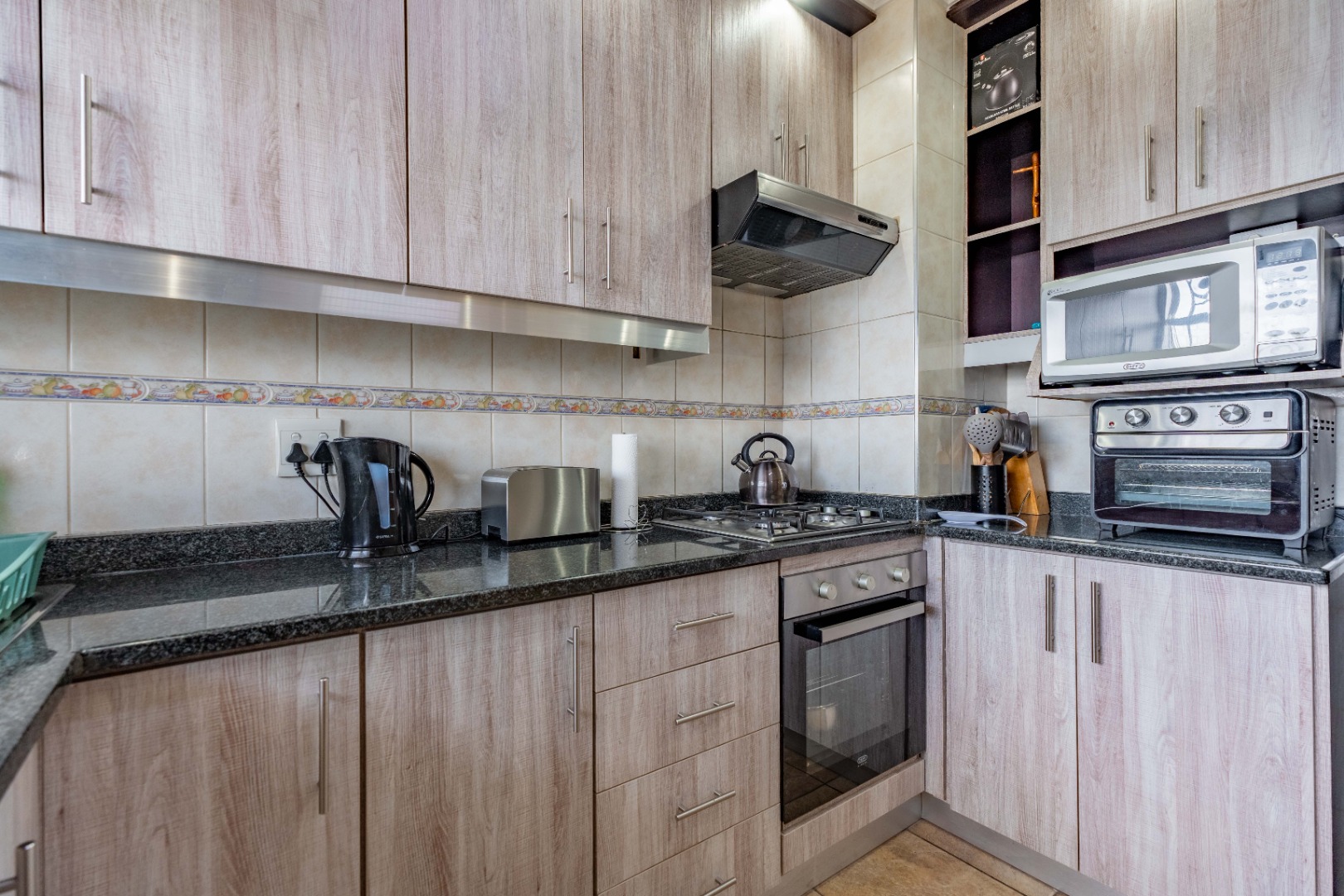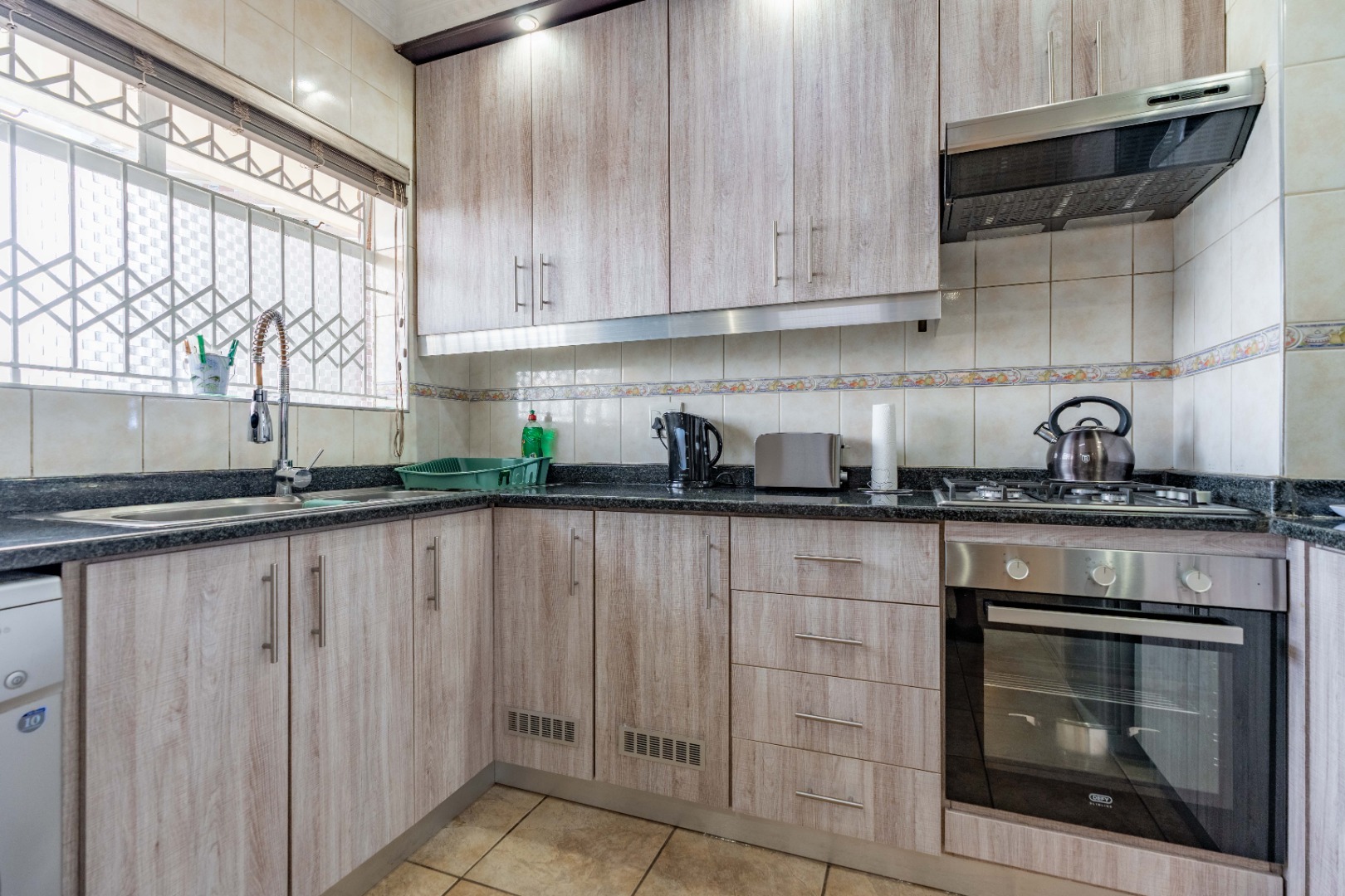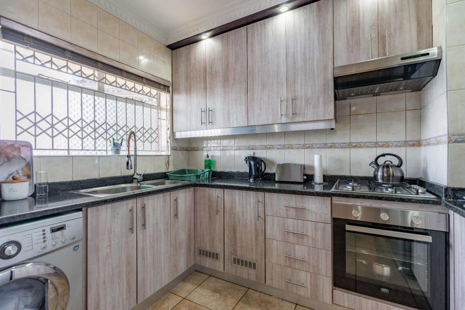 The kitchen is equipped with granite countertops, ample built-in cupboards, a gas stove, under-counter oven, extractor fan, and a double-basin sink. It is also plumbed for a washing machine and features full wall-to-floor tiling.