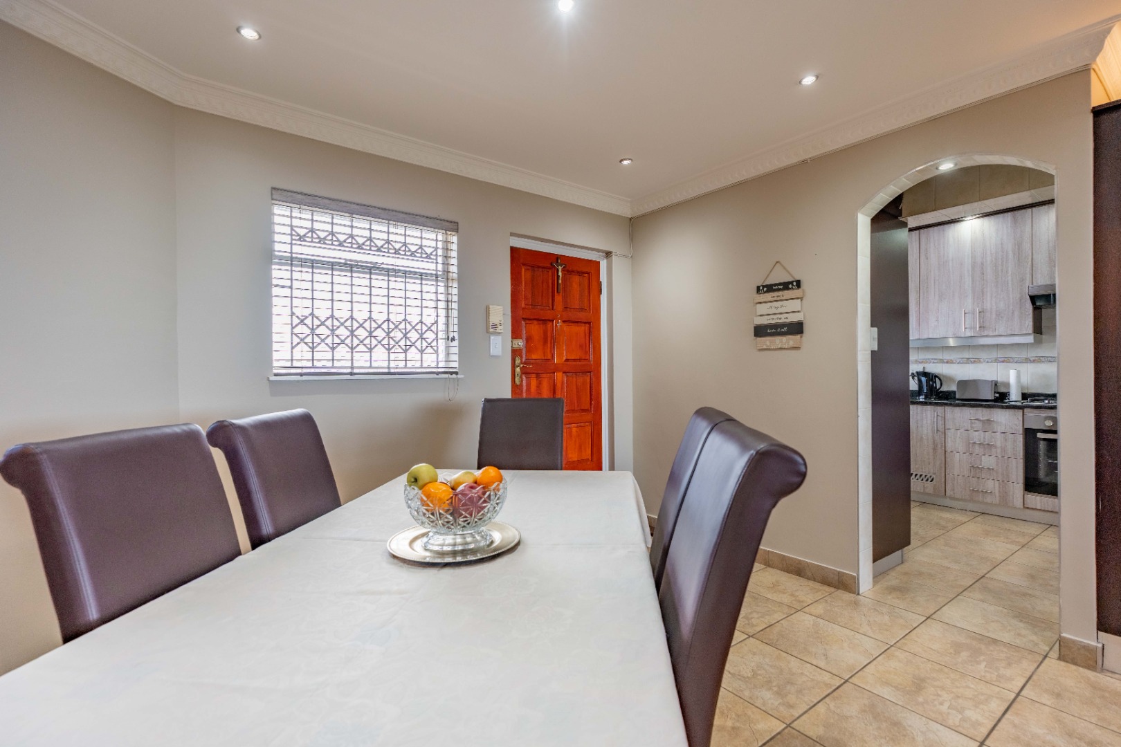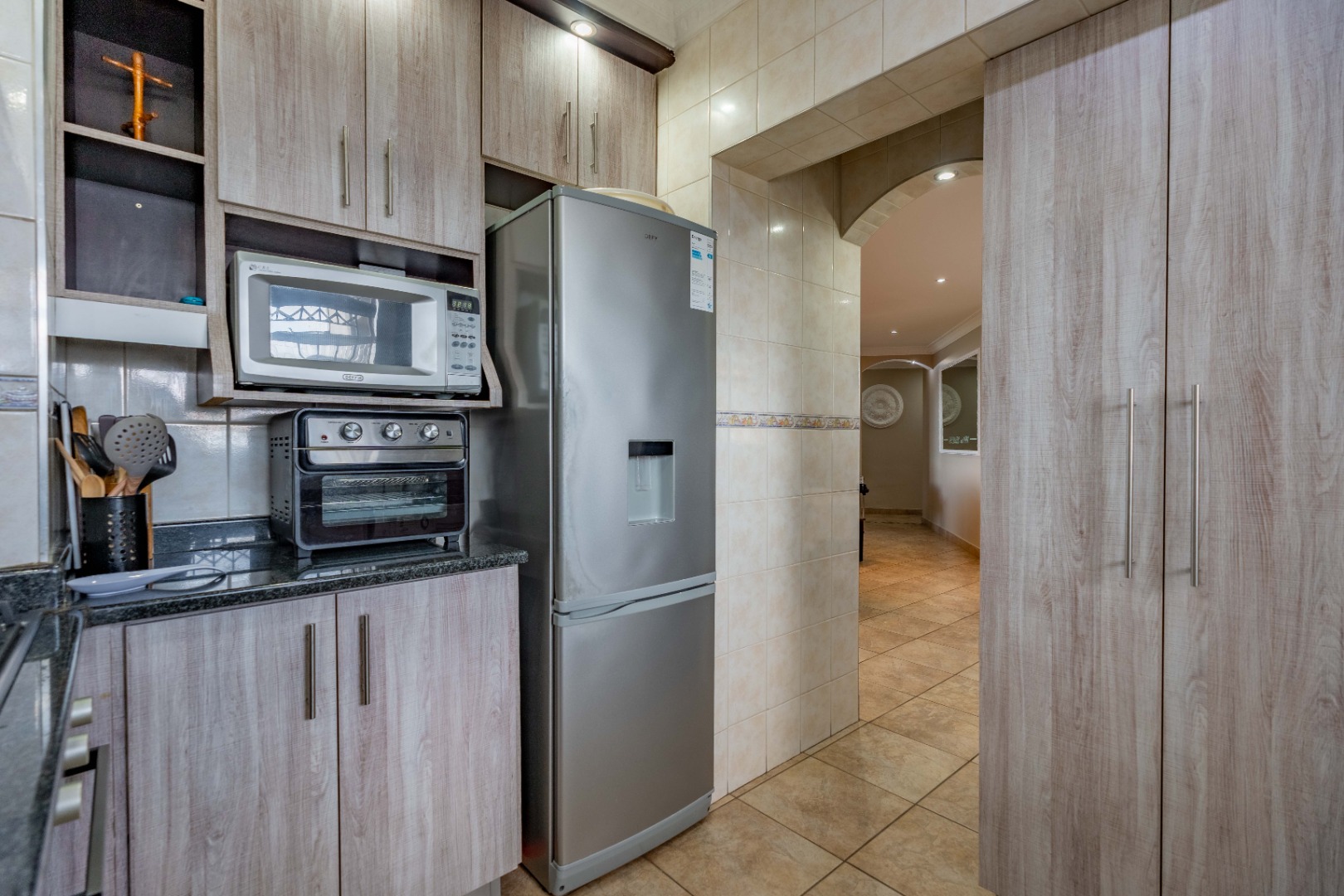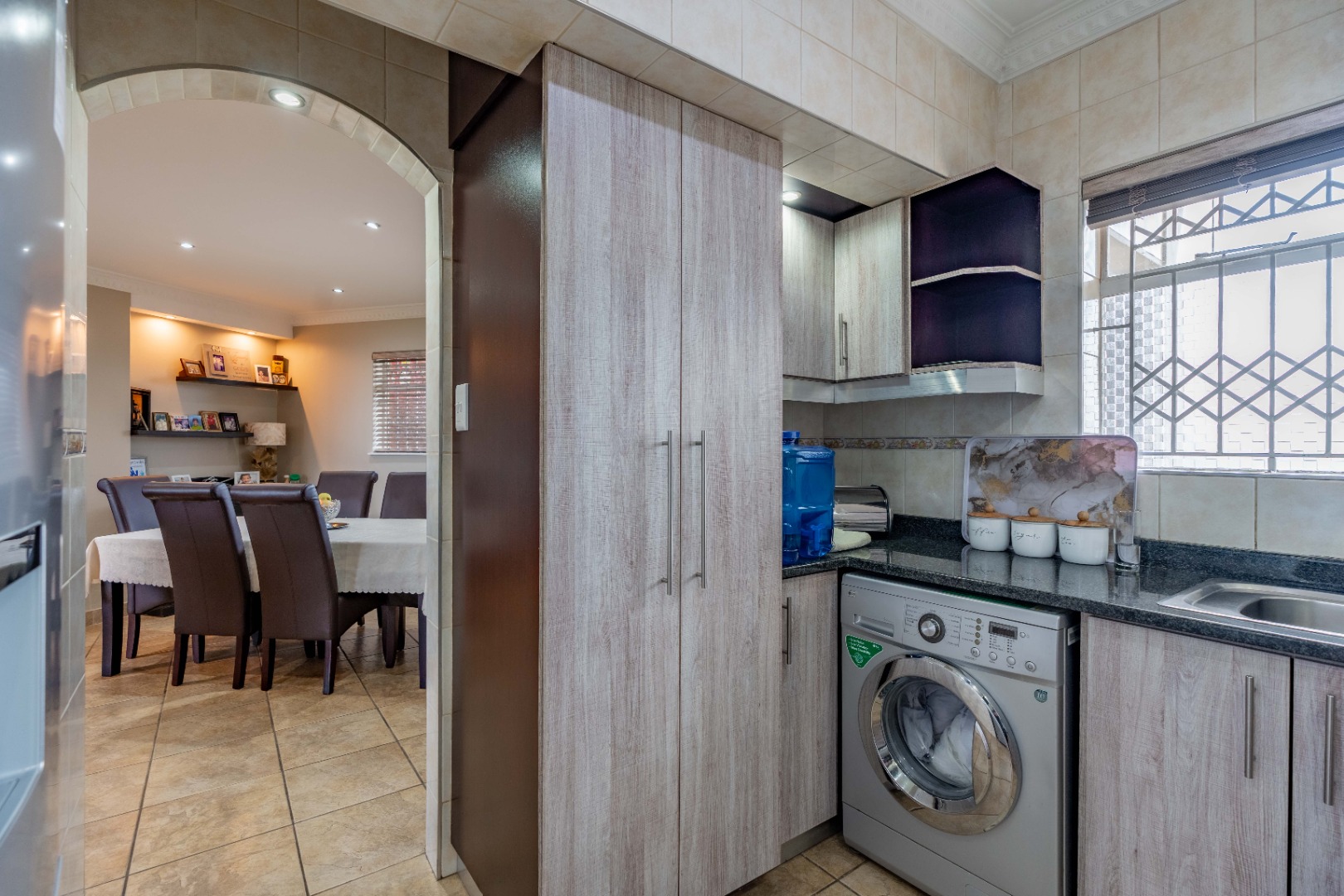 The kitchen is equipped with granite countertops, ample built-in cupboards, a gas stove, under-counter oven, extractor fan, and a double-basin sink. It is also plumbed for a washing machine and features full wall-to-floor tiling.