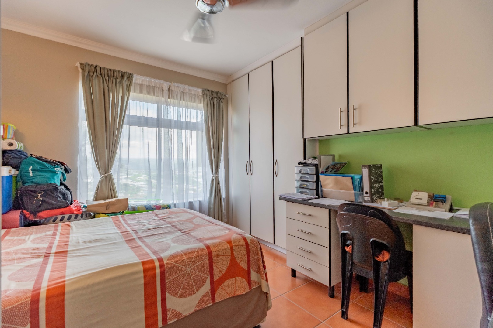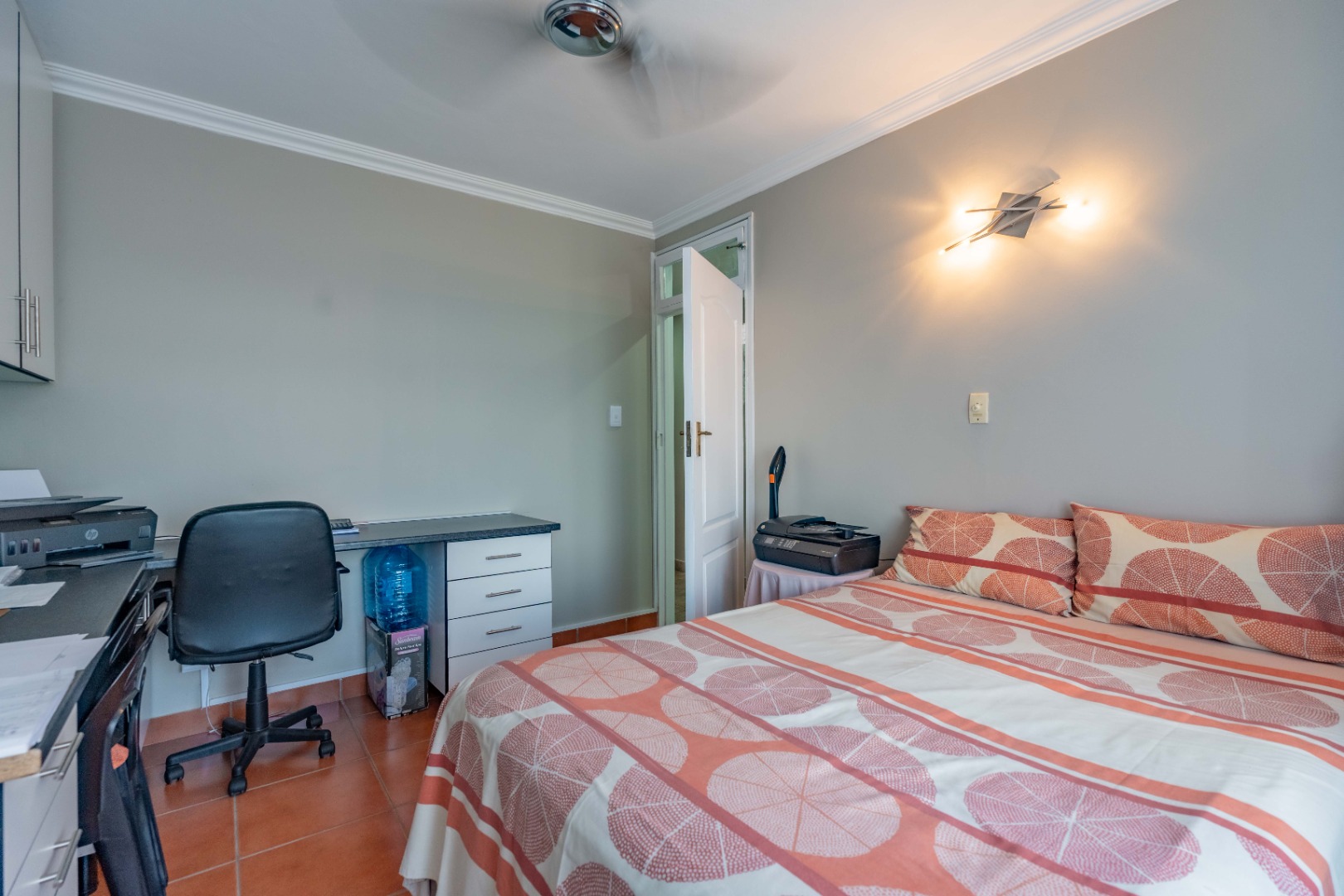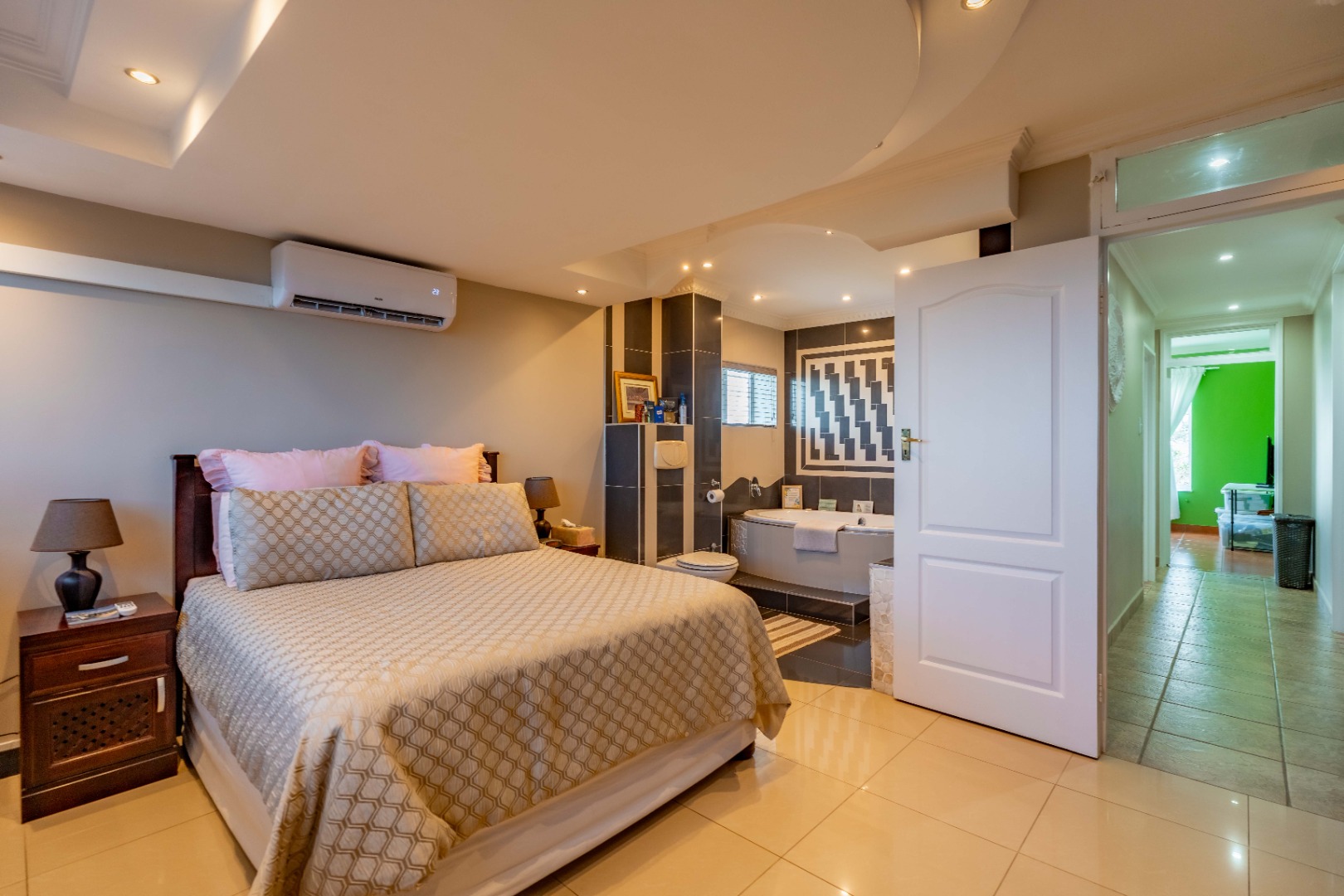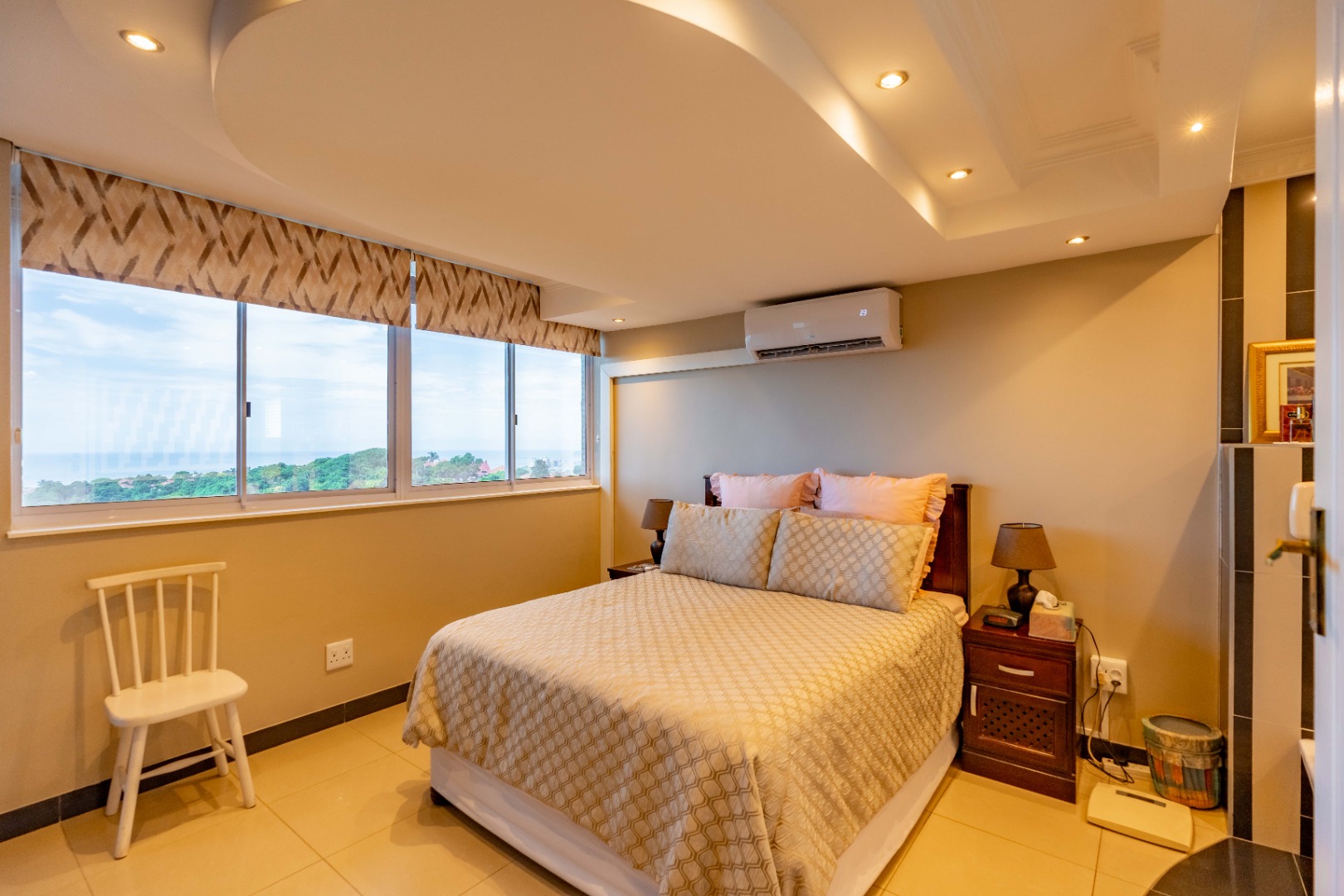 The apartment offers three comfortably sized bedrooms, each with built-in cupboards. The main bedroom includes a bulkhead with additional lighting, as well as an open-plan en-suite with a bath, toilet, basin, and air conditioning. The other two bedrooms are fitted with ceiling fans.