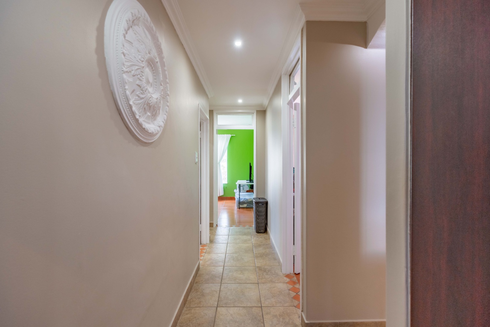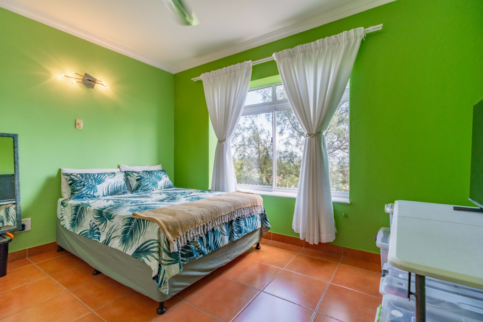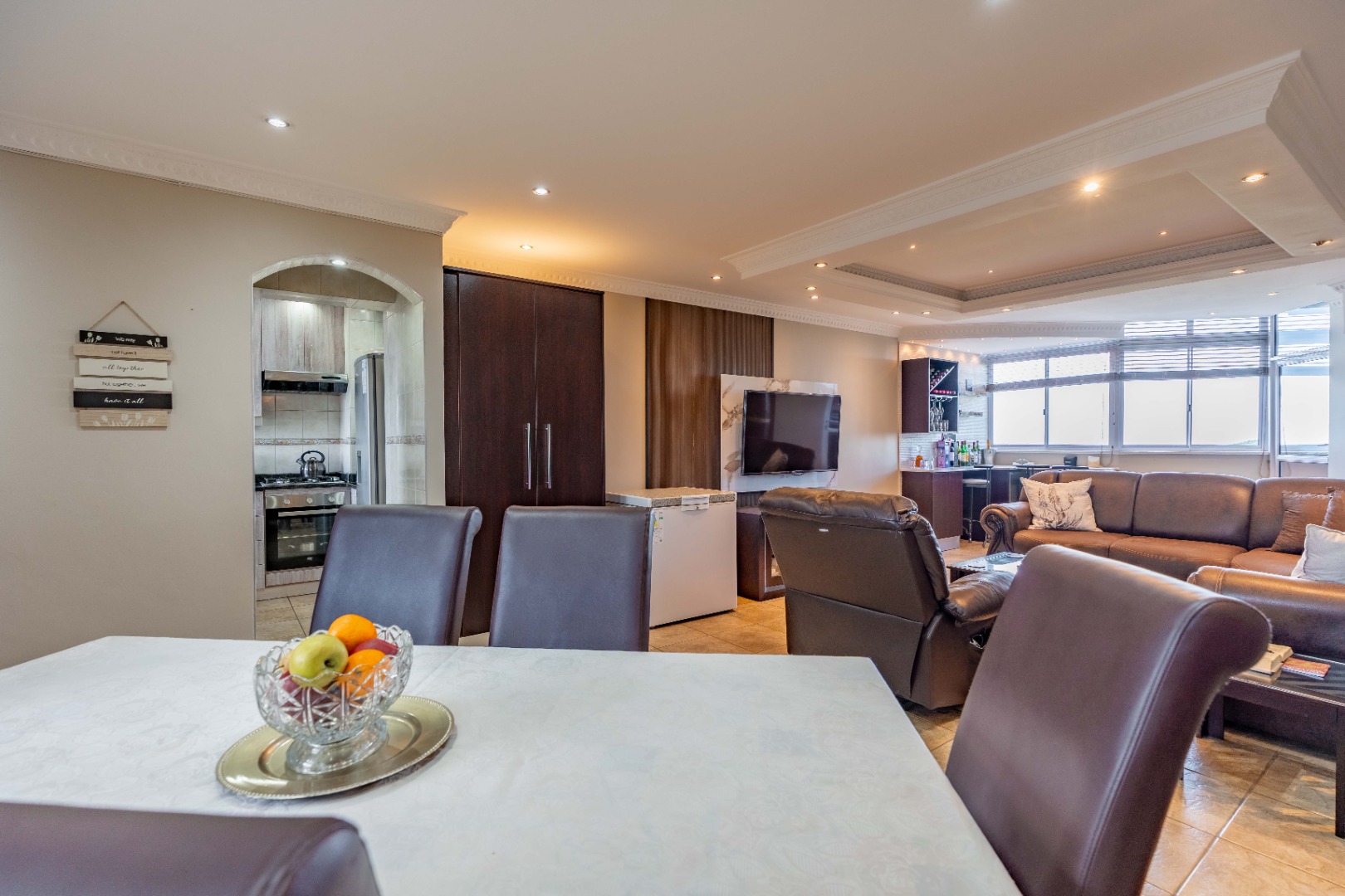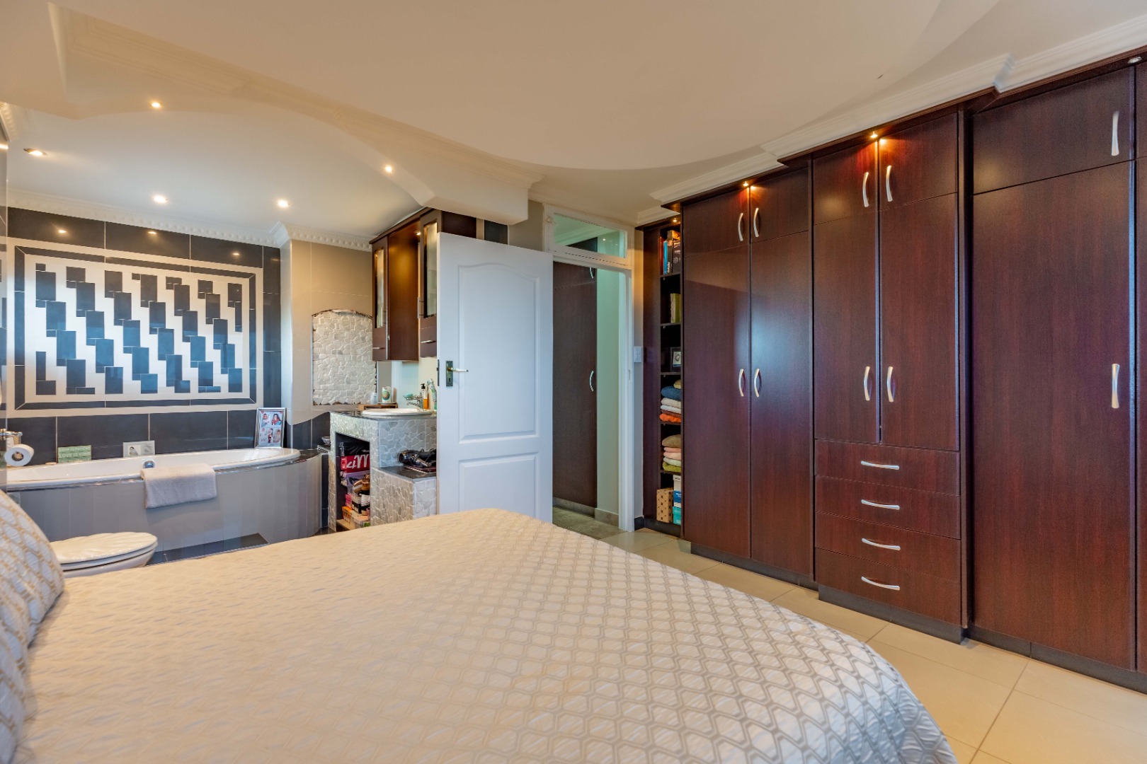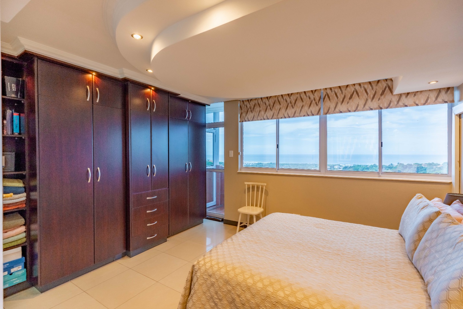 The apartment offers three comfortably sized bedrooms, each with built-in cupboards. The main bedroom includes a bulkhead with additional lighting, as well as an open-plan en-suite with a bath, toilet, basin, and air conditioning. The other two bedrooms are fitted with ceiling fans.