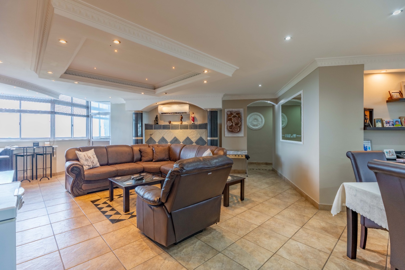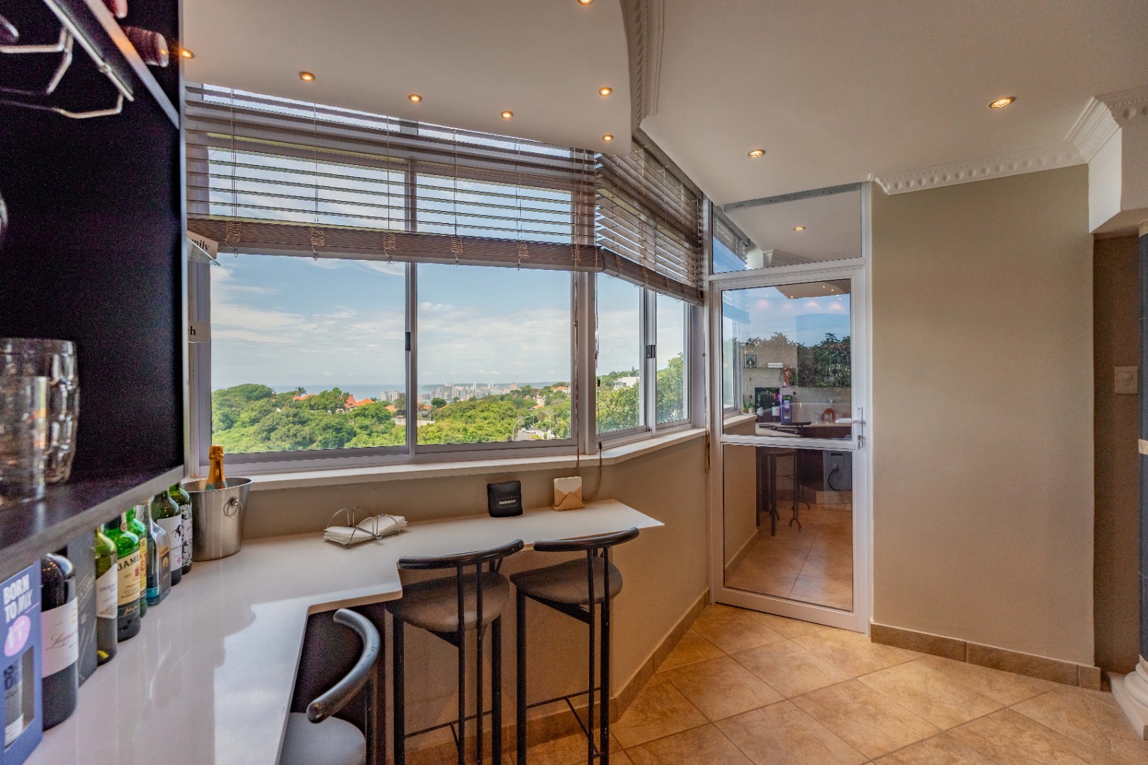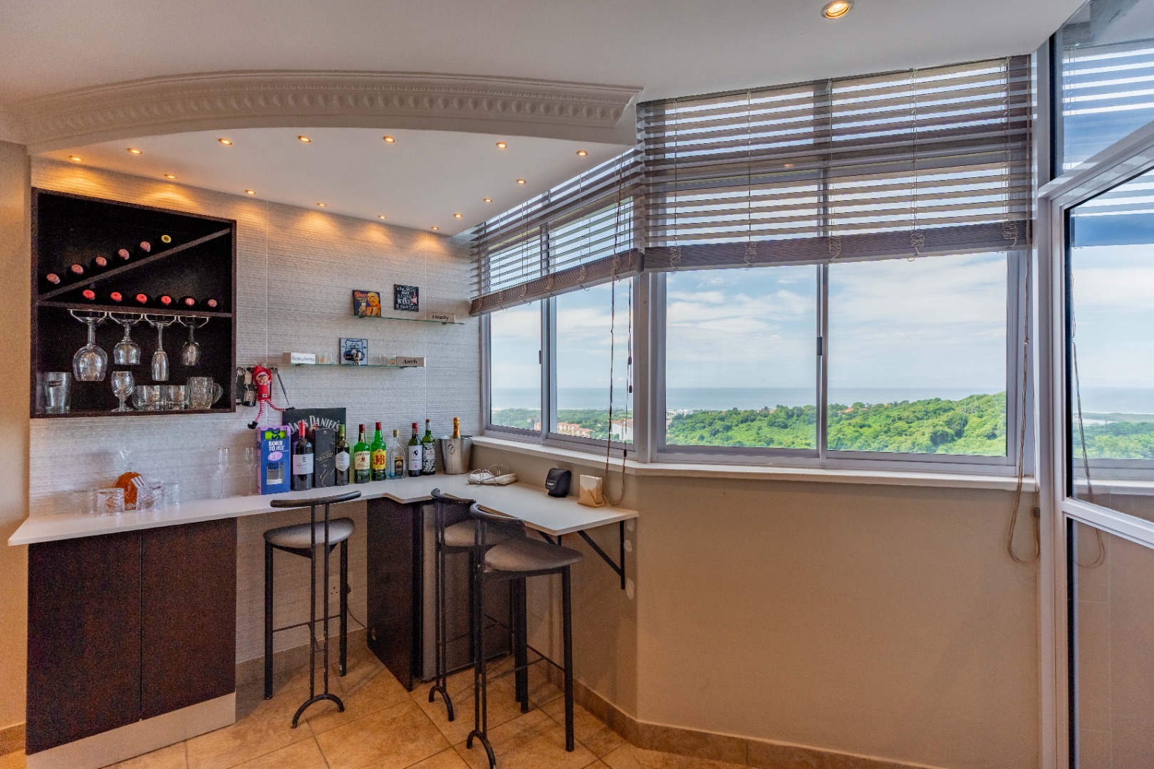 As you enter, you'll find a generous open-plan lounge and dining area, featuring a modern ceiling with a bulkhead, extra downlights, and a built-in bar. The living space opens out onto an undercover veranda, where you can enjoy beautiful sea and city views. Built in water feature on the wall. Aircon. tiled with premium grade porcelain tiles.