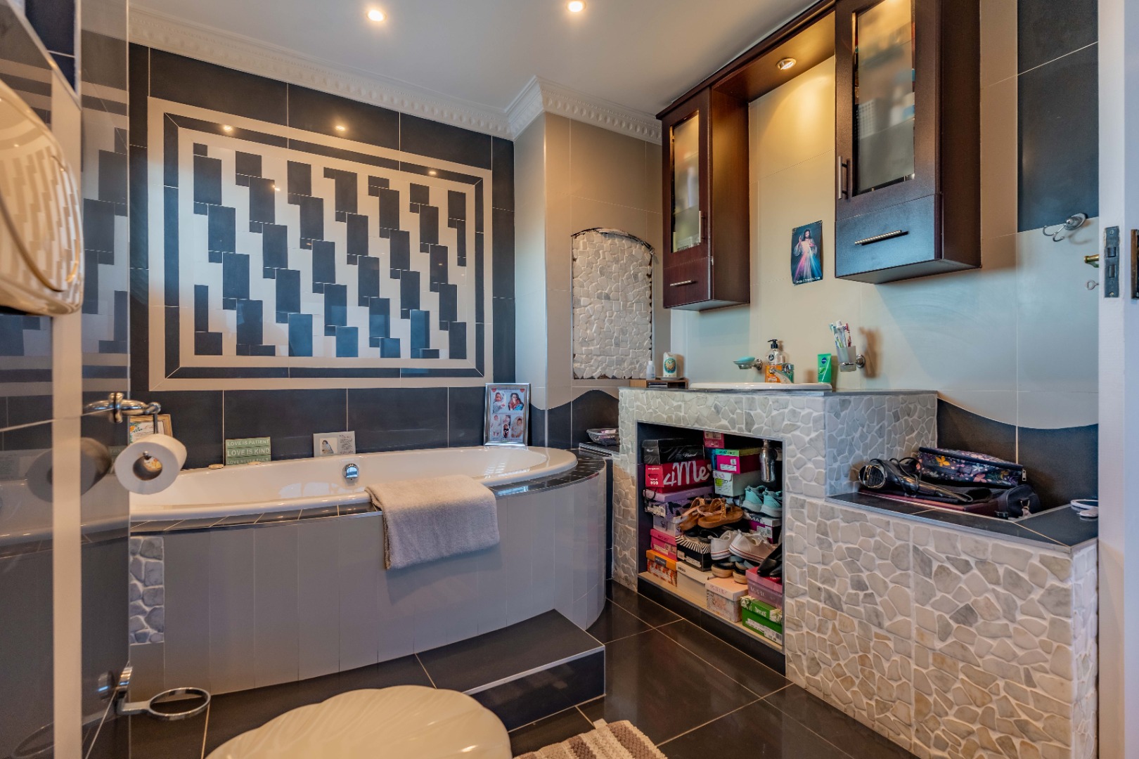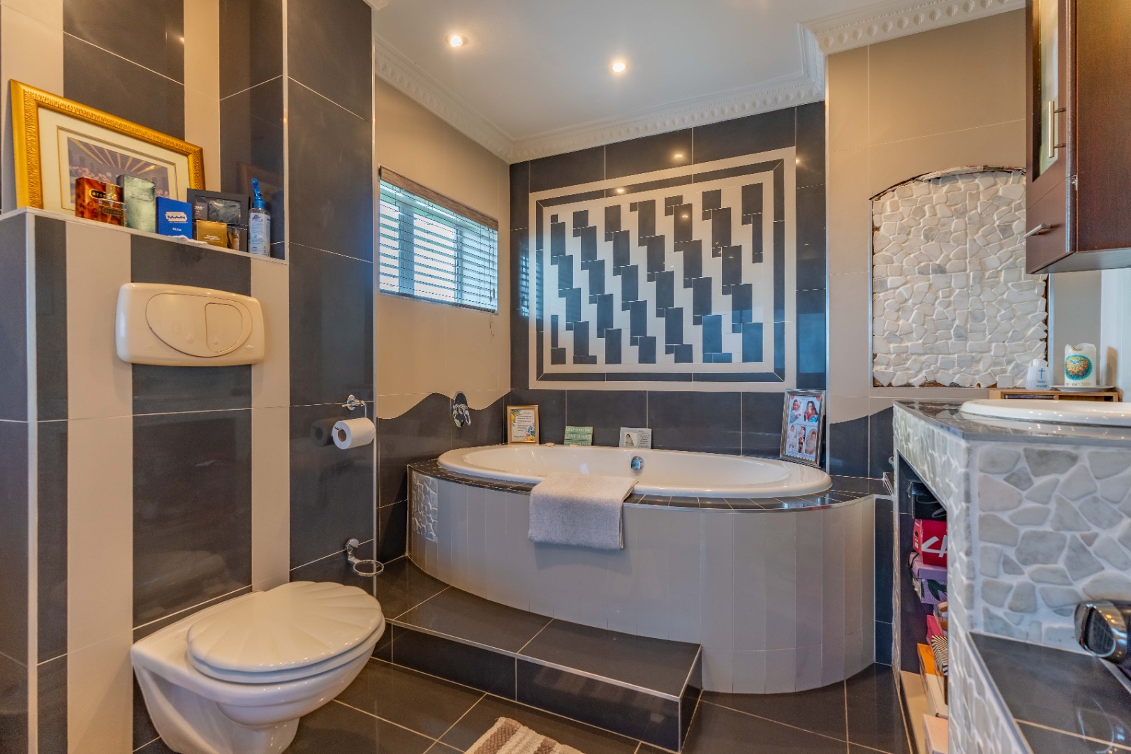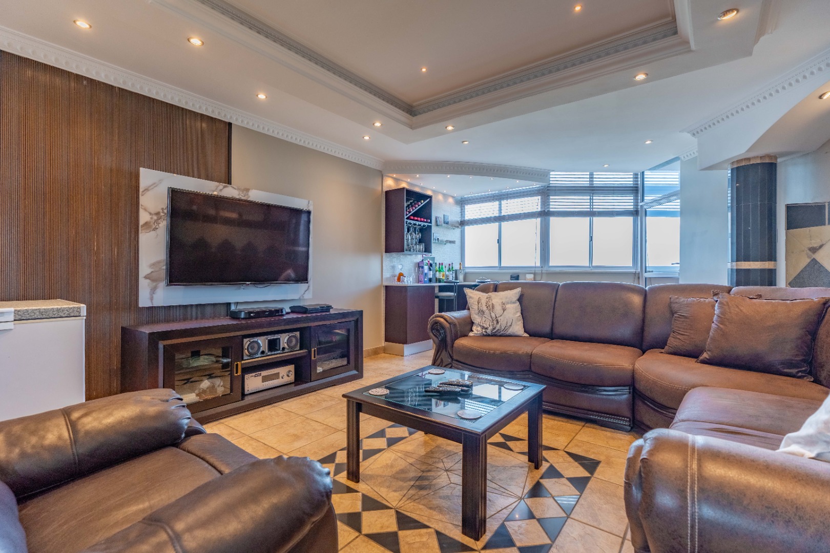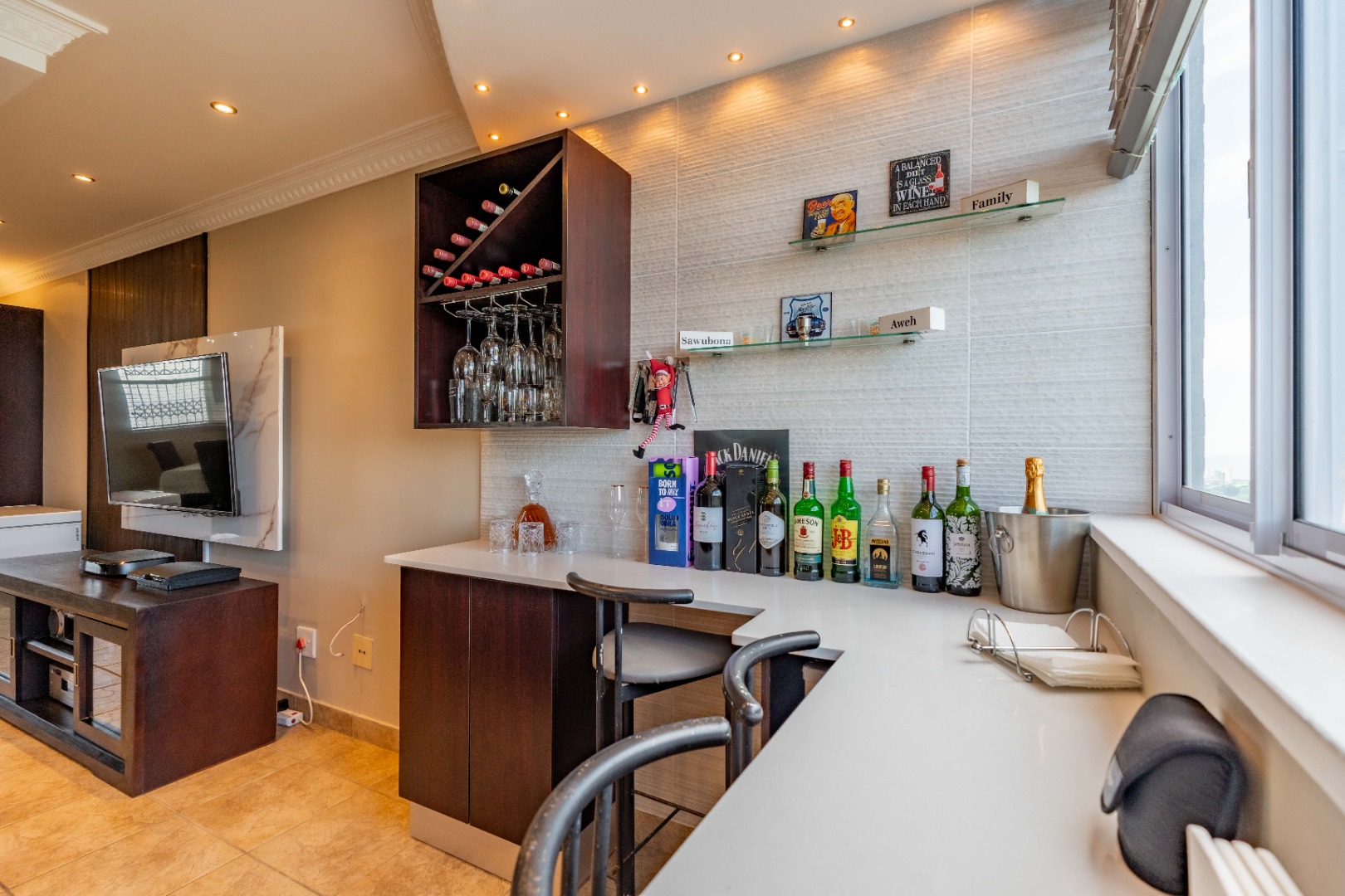 As you enter, you'll find a generous open-plan lounge and dining area, featuring a modern ceiling with a bulkhead, extra downlights, and a built-in bar. The living space opens out onto an undercover veranda, where you can enjoy beautiful sea and city views. Built in water feature on the wall. Aircon. tiled with premium grade porcelain tiles.