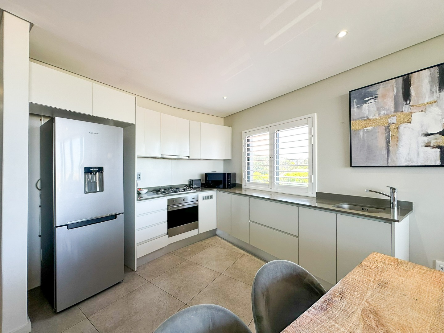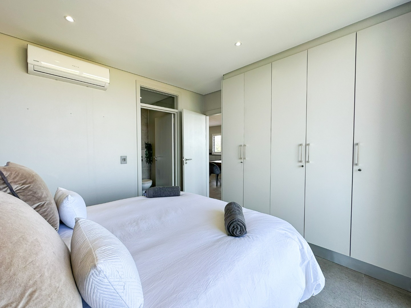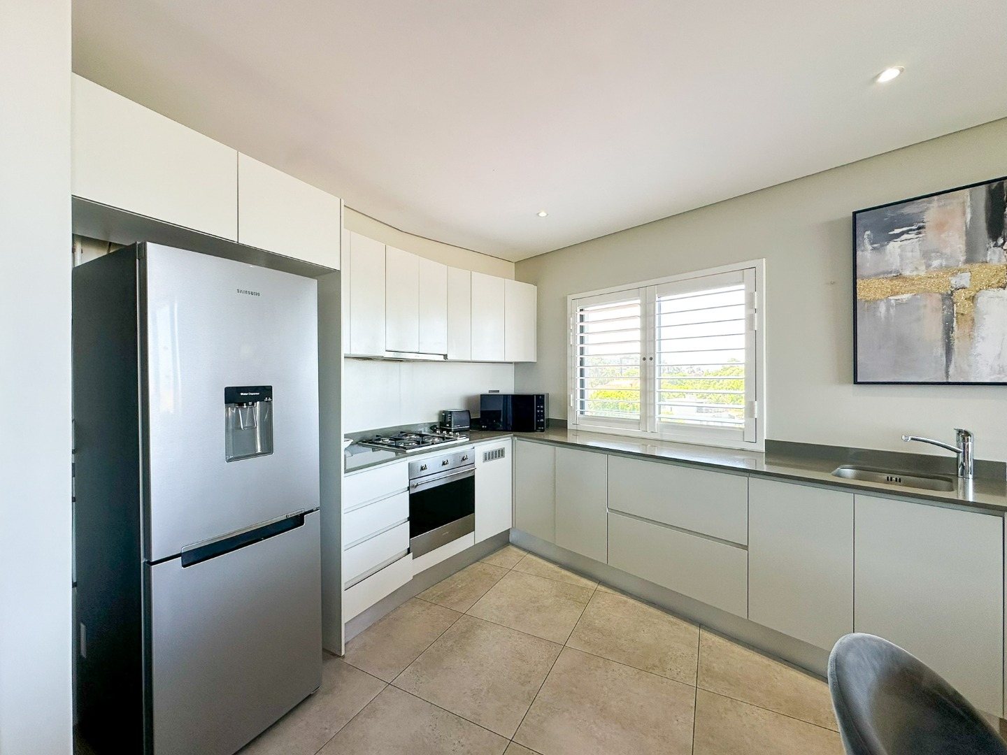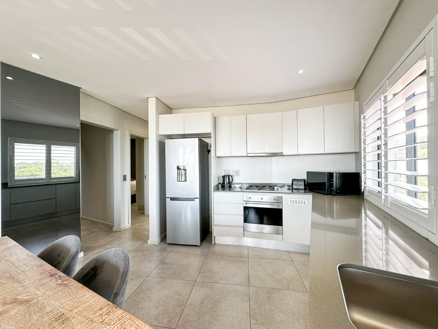 The scullery is plumbed for both a washing machine and dishwasher. There’s also a convenient guest loo with a shower, toilet, and basin. Two of the three bedrooms feature ensuite bathrooms and ample cupboard space, with the main bedroom opening onto the balcony. The third bedroom also includes built-in cupboards. The entire property is elegantly tiled throughout.