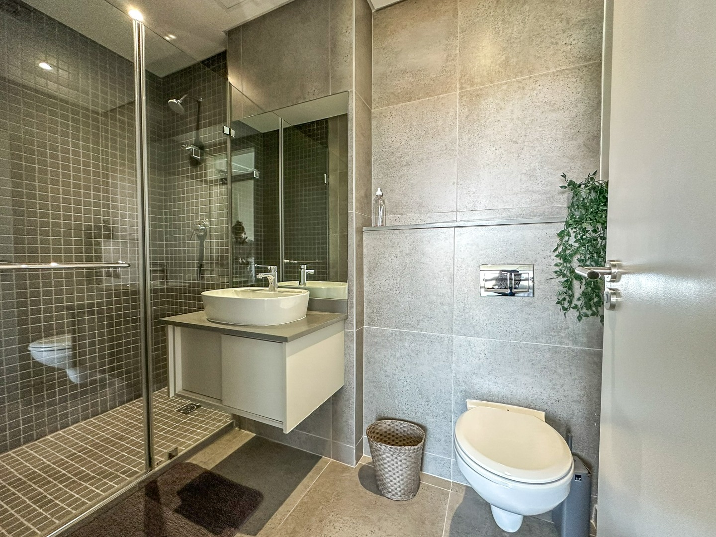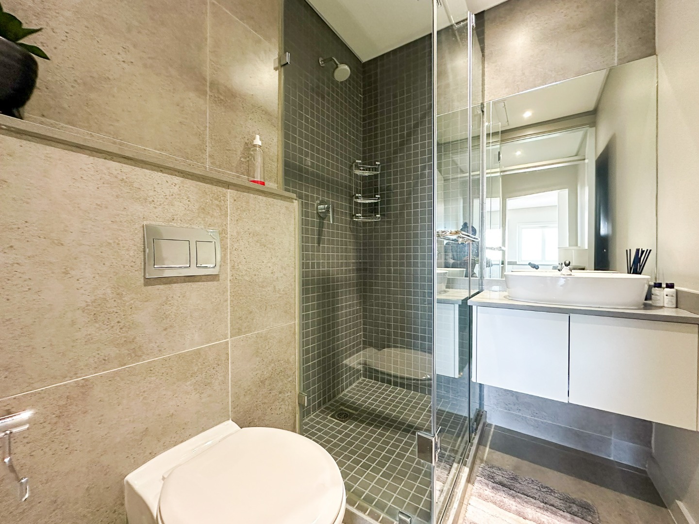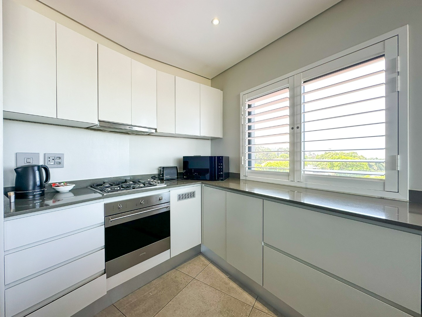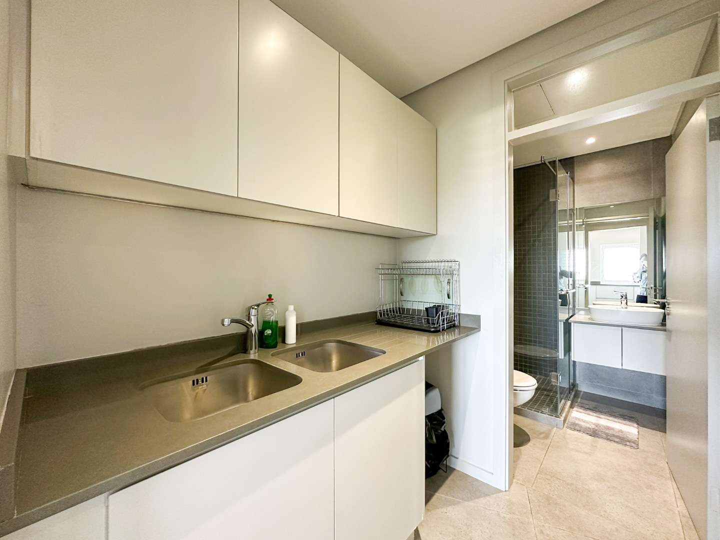 The scullery is plumbed for both a washing machine and dishwasher. There’s also a convenient guest loo with a shower, toilet, and basin. Two of the three bedrooms feature ensuite bathrooms and ample cupboard space, with the main bedroom opening onto the balcony. The third bedroom also includes built-in cupboards. The entire property is elegantly tiled throughout.